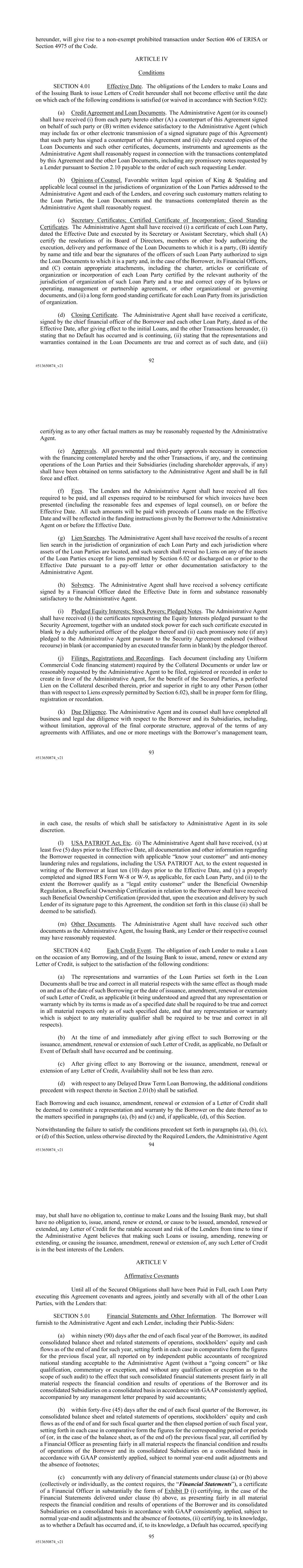 92 #513650874_v21 hereunder, will give rise to a non-exempt prohibited transaction under Section 406 of ERISA or Section 4975 of the Code. ARTICLE IV Conditions SECTION 4.01 Effective Date. The obligations of the Lenders to make Loans and of the Issuing Bank to issue Letters of Credit hereunder shall not become effective until the date on which each of the following conditions is satisfied (or waived in accordance with Section 9.02): (a) Credit Agreement and Loan Documents. The Administrative Agent (or its counsel) shall have received (i) from each party hereto either (A) a counterpart of this Agreement signed on behalf of such party or (B) written evidence satisfactory to the Administrative Agent (which may include fax or other electronic transmission of a signed signature page of this Agreement) that such party has signed a counterpart of this Agreement and (ii) duly executed copies of the Loan Documents and such other certificates, documents, instruments and agreements as the Administrative Agent shall reasonably request in connection with the transactions contemplated by this Agreement and the other Loan Documents, including any promissory notes requested by a Lender pursuant to Section 2.10 payable to the order of each such requesting Lender. (b) Opinions of Counsel. Favorable written legal opinion of King & Spalding and applicable local counsel in the jurisdictions of organization of the Loan Parties addressed to the Administrative Agent and each of the Lenders, and covering such customary matters relating to the Loan Parties, the Loan Documents and the transactions contemplated therein as the Administrative Agent shall reasonably request. (c) Secretary Certificates; Certified Certificate of Incorporation; Good Standing Certificates. The Administrative Agent shall have received (i) a certificate of each Loan Party, dated the Effective Date and executed by its Secretary or Assistant Secretary, which shall (A) certify the resolutions of its Board of Directors, members or other body authorizing the execution, delivery and performance of the Loan Documents to which it is a party, (B) identify by name and title and bear the signatures of the officers of such Loan Party authorized to sign the Loan Documents to which it is a party and, in the case of the Borrower, its Financial Officers, and (C) contain appropriate attachments, including the charter, articles or certificate of organization or incorporation of each Loan Party certified by the relevant authority of the jurisdiction of organization of such Loan Party and a true and correct copy of its bylaws or operating, management or partnership agreement, or other organizational or governing documents, and (ii) a long form good standing certificate for each Loan Party from its jurisdiction of organization. (d) Closing Certificate. The Administrative Agent shall have received a certificate, signed by the chief financial officer of the Borrower and each other Loan Party, dated as of the Effective Date, after giving effect to the initial Loans, and the other Transactions hereunder, (i) stating that no Default has occurred and is continuing, (ii) stating that the representations and warranties contained in the Loan Documents are true and correct as of such date, and (iii) 93 #513650874_v21 certifying as to any other factual matters as may be reasonably requested by the Administrative Agent. (e) Approvals. All governmental and third-party approvals necessary in connection with the financing contemplated hereby and the other Transactions, if any, and the continuing operations of the Loan Parties and their Subsidiaries (including shareholder approvals, if any) shall have been obtained on terms satisfactory to the Administrative Agent and shall be in full force and effect. (f) Fees. The Lenders and the Administrative Agent shall have received all fees required to be paid, and all expenses required to be reimbursed for which invoices have been presented (including the reasonable fees and expenses of legal counsel), on or before the Effective Date. All such amounts will be paid with proceeds of Loans made on the Effective Date and will be reflected in the funding instructions given by the Borrower to the Administrative Agent on or before the Effective Date. (g) Lien Searches. The Administrative Agent shall have received the results of a recent lien search in the jurisdiction of organization of each Loan Party and each jurisdiction where assets of the Loan Parties are located, and such search shall reveal no Liens on any of the assets of the Loan Parties except for liens permitted by Section 6.02 or discharged on or prior to the Effective Date pursuant to a pay-off letter or other documentation satisfactory to the Administrative Agent. (h) Solvency. The Administrative Agent shall have received a solvency certificate signed by a Financial Officer dated the Effective Date in form and substance reasonably satisfactory to the Administrative Agent. (i) Pledged Equity Interests; Stock Powers; Pledged Notes. The Administrative Agent shall have received (i) the certificates representing the Equity Interests pledged pursuant to the Security Agreement, together with an undated stock power for each such certificate executed in blank by a duly authorized officer of the pledgor thereof and (ii) each promissory note (if any) pledged to the Administrative Agent pursuant to the Security Agreement endorsed (without recourse) in blank (or accompanied by an executed transfer form in blank) by the pledgor thereof. (j) Filings, Registrations and Recordings. Each document (including any Uniform Commercial Code financing statement) required by the Collateral Documents or under law or reasonably requested by the Administrative Agent to be filed, registered or recorded in order to create in favor of the Administrative Agent, for the benefit of the Secured Parties, a perfected Lien on the Collateral described therein, prior and superior in right to any other Person (other th