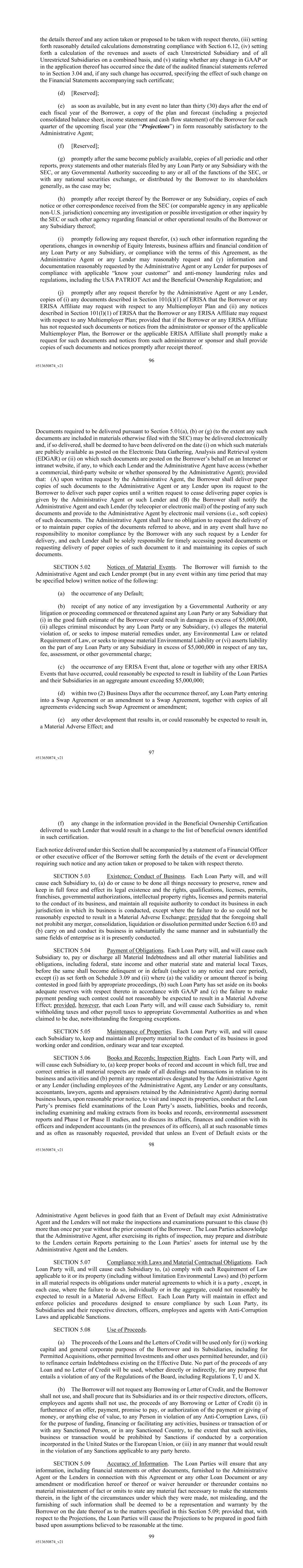 96 #513650874_v21 the details thereof and any action taken or proposed to be taken with respect thereto, (iii) setting forth reasonably detailed calculations demonstrating compliance with Section 6.12, (iv) setting forth a calculation of the revenues and assets of each Unrestricted Subsidiary and of all Unrestricted Subsidiaries on a combined basis, and (v) stating whether any change in GAAP or in the application thereof has occurred since the date of the audited financial statements referred to in Section 3.04 and, if any such change has occurred, specifying the effect of such change on the Financial Statements accompanying such certificate; (d) [Reserved]; (e) as soon as available, but in any event no later than thirty (30) days after the end of each fiscal year of the Borrower, a copy of the plan and forecast (including a projected consolidated balance sheet, income statement and cash flow statement) of the Borrower for each quarter of the upcoming fiscal year (the “Projections”) in form reasonably satisfactory to the Administrative Agent; (f) [Reserved]; (g) promptly after the same become publicly available, copies of all periodic and other reports, proxy statements and other materials filed by any Loan Party or any Subsidiary with the SEC, or any Governmental Authority succeeding to any or all of the functions of the SEC, or with any national securities exchange, or distributed by the Borrower to its shareholders generally, as the case may be; (h) promptly after receipt thereof by the Borrower or any Subsidiary, copies of each notice or other correspondence received from the SEC (or comparable agency in any applicable non-U.S. jurisdiction) concerning any investigation or possible investigation or other inquiry by the SEC or such other agency regarding financial or other operational results of the Borrower or any Subsidiary thereof; (i) promptly following any request therefor, (x) such other information regarding the operations, changes in ownership of Equity Interests, business affairs and financial condition of any Loan Party or any Subsidiary, or compliance with the terms of this Agreement, as the Administrative Agent or any Lender may reasonably request and (y) information and documentation reasonably requested by the Administrative Agent or any Lender for purposes of compliance with applicable “know your customer” and anti-money laundering rules and regulations, including the USA PATRIOT Act and the Beneficial Ownership Regulation; and (j) promptly after any request therefor by the Administrative Agent or any Lender, copies of (i) any documents described in Section 101(k)(1) of ERISA that the Borrower or any ERISA Affiliate may request with respect to any Multiemployer Plan and (ii) any notices described in Section 101(l)(1) of ERISA that the Borrower or any ERISA Affiliate may request with respect to any Multiemployer Plan; provided that if the Borrower or any ERISA Affiliate has not requested such documents or notices from the administrator or sponsor of the applicable Multiemployer Plan, the Borrower or the applicable ERISA Affiliate shall promptly make a request for such documents and notices from such administrator or sponsor and shall provide copies of such documents and notices promptly after receipt thereof. 97 #513650874_v21 Documents required to be delivered pursuant to Section 5.01(a), (b) or (g) (to the extent any such documents are included in materials otherwise filed with the SEC) may be delivered electronically and, if so delivered, shall be deemed to have been delivered on the date (i) on which such materials are publicly available as posted on the Electronic Data Gathering, Analysis and Retrieval system (EDGAR) or (ii) on which such documents are posted on the Borrower’s behalf on an Internet or intranet website, if any, to which each Lender and the Administrative Agent have access (whether a commercial, third-party website or whether sponsored by the Administrative Agent); provided that: (A) upon written request by the Administrative Agent, the Borrower shall deliver paper copies of such documents to the Administrative Agent or any Lender upon its request to the Borrower to deliver such paper copies until a written request to cease delivering paper copies is given by the Administrative Agent or such Lender and (B) the Borrower shall notify the Administrative Agent and each Lender (by telecopier or electronic mail) of the posting of any such documents and provide to the Administrative Agent by electronic mail versions (i.e., soft copies) of such documents. The Administrative Agent shall have no obligation to request the delivery of or to maintain paper copies of the documents referred to above, and in any event shall have no responsibility to monitor compliance by the Borrower with any such request by a Lender for delivery, and each Lender shall be solely responsible for timely accessing posted documents or requesting delivery of paper copies of such document to it and maintaining its copies of such documents. SECTION 5.02 Notices of Material Events. The Borrower will furnish to the Administrative Agent and each Lender prompt (but in any event within any time period that may be specified below) written notice of the following: (a) the occurrence of any Default; (b) receipt of any notice of any investigation by a Governmental Authority or any litigation or proceeding commenced or threatened against any Loan Party or any Subsidiary that (i) in the good faith estimate of the Borrower could result in damages in excess of $5,000,000, (ii) alleges criminal misconduct by any Loan Party or any Subsidiary, (v) alleges the material violation of, or seeks to impose material remedies under, any Environmental Law or related Requirement of Law, or seeks to impose material Environmental Liability or (vi) asserts liability on the part of any Loan Party or any Subsidiary in excess of $5,000,000 in respect of any tax, fee, assessment, or other governmental charge; (c)