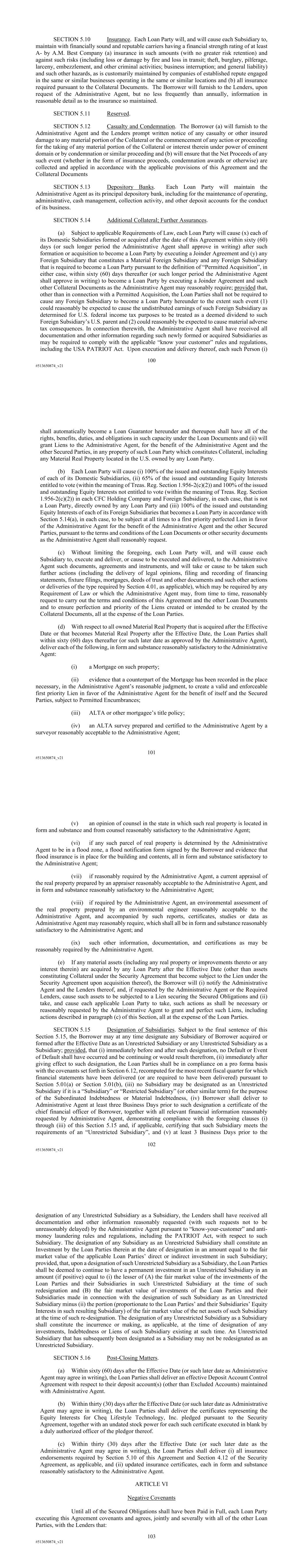100 #513650874_v21 SECTION 5.10 Insurance. Each Loan Party will, and will cause each Subsidiary to, maintain with financially sound and reputable carriers having a financial strength rating of at least A- by A.M. Best Company (a) insurance in such amounts (with no greater risk retention) and against such risks (including loss or damage by fire and loss in transit; theft, burglary, pilferage, larceny, embezzlement, and other criminal activities; business interruption; and general liability) and such other hazards, as is customarily maintained by companies of established repute engaged in the same or similar businesses operating in the same or similar locations and (b) all insurance required pursuant to the Collateral Documents. The Borrower will furnish to the Lenders, upon request of the Administrative Agent, but no less frequently than annually, information in reasonable detail as to the insurance so maintained. SECTION 5.11 Reserved. SECTION 5.12 Casualty and Condemnation. The Borrower (a) will furnish to the Administrative Agent and the Lenders prompt written notice of any casualty or other insured damage to any material portion of the Collateral or the commencement of any action or proceeding for the taking of any material portion of the Collateral or interest therein under power of eminent domain or by condemnation or similar proceeding and (b) will ensure that the Net Proceeds of any such event (whether in the form of insurance proceeds, condemnation awards or otherwise) are collected and applied in accordance with the applicable provisions of this Agreement and the Collateral Documents SECTION 5.13 Depository Banks. Each Loan Party will maintain the Administrative Agent as its principal depository bank, including for the maintenance of operating, administrative, cash management, collection activity, and other deposit accounts for the conduct of its business. SECTION 5.14 Additional Collateral; Further Assurances. (a) Subject to applicable Requirements of Law, each Loan Party will cause (x) each of its Domestic Subsidiaries formed or acquired after the date of this Agreement within sixty (60) days (or such longer period the Administrative Agent shall approve in writing) after such formation or acquisition to become a Loan Party by executing a Joinder Agreement and (y) any Foreign Subsidiary that constitutes a Material Foreign Subsidiary and any Foreign Subsidiary that is required to become a Loan Party pursuant to the definition of “Permitted Acquisition”, in either case, within sixty (60) days thereafter (or such longer period the Administrative Agent shall approve in writing) to become a Loan Party by executing a Joinder Agreement and such other Collateral Documents as the Administrative Agent may reasonably require; provided that, other than in connection with a Permitted Acquisition, the Loan Parties shall not be required to cause any Foreign Subsidiary to become a Loan Party hereunder to the extent such event (1) could reasonably be expected to cause the undistributed earnings of such Foreign Subsidiary as determined for U.S. federal income tax purposes to be treated as a deemed dividend to such Foreign Subsidiary’s U.S. parent and (2) could reasonably be expected to cause material adverse tax consequences. In connection therewith, the Administrative Agent shall have received all documentation and other information regarding such newly formed or acquired Subsidiaries as may be required to comply with the applicable “know your customer” rules and regulations, including the USA PATRIOT Act. Upon execution and delivery thereof, each such Person (i) 101 #513650874_v21 shall automatically become a Loan Guarantor hereunder and thereupon shall have all of the rights, benefits, duties, and obligations in such capacity under the Loan Documents and (ii) will grant Liens to the Administrative Agent, for the benefit of the Administrative Agent and the other Secured Parties, in any property of such Loan Party which constitutes Collateral, including any Material Real Property located in the U.S. owned by any Loan Party. (b) Each Loan Party will cause (i) 100% of the issued and outstanding Equity Interests of each of its Domestic Subsidiaries, (ii) 65% of the issued and outstanding Equity Interests entitled to vote (within the meaning of Treas. Reg. Section 1.956-2(c)(2)) and 100% of the issued and outstanding Equity Interests not entitled to vote (within the meaning of Treas. Reg. Section 1.956-2(c)(2)) in each CFC Holding Company and Foreign Subsidiary, in each case, that is not a Loan Party, directly owned by any Loan Party and (iii) 100% of the issued and outstanding Equity Interests of each of its Foreign Subsidiaries that becomes a Loan Party in accordance with Section 5.14(a), in each case, to be subject at all times to a first priority perfected Lien in favor of the Administrative Agent for the benefit of the Administrative Agent and the other Secured Parties, pursuant to the terms and conditions of the Loan Documents or other security documents as the Administrative Agent shall reasonably request. (c) Without limiting the foregoing, each Loan Party will, and will cause each Subsidiary to, execute and deliver, or cause to be executed and delivered, to the Administrative Agent such documents, agreements and instruments, and will take or cause to be taken such further actions (including the delivery of legal opinions, filing and recording of financing statements, fixture filings, mortgages, deeds of trust and other documents and such other actions or deliveries of the type required by Section 4.01, as applicable), which may be required by any Requirement of Law or which the Administrative Agent may, from time to time, reasonably request to carry out the terms and conditions of this Agreement and the other Loan Documents and to ensure perfection and priority of the Liens created or intended to be created by the Collateral Documents, all at the expense of the Loan Parties. (d) 