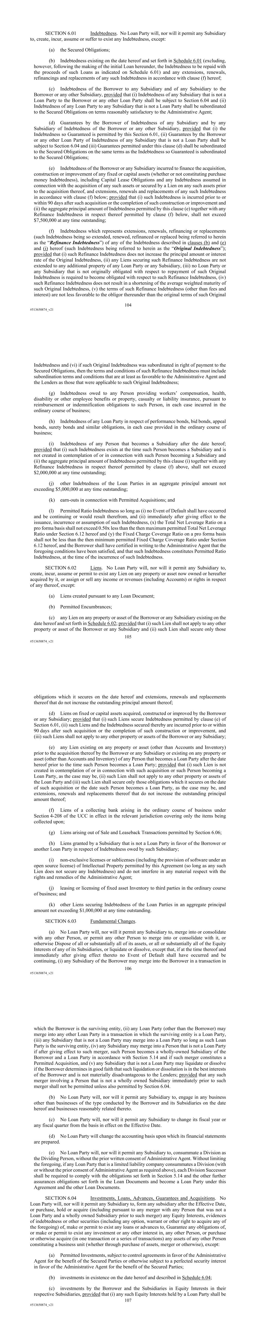 104 #513650874_v21 SECTION 6.01 Indebtedness. No Loan Party will, nor will it permit any Subsidiary to, create, incur, assume or suffer to exist any Indebtedness, except: (a) the Secured Obligations; (b) Indebtedness existing on the date hereof and set forth in Schedule 6.01 (excluding, however, following the making of the initial Loan hereunder, the Indebtedness to be repaid with the proceeds of such Loans as indicated on Schedule 6.01) and any extensions, renewals, refinancings and replacements of any such Indebtedness in accordance with clause (f) hereof; (c) Indebtedness of the Borrower to any Subsidiary and of any Subsidiary to the Borrower or any other Subsidiary, provided that (i) Indebtedness of any Subsidiary that is not a Loan Party to the Borrower or any other Loan Party shall be subject to Section 6.04 and (ii) Indebtedness of any Loan Party to any Subsidiary that is not a Loan Party shall be subordinated to the Secured Obligations on terms reasonably satisfactory to the Administrative Agent; (d) Guarantees by the Borrower of Indebtedness of any Subsidiary and by any Subsidiary of Indebtedness of the Borrower or any other Subsidiary, provided that (i) the Indebtedness so Guaranteed is permitted by this Section 6.01, (ii) Guarantees by the Borrower or any other Loan Party of Indebtedness of any Subsidiary that is not a Loan Party shall be subject to Section 6.04 and (iii) Guarantees permitted under this clause (d) shall be subordinated to the Secured Obligations on the same terms as the Indebtedness so Guaranteed is subordinated to the Secured Obligations; (e) Indebtedness of the Borrower or any Subsidiary incurred to finance the acquisition, construction or improvement of any fixed or capital assets (whether or not constituting purchase money Indebtedness), including Capital Lease Obligations and any Indebtedness assumed in connection with the acquisition of any such assets or secured by a Lien on any such assets prior to the acquisition thereof, and extensions, renewals and replacements of any such Indebtedness in accordance with clause (f) below; provided that (i) such Indebtedness is incurred prior to or within 90 days after such acquisition or the completion of such construction or improvement and (ii) the aggregate principal amount of Indebtedness permitted by this clause (e) together with any Refinance Indebtedness in respect thereof permitted by clause (f) below, shall not exceed $7,500,000 at any time outstanding; (f) Indebtedness which represents extensions, renewals, refinancing or replacements (such Indebtedness being so extended, renewed, refinanced or replaced being referred to herein as the “Refinance Indebtedness”) of any of the Indebtedness described in clauses (b) and (e) and (i) hereof (such Indebtedness being referred to herein as the “Original Indebtedness”); provided that (i) such Refinance Indebtedness does not increase the principal amount or interest rate of the Original Indebtedness, (ii) any Liens securing such Refinance Indebtedness are not extended to any additional property of any Loan Party or any Subsidiary, (iii) no Loan Party or any Subsidiary that is not originally obligated with respect to repayment of such Original Indebtedness is required to become obligated with respect to such Refinance Indebtedness, (iv) such Refinance Indebtedness does not result in a shortening of the average weighted maturity of such Original Indebtedness, (v) the terms of such Refinance Indebtedness (other than fees and interest) are not less favorable to the obligor thereunder than the original terms of such Original 105 #513650874_v21 Indebtedness and (vi) if such Original Indebtedness was subordinated in right of payment to the Secured Obligations, then the terms and conditions of such Refinance Indebtedness must include subordination terms and conditions that are at least as favorable to the Administrative Agent and the Lenders as those that were applicable to such Original Indebtedness; (g) Indebtedness owed to any Person providing workers’ compensation, health, disability or other employee benefits or property, casualty or liability insurance, pursuant to reimbursement or indemnification obligations to such Person, in each case incurred in the ordinary course of business; (h) Indebtedness of any Loan Party in respect of performance bonds, bid bonds, appeal bonds, surety bonds and similar obligations, in each case provided in the ordinary course of business; (i) Indebtedness of any Person that becomes a Subsidiary after the date hereof; provided that (i) such Indebtedness exists at the time such Person becomes a Subsidiary and is not created in contemplation of or in connection with such Person becoming a Subsidiary and (ii) the aggregate principal amount of Indebtedness permitted by this clause (i) together with any Refinance Indebtedness in respect thereof permitted by clause (f) above, shall not exceed $2,000,000 at any time outstanding; (j) other Indebtedness of the Loan Parties in an aggregate principal amount not exceeding $5,000,000 at any time outstanding; (k) earn-outs in connection with Permitted Acquisitions; and (l) Permitted Ratio Indebtedness so long as (i) no Event of Default shall have occurred and be continuing or would result therefrom, and (ii) immediately after giving effect to the issuance, incurrence or assumption of such Indebtedness, (x) the Total Net Leverage Ratio on a pro forma basis shall not exceed 0.50x less than the then maximum permitted Total Net Leverage Ratio under Section 6.12 hereof and (y) the Fixed Charge Coverage Ratio on a pro forma basis shall not be less than the then minimum permitted Fixed Charge Coverage Ratio under Section 6.12 hereof, and the Borrower shall have certified in writing to the Administrative Agent that the foregoing conditions have been satisfied, and that such Indebtedness constitutes Permitted Ratio Indebtedness, at the time of the incurrence of such Indebtedness. SECTION 6.02 Liens. No Lo