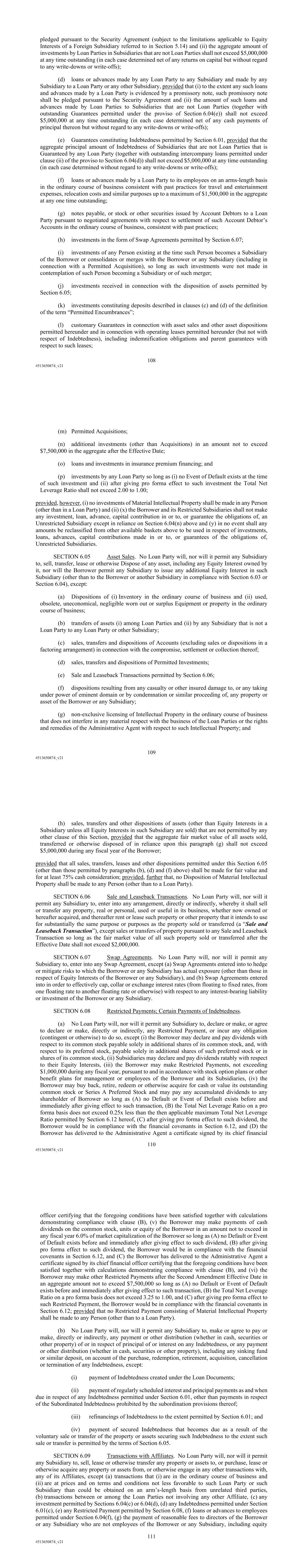 108 #513650874_v21 pledged pursuant to the Security Agreement (subject to the limitations applicable to Equity Interests of a Foreign Subsidiary referred to in Section 5.14) and (ii) the aggregate amount of investments by Loan Parties in Subsidiaries that are not Loan Parties shall not exceed $5,000,000 at any time outstanding (in each case determined net of any returns on capital but without regard to any write-downs or write-offs); (d) loans or advances made by any Loan Party to any Subsidiary and made by any Subsidiary to a Loan Party or any other Subsidiary, provided that (i) to the extent any such loans and advances made by a Loan Party is evidenced by a promissory note, such promissory note shall be pledged pursuant to the Security Agreement and (ii) the amount of such loans and advances made by Loan Parties to Subsidiaries that are not Loan Parties (together with outstanding Guarantees permitted under the proviso of Section 6.04(e)) shall not exceed $5,000,000 at any time outstanding (in each case determined net of any cash payments of principal thereon but without regard to any write-downs or write-offs); (e) Guarantees constituting Indebtedness permitted by Section 6.01, provided that the aggregate principal amount of Indebtedness of Subsidiaries that are not Loan Parties that is Guaranteed by any Loan Party (together with outstanding intercompany loans permitted under clause (ii) of the proviso to Section 6.04(d)) shall not exceed $5,000,000 at any time outstanding (in each case determined without regard to any write-downs or write-offs); (f) loans or advances made by a Loan Party to its employees on an arms-length basis in the ordinary course of business consistent with past practices for travel and entertainment expenses, relocation costs and similar purposes up to a maximum of $1,500,000 in the aggregate at any one time outstanding; (g) notes payable, or stock or other securities issued by Account Debtors to a Loan Party pursuant to negotiated agreements with respect to settlement of such Account Debtor’s Accounts in the ordinary course of business, consistent with past practices; (h) investments in the form of Swap Agreements permitted by Section 6.07; (i) investments of any Person existing at the time such Person becomes a Subsidiary of the Borrower or consolidates or merges with the Borrower or any Subsidiary (including in connection with a Permitted Acquisition), so long as such investments were not made in contemplation of such Person becoming a Subsidiary or of such merger; (j) investments received in connection with the disposition of assets permitted by Section 6.05; (k) investments constituting deposits described in clauses (c) and (d) of the definition of the term “Permitted Encumbrances”; (l) customary Guarantees in connection with asset sales and other asset dispositions permitted hereunder and in connection with operating leases permitted hereunder (but not with respect of Indebtedness), including indemnification obligations and parent guarantees with respect to such leases; 109 #513650874_v21 (m) Permitted Acquisitions; (n) additional investments (other than Acquisitions) in an amount not to exceed $7,500,000 in the aggregate after the Effective Date; (o) loans and investments in insurance premium financing; and (p) investments by any Loan Party so long as (i) no Event of Default exists at the time of such investment and (ii) after giving pro forma effect to such investment the Total Net Leverage Ratio shall not exceed 2.00 to 1.00; provided, however, (i) no investments of Material Intellectual Property shall be made in any Person (other than in a Loan Party) and (ii) (x) the Borrower and its Restricted Subsidiaries shall not make any investment, loan, advance, capital contribution in or to, or guarantee the obligations of, an Unrestricted Subsidiary except in reliance on Section 6.04(n) above and (y) in no event shall any amounts be reclassified from other available baskets above to be used in respect of investments, loans, advances, capital contributions made in or to, or guarantees of the obligations of, Unrestricted Subsidiaries. SECTION 6.05 Asset Sales. No Loan Party will, nor will it permit any Subsidiary to, sell, transfer, lease or otherwise Dispose of any asset, including any Equity Interest owned by it, nor will the Borrower permit any Subsidiary to issue any additional Equity Interest in such Subsidiary (other than to the Borrower or another Subsidiary in compliance with Section 6.03 or Section 6.04), except: (a) Dispositions of (i) Inventory in the ordinary course of business and (ii) used, obsolete, uneconomical, negligible worn out or surplus Equipment or property in the ordinary course of business; (b) transfers of assets (i) among Loan Parties and (ii) by any Subsidiary that is not a Loan Party to any Loan Party or other Subsidiary; (c) sales, transfers and dispositions of Accounts (excluding sales or dispositions in a factoring arrangement) in connection with the compromise, settlement or collection thereof; (d) sales, transfers and dispositions of Permitted Investments; (e) Sale and Leaseback Transactions permitted by Section 6.06; (f) dispositions resulting from any casualty or other insured damage to, or any taking under power of eminent domain or by condemnation or similar proceeding of, any property or asset of the Borrower or any Subsidiary; (g) non-exclusive licensing of Intellectual Property in the ordinary course of business that does not interfere in any material respect with the business of the Loan Parties or the rights and remedies of the Administrative Agent with respect to such Intellectual Property; and 110 #513650874_v21 (h) sales, transfers and other dispositions of assets (other than Equity Interests in a Subsidiary unless all Equity Interests in such Subsidiary are sold) that are not permitted by any other clause of this Section, provided that the aggregate fair market value of all assets sold, transferred or otherwis