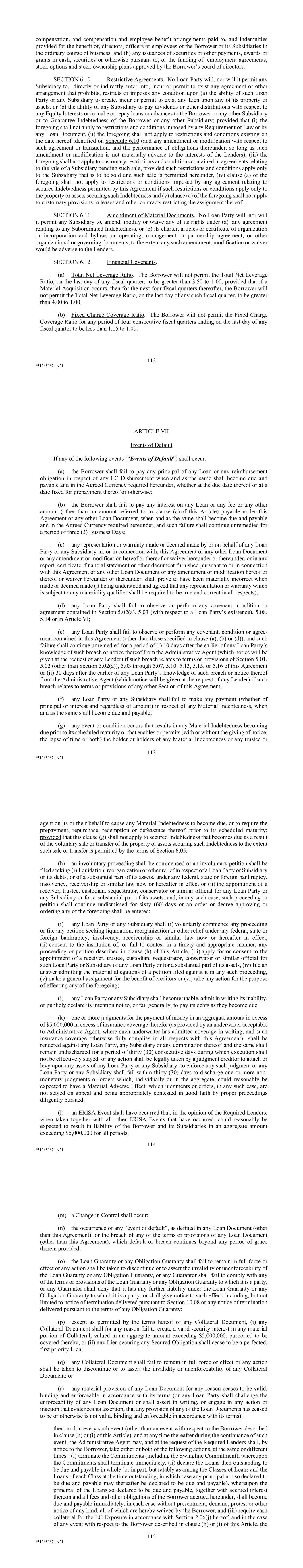 112 #513650874_v21 compensation, and compensation and employee benefit arrangements paid to, and indemnities provided for the benefit of, directors, officers or employees of the Borrower or its Subsidiaries in the ordinary course of business, and (h) any issuances of securities or other payments, awards or grants in cash, securities or otherwise pursuant to, or the funding of, employment agreements, stock options and stock ownership plans approved by the Borrower’s board of directors. SECTION 6.10 Restrictive Agreements. No Loan Party will, nor will it permit any Subsidiary to, directly or indirectly enter into, incur or permit to exist any agreement or other arrangement that prohibits, restricts or imposes any condition upon (a) the ability of such Loan Party or any Subsidiary to create, incur or permit to exist any Lien upon any of its property or assets, or (b) the ability of any Subsidiary to pay dividends or other distributions with respect to any Equity Interests or to make or repay loans or advances to the Borrower or any other Subsidiary or to Guarantee Indebtedness of the Borrower or any other Subsidiary; provided that (i) the foregoing shall not apply to restrictions and conditions imposed by any Requirement of Law or by any Loan Document, (ii) the foregoing shall not apply to restrictions and conditions existing on the date hereof identified on Schedule 6.10 (and any amendment or modification with respect to such agreement or transaction, and the performance of obligations thereunder, so long as such amendment or modification is not materially adverse to the interests of the Lenders), (iii) the foregoing shall not apply to customary restrictions and conditions contained in agreements relating to the sale of a Subsidiary pending such sale, provided such restrictions and conditions apply only to the Subsidiary that is to be sold and such sale is permitted hereunder, (iv) clause (a) of the foregoing shall not apply to restrictions or conditions imposed by any agreement relating to secured Indebtedness permitted by this Agreement if such restrictions or conditions apply only to the property or assets securing such Indebtedness and (v) clause (a) of the foregoing shall not apply to customary provisions in leases and other contracts restricting the assignment thereof. SECTION 6.11 Amendment of Material Documents. No Loan Party will, nor will it permit any Subsidiary to, amend, modify or waive any of its rights under (a) any agreement relating to any Subordinated Indebtedness, or (b) its charter, articles or certificate of organization or incorporation and bylaws or operating, management or partnership agreement, or other organizational or governing documents, to the extent any such amendment, modification or waiver would be adverse to the Lenders. SECTION 6.12 Financial Covenants. (a) Total Net Leverage Ratio. The Borrower will not permit the Total Net Leverage Ratio, on the last day of any fiscal quarter, to be greater than 3.50 to 1.00, provided that if a Material Acquisition occurs, then for the next four fiscal quarters thereafter, the Borrower will not permit the Total Net Leverage Ratio, on the last day of any such fiscal quarter, to be greater than 4.00 to 1.00. (b) Fixed Charge Coverage Ratio. The Borrower will not permit the Fixed Charge Coverage Ratio for any period of four consecutive fiscal quarters ending on the last day of any fiscal quarter to be less than 1.15 to 1.00. 113 #513650874_v21 ARTICLE VII Events of Default If any of the following events (“Events of Default”) shall occur: (a) the Borrower shall fail to pay any principal of any Loan or any reimbursement obligation in respect of any LC Disbursement when and as the same shall become due and payable and in the Agreed Currency required hereunder, whether at the due date thereof or at a date fixed for prepayment thereof or otherwise; (b) the Borrower shall fail to pay any interest on any Loan or any fee or any other amount (other than an amount referred to in clause (a) of this Article) payable under this Agreement or any other Loan Document, when and as the same shall become due and payable and in the Agreed Currency required hereunder, and such failure shall continue unremedied for a period of three (3) Business Days; (c) any representation or warranty made or deemed made by or on behalf of any Loan Party or any Subsidiary in, or in connection with, this Agreement or any other Loan Document or any amendment or modification hereof or thereof or waiver hereunder or thereunder, or in any report, certificate, financial statement or other document furnished pursuant to or in connection with this Agreement or any other Loan Document or any amendment or modification hereof or thereof or waiver hereunder or thereunder, shall prove to have been materially incorrect when made or deemed made (it being understood and agreed that any representation or warranty which is subject to any materiality qualifier shall be required to be true and correct in all respects); (d) any Loan Party shall fail to observe or perform any covenant, condition or agreement contained in Section 5.02(a), 5.03 (with respect to a Loan Party’s existence), 5.08, 5.14 or in Article VI; (e) any Loan Party shall fail to observe or perform any covenant, condition or agree- ment contained in this Agreement (other than those specified in clause (a), (b) or (d)), and such failure shall continue unremedied for a period of (i) 10 days after the earlier of any Loan Party’s knowledge of such breach or notice thereof from the Administrative Agent (which notice will be given at the request of any Lender) if such breach relates to terms or provisions of Section 5.01, 5.02 (other than Section 5.02(a)), 5.03 through 5.07, 5.10, 5.13, 5.15, or 5.16 of this Agreement or (ii) 30 days after the earlier of any Loan Party’s knowledge of such breach or notice thereof from the Administrative Agent (which notice will be given at the request of any Lender) if such b