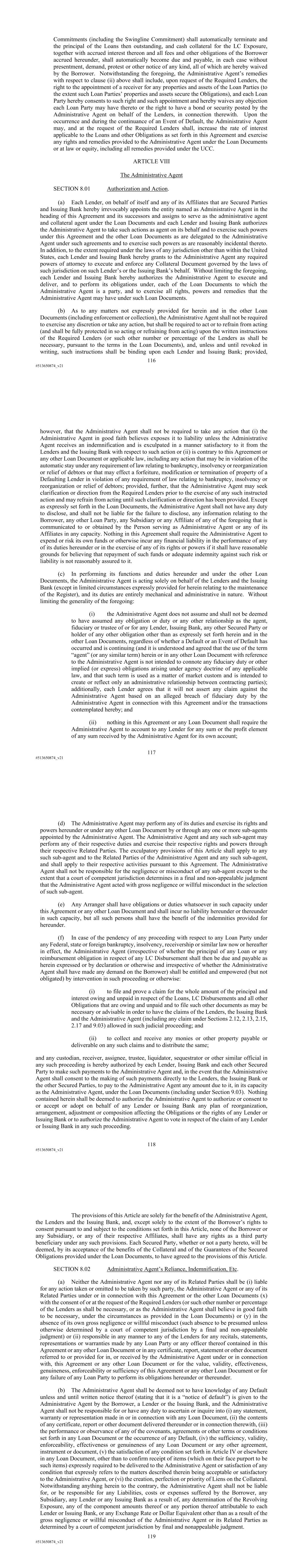 116 #513650874_v21 Commitments (including the Swingline Commitment) shall automatically terminate and the principal of the Loans then outstanding, and cash collateral for the LC Exposure, together with accrued interest thereon and all fees and other obligations of the Borrower accrued hereunder, shall automatically become due and payable, in each case without presentment, demand, protest or other notice of any kind, all of which are hereby waived by the Borrower. Notwithstanding the foregoing, the Administrative Agent’s remedies with respect to clause (ii) above shall include, upon request of the Required Lenders, the right to the appointment of a receiver for any properties and assets of the Loan Parties (to the extent such Loan Parties’ properties and assets secure the Obligations), and each Loan Party hereby consents to such right and such appointment and hereby waives any objection each Loan Party may have thereto or the right to have a bond or security posted by the Administrative Agent on behalf of the Lenders, in connection therewith. Upon the occurrence and during the continuance of an Event of Default, the Administrative Agent may, and at the request of the Required Lenders shall, increase the rate of interest applicable to the Loans and other Obligations as set forth in this Agreement and exercise any rights and remedies provided to the Administrative Agent under the Loan Documents or at law or equity, including all remedies provided under the UCC. ARTICLE VIII The Administrative Agent SECTION 8.01 Authorization and Action. (a) Each Lender, on behalf of itself and any of its Affiliates that are Secured Parties and Issuing Bank hereby irrevocably appoints the entity named as Administrative Agent in the heading of this Agreement and its successors and assigns to serve as the administrative agent and collateral agent under the Loan Documents and each Lender and Issuing Bank authorizes the Administrative Agent to take such actions as agent on its behalf and to exercise such powers under this Agreement and the other Loan Documents as are delegated to the Administrative Agent under such agreements and to exercise such powers as are reasonably incidental thereto. In addition, to the extent required under the laws of any jurisdiction other than within the United States, each Lender and Issuing Bank hereby grants to the Administrative Agent any required powers of attorney to execute and enforce any Collateral Document governed by the laws of such jurisdiction on such Lender’s or the Issuing Bank’s behalf. Without limiting the foregoing, each Lender and Issuing Bank hereby authorizes the Administrative Agent to execute and deliver, and to perform its obligations under, each of the Loan Documents to which the Administrative Agent is a party, and to exercise all rights, powers and remedies that the Administrative Agent may have under such Loan Documents. (b) As to any matters not expressly provided for herein and in the other Loan Documents (including enforcement or collection), the Administrative Agent shall not be required to exercise any discretion or take any action, but shall be required to act or to refrain from acting (and shall be fully protected in so acting or refraining from acting) upon the written instructions of the Required Lenders (or such other number or percentage of the Lenders as shall be necessary, pursuant to the terms in the Loan Documents), and, unless and until revoked in writing, such instructions shall be binding upon each Lender and Issuing Bank; provided, 117 #513650874_v21 however, that the Administrative Agent shall not be required to take any action that (i) the Administrative Agent in good faith believes exposes it to liability unless the Administrative Agent receives an indemnification and is exculpated in a manner satisfactory to it from the Lenders and the Issuing Bank with respect to such action or (ii) is contrary to this Agreement or any other Loan Document or applicable law, including any action that may be in violation of the automatic stay under any requirement of law relating to bankruptcy, insolvency or reorganization or relief of debtors or that may effect a forfeiture, modification or termination of property of a Defaulting Lender in violation of any requirement of law relating to bankruptcy, insolvency or reorganization or relief of debtors; provided, further, that the Administrative Agent may seek clarification or direction from the Required Lenders prior to the exercise of any such instructed action and may refrain from acting until such clarification or direction has been provided. Except as expressly set forth in the Loan Documents, the Administrative Agent shall not have any duty to disclose, and shall not be liable for the failure to disclose, any information relating to the Borrower, any other Loan Party, any Subsidiary or any Affiliate of any of the foregoing that is communicated to or obtained by the Person serving as Administrative Agent or any of its Affiliates in any capacity. Nothing in this Agreement shall require the Administrative Agent to expend or risk its own funds or otherwise incur any financial liability in the performance of any of its duties hereunder or in the exercise of any of its rights or powers if it shall have reasonable grounds for believing that repayment of such funds or adequate indemnity against such risk or liability is not reasonably assured to it. (c) In performing its functions and duties hereunder and under the other Loan Documents, the Administrative Agent is acting solely on behalf of the Lenders and the Issuing Bank (except in limited circumstances expressly provided for herein relating to the maintenance of the Register), and its duties are entirely mechanical and administrative in nature. Without limiting the generality of the foregoing: (i) the Administrative Agent does not assume and shall not be deemed to have assumed any obligation or duty or any other relationship as the agent, fiducia