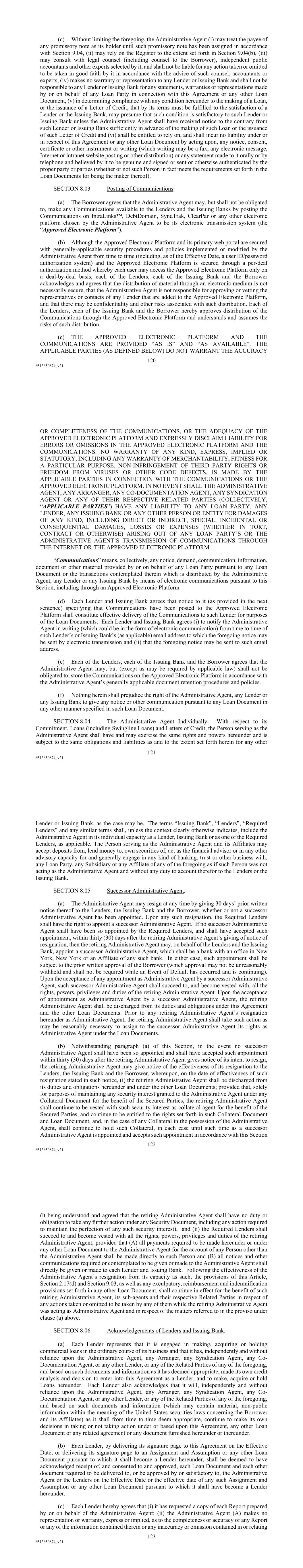 120 #513650874_v21 (c) Without limiting the foregoing, the Administrative Agent (i) may treat the payee of any promissory note as its holder until such promissory note has been assigned in accordance with Section 9.04, (ii) may rely on the Register to the extent set forth in Section 9.04(b), (iii) may consult with legal counsel (including counsel to the Borrower), independent public accountants and other experts selected by it, and shall not be liable for any action taken or omitted to be taken in good faith by it in accordance with the advice of such counsel, accountants or experts, (iv) makes no warranty or representation to any Lender or Issuing Bank and shall not be responsible to any Lender or Issuing Bank for any statements, warranties or representations made by or on behalf of any Loan Party in connection with this Agreement or any other Loan Document, (v) in determining compliance with any condition hereunder to the making of a Loan, or the issuance of a Letter of Credit, that by its terms must be fulfilled to the satisfaction of a Lender or the Issuing Bank, may presume that such condition is satisfactory to such Lender or Issuing Bank unless the Administrative Agent shall have received notice to the contrary from such Lender or Issuing Bank sufficiently in advance of the making of such Loan or the issuance of such Letter of Credit and (vi) shall be entitled to rely on, and shall incur no liability under or in respect of this Agreement or any other Loan Document by acting upon, any notice, consent, certificate or other instrument or writing (which writing may be a fax, any electronic message, Internet or intranet website posting or other distribution) or any statement made to it orally or by telephone and believed by it to be genuine and signed or sent or otherwise authenticated by the proper party or parties (whether or not such Person in fact meets the requirements set forth in the Loan Documents for being the maker thereof). SECTION 8.03 Posting of Communications. (a) The Borrower agrees that the Administrative Agent may, but shall not be obligated to, make any Communications available to the Lenders and the Issuing Banks by posting the Communications on IntraLinks™, DebtDomain, SyndTrak, ClearPar or any other electronic platform chosen by the Administrative Agent to be its electronic transmission system (the “Approved Electronic Platform”). (b) Although the Approved Electronic Platform and its primary web portal are secured with generally-applicable security procedures and policies implemented or modified by the Administrative Agent from time to time (including, as of the Effective Date, a user ID/password authorization system) and the Approved Electronic Platform is secured through a per-deal authorization method whereby each user may access the Approved Electronic Platform only on a deal-by-deal basis, each of the Lenders, each of the Issuing Bank and the Borrower acknowledges and agrees that the distribution of material through an electronic medium is not necessarily secure, that the Administrative Agent is not responsible for approving or vetting the representatives or contacts of any Lender that are added to the Approved Electronic Platform, and that there may be confidentiality and other risks associated with such distribution. Each of the Lenders, each of the Issuing Bank and the Borrower hereby approves distribution of the Communications through the Approved Electronic Platform and understands and assumes the risks of such distribution. (c) THE APPROVED ELECTRONIC PLATFORM AND THE COMMUNICATIONS ARE PROVIDED “AS IS” AND “AS AVAILABLE”. THE APPLICABLE PARTIES (AS DEFINED BELOW) DO NOT WARRANT THE ACCURACY 121 #513650874_v21 OR COMPLETENESS OF THE COMMUNICATIONS, OR THE ADEQUACY OF THE APPROVED ELECTRONIC PLATFORM AND EXPRESSLY DISCLAIM LIABILITY FOR ERRORS OR OMISSIONS IN THE APPROVED ELECTRONIC PLATFORM AND THE COMMUNICATIONS. NO WARRANTY OF ANY KIND, EXPRESS, IMPLIED OR STATUTORY, INCLUDING ANY WARRANTY OF MERCHANTABILITY, FITNESS FOR A PARTICULAR PURPOSE, NON-INFRINGEMENT OF THIRD PARTY RIGHTS OR FREEDOM FROM VIRUSES OR OTHER CODE DEFECTS, IS MADE BY THE APPLICABLE PARTIES IN CONNECTION WITH THE COMMUNICATIONS OR THE APPROVED ELECTRONIC PLATFORM. IN NO EVENT SHALL THE ADMINISTRATIVE AGENT, ANY ARRANGER, ANY CO-DOCUMENTATION AGENT, ANY SYNDICATION AGENT OR ANY OF THEIR RESPECTIVE RELATED PARTIES (COLLECTIVELY, “APPLICABLE PARTIES”) HAVE ANY LIABILITY TO ANY LOAN PARTY, ANY LENDER, ANY ISSUING BANK OR ANY OTHER PERSON OR ENTITY FOR DAMAGES OF ANY KIND, INCLUDING DIRECT OR INDIRECT, SPECIAL, INCIDENTAL OR CONSEQUENTIAL DAMAGES, LOSSES OR EXPENSES (WHETHER IN TORT, CONTRACT OR OTHERWISE) ARISING OUT OF ANY LOAN PARTY’S OR THE ADMINISTRATIVE AGENT’S TRANSMISSION OF COMMUNICATIONS THROUGH THE INTERNET OR THE APPROVED ELECTRONIC PLATFORM. “Communications” means, collectively, any notice, demand, communication, information, document or other material provided by or on behalf of any Loan Party pursuant to any Loan Document or the transactions contemplated therein which is distributed by the Administrative Agent, any Lender or any Issuing Bank by means of electronic communications pursuant to this Section, including through an Approved Electronic Platform. (d) Each Lender and Issuing Bank agrees that notice to it (as provided in the next sentence) specifying that Communications have been posted to the Approved Electronic Platform shall constitute effective delivery of the Communications to such Lender for purposes of the Loan Documents. Each Lender and Issuing Bank agrees (i) to notify the Administrative Agent in writing (which could be in the form of electronic communication) from time to time of such Lender’s or Issuing Bank’s (as applicable) email address to which the foregoing notice may be sent by electronic transmission and (ii) that the foregoing notice may be sent to such email address. (e) Each of the Lenders, each of the Issuing Bank a