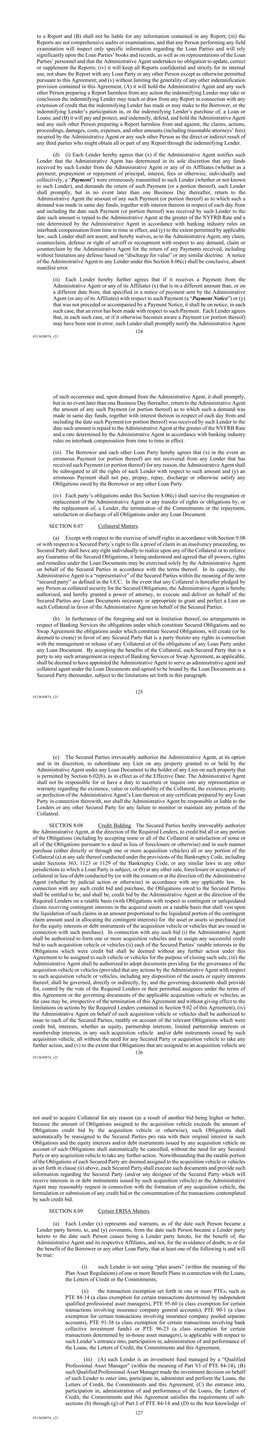 124 #513650874_v21 to a Report and (B) shall not be liable for any information contained in any Report; (iii) the Reports are not comprehensive audits or examinations, and that any Person performing any field examination will inspect only specific information regarding the Loan Parties and will rely significantly upon the Loan Parties’ books and records, as well as on representations of the Loan Parties’ personnel and that the Administrative Agent undertakes no obligation to update, correct or supplement the Reports; (iv) it will keep all Reports confidential and strictly for its internal use, not share the Report with any Loan Party or any other Person except as otherwise permitted pursuant to this Agreement; and (v) without limiting the generality of any other indemnification provision contained in this Agreement, (A) it will hold the Administrative Agent and any such other Person preparing a Report harmless from any action the indemnifying Lender may take or conclusion the indemnifying Lender may reach or draw from any Report in connection with any extension of credit that the indemnifying Lender has made or may make to the Borrower, or the indemnifying Lender’s participation in, or the indemnifying Lender’s purchase of, a Loan or Loans; and (B) it will pay and protect, and indemnify, defend, and hold the Administrative Agent and any such other Person preparing a Report harmless from and against, the claims, actions, proceedings, damages, costs, expenses, and other amounts (including reasonable attorneys’ fees) incurred by the Administrative Agent or any such other Person as the direct or indirect result of any third parties who might obtain all or part of any Report through the indemnifying Lender. (d) (i) Each Lender hereby agrees that (x) if the Administrative Agent notifies such Lender that the Administrative Agent has determined in its sole discretion that any funds received by such Lender from the Administrative Agent or any of its Affiliates (whether as a payment, prepayment or repayment of principal, interest, fees or otherwise; individually and collectively, a “Payment”) were erroneously transmitted to such Lender (whether or not known to such Lender), and demands the return of such Payment (or a portion thereof), such Lender shall promptly, but in no event later than one Business Day thereafter, return to the Administrative Agent the amount of any such Payment (or portion thereof) as to which such a demand was made in same day funds, together with interest thereon in respect of each day from and including the date such Payment (or portion thereof) was received by such Lender to the date such amount is repaid to the Administrative Agent at the greater of the NYFRB Rate and a rate determined by the Administrative Agent in accordance with banking industry rules on interbank compensation from time to time in effect, and (y) to the extent permitted by applicable law, such Lender shall not assert, and hereby waives, as to the Administrative Agent, any claim, counterclaim, defense or right of set-off or recoupment with respect to any demand, claim or counterclaim by the Administrative Agent for the return of any Payments received, including without limitation any defense based on “discharge for value” or any similar doctrine. A notice of the Administrative Agent to any Lender under this Section 8.06(c) shall be conclusive, absent manifest error. (ii) Each Lender hereby further agrees that if it receives a Payment from the Administrative Agent or any of its Affiliates (x) that is in a different amount than, or on a different date from, that specified in a notice of payment sent by the Administrative Agent (or any of its Affiliates) with respect to such Payment (a “Payment Notice”) or (y) that was not preceded or accompanied by a Payment Notice, it shall be on notice, in each such case, that an error has been made with respect to such Payment. Each Lender agrees that, in each such case, or if it otherwise becomes aware a Payment (or portion thereof) may have been sent in error, such Lender shall promptly notify the Administrative Agent 125 #513650874_v21 of such occurrence and, upon demand from the Administrative Agent, it shall promptly, but in no event later than one Business Day thereafter, return to the Administrative Agent the amount of any such Payment (or portion thereof) as to which such a demand was made in same day funds, together with interest thereon in respect of each day from and including the date such Payment (or portion thereof) was received by such Lender to the date such amount is repaid to the Administrative Agent at the greater of the NYFRB Rate and a rate determined by the Administrative Agent in accordance with banking industry rules on interbank compensation from time to time in effect. (iii) The Borrower and each other Loan Party hereby agrees that (x) in the event an erroneous Payment (or portion thereof) are not recovered from any Lender that has received such Payment (or portion thereof) for any reason, the Administrative Agent shall be subrogated to all the rights of such Lender with respect to such amount and (y) an erroneous Payment shall not pay, prepay, repay, discharge or otherwise satisfy any Obligations owed by the Borrower or any other Loan Party. (iv) Each party’s obligations under this Section 8.06(c) shall survive the resignation or replacement of the Administrative Agent or any transfer of rights or obligations by, or the replacement of, a Lender, the termination of the Commitments or the repayment, satisfaction or discharge of all Obligations under any Loan Document. SECTION 8.07 Collateral Matters. (a) Except with respect to the exercise of setoff rights in accordance with Section 9.08 or with respect to a Secured Party’s right to file a proof of claim in an insolvency proceeding, no Secured Party shall have any right individually to realize upon any of the Collateral or to enforce any Guarantee of the Secured Oblig