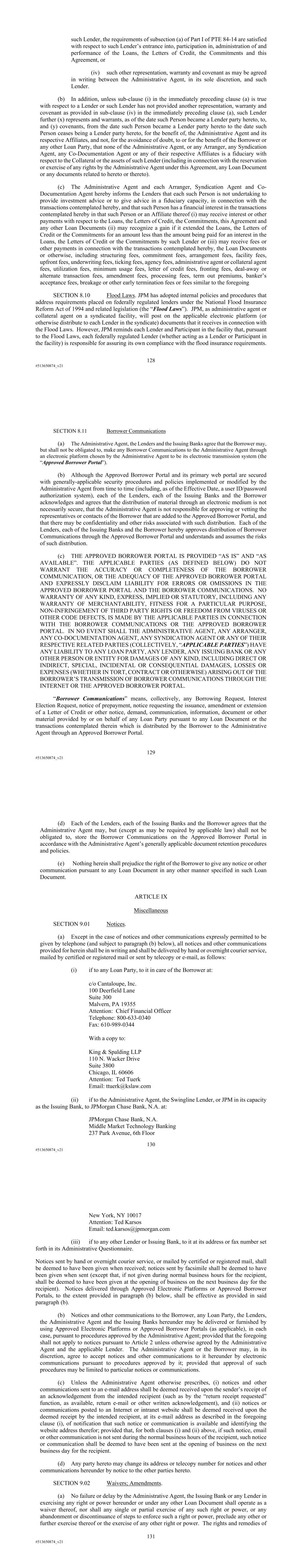 128 #513650874_v21 such Lender, the requirements of subsection (a) of Part I of PTE 84-14 are satisfied with respect to such Lender’s entrance into, participation in, administration of and performance of the Loans, the Letters of Credit, the Commitments and this Agreement, or (iv) such other representation, warranty and covenant as may be agreed in writing between the Administrative Agent, in its sole discretion, and such Lender. (b) In addition, unless sub-clause (i) in the immediately preceding clause (a) is true with respect to a Lender or such Lender has not provided another representation, warranty and covenant as provided in sub-clause (iv) in the immediately preceding clause (a), such Lender further (x) represents and warrants, as of the date such Person became a Lender party hereto, to, and (y) covenants, from the date such Person became a Lender party hereto to the date such Person ceases being a Lender party hereto, for the benefit of, the Administrative Agent and its respective Affiliates, and not, for the avoidance of doubt, to or for the benefit of the Borrower or any other Loan Party, that none of the Administrative Agent, or any Arranger, any Syndication Agent, any Co-Documentation Agent or any of their respective Affiliates is a fiduciary with respect to the Collateral or the assets of such Lender (including in connection with the reservation or exercise of any rights by the Administrative Agent under this Agreement, any Loan Document or any documents related to hereto or thereto). (c) The Administrative Agent and each Arranger, Syndication Agent and Co- Documentation Agent hereby informs the Lenders that each such Person is not undertaking to provide investment advice or to give advice in a fiduciary capacity, in connection with the transactions contemplated hereby, and that such Person has a financial interest in the transactions contemplated hereby in that such Person or an Affiliate thereof (i) may receive interest or other payments with respect to the Loans, the Letters of Credit, the Commitments, this Agreement and any other Loan Documents (ii) may recognize a gain if it extended the Loans, the Letters of Credit or the Commitments for an amount less than the amount being paid for an interest in the Loans, the Letters of Credit or the Commitments by such Lender or (iii) may receive fees or other payments in connection with the transactions contemplated hereby, the Loan Documents or otherwise, including structuring fees, commitment fees, arrangement fees, facility fees, upfront fees, underwriting fees, ticking fees, agency fees, administrative agent or collateral agent fees, utilization fees, minimum usage fees, letter of credit fees, fronting fees, deal-away or alternate transaction fees, amendment fees, processing fees, term out premiums, banker’s acceptance fees, breakage or other early termination fees or fees similar to the foregoing SECTION 8.10 Flood Laws. JPM has adopted internal policies and procedures that address requirements placed on federally regulated lenders under the National Flood Insurance Reform Act of 1994 and related legislation (the “Flood Laws”). JPM, as administrative agent or collateral agent on a syndicated facility, will post on the applicable electronic platform (or otherwise distribute to each Lender in the syndicate) documents that it receives in connection with the Flood Laws. However, JPM reminds each Lender and Participant in the facility that, pursuant to the Flood Laws, each federally regulated Lender (whether acting as a Lender or Participant in the facility) is responsible for assuring its own compliance with the flood insurance requirements. 129 #513650874_v21 SECTION 8.11 Borrower Communications (a) The Administrative Agent, the Lenders and the Issuing Banks agree that the Borrower may, but shall not be obligated to, make any Borrower Communications to the Administrative Agent through an electronic platform chosen by the Administrative Agent to be its electronic transmission system (the “Approved Borrower Portal”). (b) Although the Approved Borrower Portal and its primary web portal are secured with generally-applicable security procedures and policies implemented or modified by the Administrative Agent from time to time (including, as of the Effective Date, a user ID/password authorization system), each of the Lenders, each of the Issuing Banks and the Borrower acknowledges and agrees that the distribution of material through an electronic medium is not necessarily secure, that the Administrative Agent is not responsible for approving or vetting the representatives or contacts of the Borrower that are added to the Approved Borrower Portal, and that there may be confidentiality and other risks associated with such distribution. Each of the Lenders, each of the Issuing Banks and the Borrower hereby approves distribution of Borrower Communications through the Approved Borrower Portal and understands and assumes the risks of such distribution. (c) THE APPROVED BORROWER PORTAL IS PROVIDED “AS IS” AND “AS AVAILABLE”. THE APPLICABLE PARTIES (AS DEFINED BELOW) DO NOT WARRANT THE ACCURACY OR COMPLETENESS OF THE BORROWER COMMUNICATION, OR THE ADEQUACY OF THE APPROVED BORROWER PORTAL AND EXPRESSLY DISCLAIM LIABILITY FOR ERRORS OR OMISSIONS IN THE APPROVED BORROWER PORTAL AND THE BORROWER COMMUNICATIONS. NO WARRANTY OF ANY KIND, EXPRESS, IMPLIED OR STATUTORY, INCLUDING ANY WARRANTY OF MERCHANTABILITY, FITNESS FOR A PARTICULAR PURPOSE, NON-INFRINGEMENT OF THIRD PARTY RIGHTS OR FREEDOM FROM VIRUSES OR OTHER CODE DEFECTS, IS MADE BY THE APPLICABLE PARTIES IN CONNECTION WITH THE BORROWER COMMUNICATIONS OR THE APPROVED BORROWER PORTAL. IN NO EVENT SHALL THE ADMINISTRATIVE AGENT, ANY ARRANGER, ANY CO-DOCUMENTATION AGENT, ANY SYNDICATION AGENT OR ANY OF THEIR RESPECTIVE RELATED PARTIES (COLLECTIVELY, “APPLICABLE PARTIES”) HAVE ANY LIABILITY TO ANY LOAN PARTY, ANY LENDER, ANY ISSUING BANK OR ANY OTHER PERSON OR ENTITY FOR D