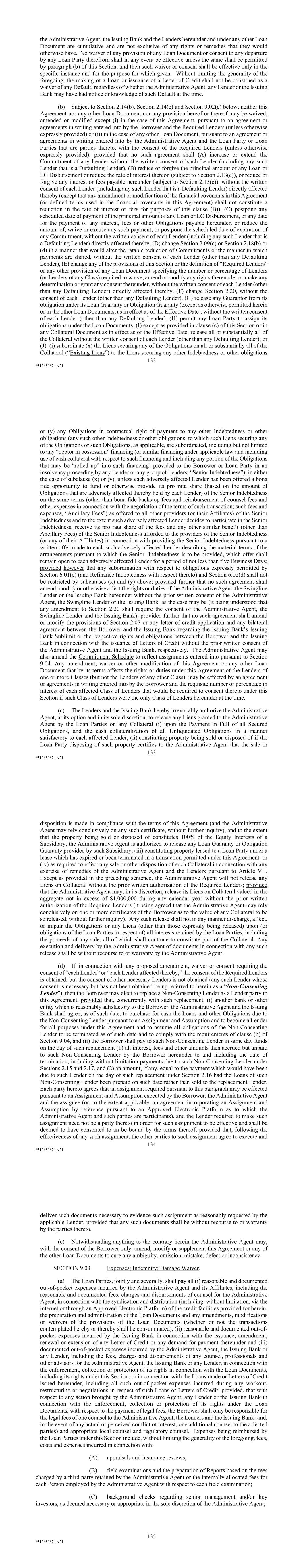 132 #513650874_v21 the Administrative Agent, the Issuing Bank and the Lenders hereunder and under any other Loan Document are cumulative and are not exclusive of any rights or remedies that they would otherwise have. No waiver of any provision of any Loan Document or consent to any departure by any Loan Party therefrom shall in any event be effective unless the same shall be permitted by paragraph (b) of this Section, and then such waiver or consent shall be effective only in the specific instance and for the purpose for which given. Without limiting the generality of the foregoing, the making of a Loan or issuance of a Letter of Credit shall not be construed as a waiver of any Default, regardless of whether the Administrative Agent, any Lender or the Issuing Bank may have had notice or knowledge of such Default at the time. (b) Subject to Section 2.14(b), Section 2.14(c) and Section 9.02(c) below, neither this Agreement nor any other Loan Document nor any provision hereof or thereof may be waived, amended or modified except (i) in the case of this Agreement, pursuant to an agreement or agreements in writing entered into by the Borrower and the Required Lenders (unless otherwise expressly provided) or (ii) in the case of any other Loan Document, pursuant to an agreement or agreements in writing entered into by the Administrative Agent and the Loan Party or Loan Parties that are parties thereto, with the consent of the Required Lenders (unless otherwise expressly provided); provided that no such agreement shall (A) increase or extend the Commitment of any Lender without the written consent of such Lender (including any such Lender that is a Defaulting Lender), (B) reduce or forgive the principal amount of any Loan or LC Disbursement or reduce the rate of interest thereon (subject to Section 2.13(c)), or reduce or forgive any interest or fees payable hereunder (subject to Section 2.13(c)), without the written consent of each Lender (including any such Lender that is a Defaulting Lender) directly affected thereby (except that any amendment or modification of the financial covenants in this Agreement (or defined terms used in the financial covenants in this Agreement) shall not constitute a reduction in the rate of interest or fees for purposes of this clause (B)), (C) postpone any scheduled date of payment of the principal amount of any Loan or LC Disbursement, or any date for the payment of any interest, fees or other Obligations payable hereunder, or reduce the amount of, waive or excuse any such payment, or postpone the scheduled date of expiration of any Commitment, without the written consent of each Lender (including any such Lender that is a Defaulting Lender) directly affected thereby, (D) change Section 2.09(c) or Section 2.18(b) or (d) in a manner that would alter the ratable reduction of Commitments or the manner in which payments are shared, without the written consent of each Lender (other than any Defaulting Lender), (E) change any of the provisions of this Section or the definition of “Required Lenders” or any other provision of any Loan Document specifying the number or percentage of Lenders (or Lenders of any Class) required to waive, amend or modify any rights thereunder or make any determination or grant any consent thereunder, without the written consent of each Lender (other than any Defaulting Lender) directly affected thereby, (F) change Section 2.20, without the consent of each Lender (other than any Defaulting Lender), (G) release any Guarantor from its obligation under its Loan Guaranty or Obligation Guaranty (except as otherwise permitted herein or in the other Loan Documents, as in effect as of the Effective Date), without the written consent of each Lender (other than any Defaulting Lender), (H) permit any Loan Party to assign its obligations under the Loan Documents, (I) except as provided in clause (c) of this Section or in any Collateral Document as in effect as of the Effective Date, release all or substantially all of the Collateral without the written consent of each Lender (other than any Defaulting Lender); or (J) (i) subordinate (x) the Liens securing any of the Obligations on all or substantially all of the Collateral (“Existing Liens”) to the Liens securing any other Indebtedness or other obligations 133 #513650874_v21 or (y) any Obligations in contractual right of payment to any other Indebtedness or other obligations (any such other Indebtedness or other obligations, to which such Liens securing any of the Obligations or such Obligations, as applicable, are subordinated, including but not limited to any “debtor in possession” financing (or similar financing under applicable law and including use of cash collateral with respect to such financing and including any portion of the Obligations that may be “rolled up” into such financing) provided to the Borrower or Loan Party in an insolvency proceeding by any Lender or any group of Lenders, “Senior Indebtedness”), in either the case of subclause (x) or (y), unless each adversely affected Lender has been offered a bona fide opportunity to fund or otherwise provide its pro rata share (based on the amount of Obligations that are adversely affected thereby held by each Lender) of the Senior Indebtedness on the same terms (other than bona fide backstop fees and reimbursement of counsel fees and other expenses in connection with the negotiation of the terms of such transaction; such fees and expenses, “Ancillary Fees”) as offered to all other providers (or their Affiliates) of the Senior Indebtedness and to the extent such adversely affected Lender decides to participate in the Senior Indebtedness, receive its pro rata share of the fees and any other similar benefit (other than Ancillary Fees) of the Senior Indebtedness afforded to the providers of the Senior Indebtedness (or any of their Affiliates) in connection with providing the Senior Indebtedness pursuant to a written offer made 