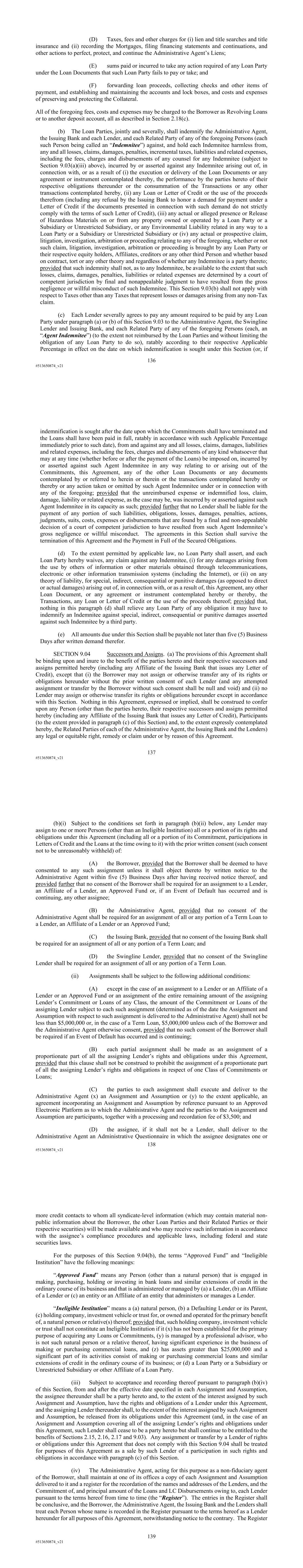 136 #513650874_v21 (D) Taxes, fees and other charges for (i) lien and title searches and title insurance and (ii) recording the Mortgages, filing financing statements and continuations, and other actions to perfect, protect, and continue the Administrative Agent’s Liens; (E) sums paid or incurred to take any action required of any Loan Party under the Loan Documents that such Loan Party fails to pay or take; and (F) forwarding loan proceeds, collecting checks and other items of payment, and establishing and maintaining the accounts and lock boxes, and costs and expenses of preserving and protecting the Collateral. All of the foregoing fees, costs and expenses may be charged to the Borrower as Revolving Loans or to another deposit account, all as described in Section 2.18(c). (b) The Loan Parties, jointly and severally, shall indemnify the Administrative Agent, the Issuing Bank and each Lender, and each Related Party of any of the foregoing Persons (each such Person being called an “Indemnitee”) against, and hold each Indemnitee harmless from, any and all losses, claims, damages, penalties, incremental taxes, liabilities and related expenses, including the fees, charges and disbursements of any counsel for any Indemnitee (subject to Section 9.03(a)(iii) above), incurred by or asserted against any Indemnitee arising out of, in connection with, or as a result of (i) the execution or delivery of the Loan Documents or any agreement or instrument contemplated thereby, the performance by the parties hereto of their respective obligations thereunder or the consummation of the Transactions or any other transactions contemplated hereby, (ii) any Loan or Letter of Credit or the use of the proceeds therefrom (including any refusal by the Issuing Bank to honor a demand for payment under a Letter of Credit if the documents presented in connection with such demand do not strictly comply with the terms of such Letter of Credit), (iii) any actual or alleged presence or Release of Hazardous Materials on or from any property owned or operated by a Loan Party or a Subsidiary or Unrestricted Subsidiary, or any Environmental Liability related in any way to a Loan Party or a Subsidiary or Unrestricted Subsidiary or (iv) any actual or prospective claim, litigation, investigation, arbitration or proceeding relating to any of the foregoing, whether or not such claim, litigation, investigation, arbitration or proceeding is brought by any Loan Party or their respective equity holders, Affiliates, creditors or any other third Person and whether based on contract, tort or any other theory and regardless of whether any Indemnitee is a party thereto; provided that such indemnity shall not, as to any Indemnitee, be available to the extent that such losses, claims, damages, penalties, liabilities or related expenses are determined by a court of competent jurisdiction by final and nonappealable judgment to have resulted from the gross negligence or willful misconduct of such Indemnitee. This Section 9.03(b) shall not apply with respect to Taxes other than any Taxes that represent losses or damages arising from any non-Tax claim. (c) Each Lender severally agrees to pay any amount required to be paid by any Loan Party under paragraph (a) or (b) of this Section 9.03 to the Administrative Agent, the Swingline Lender and Issuing Bank, and each Related Party of any of the foregoing Persons (each, an “Agent Indemnitee”) (to the extent not reimbursed by the Loan Parties and without limiting the obligation of any Loan Party to do so), ratably according to their respective Applicable Percentage in effect on the date on which indemnification is sought under this Section (or, if 137 #513650874_v21 indemnification is sought after the date upon which the Commitments shall have terminated and the Loans shall have been paid in full, ratably in accordance with such Applicable Percentage immediately prior to such date), from and against any and all losses, claims, damages, liabilities and related expenses, including the fees, charges and disbursements of any kind whatsoever that may at any time (whether before or after the payment of the Loans) be imposed on, incurred by or asserted against such Agent Indemnitee in any way relating to or arising out of the Commitments, this Agreement, any of the other Loan Documents or any documents contemplated by or referred to herein or therein or the transactions contemplated hereby or thereby or any action taken or omitted by such Agent Indemnitee under or in connection with any of the foregoing; provided that the unreimbursed expense or indemnified loss, claim, damage, liability or related expense, as the case may be, was incurred by or asserted against such Agent Indemnitee in its capacity as such; provided further that no Lender shall be liable for the payment of any portion of such liabilities, obligations, losses, damages, penalties, actions, judgments, suits, costs, expenses or disbursements that are found by a final and non-appealable decision of a court of competent jurisdiction to have resulted from such Agent Indemnitee’s gross negligence or willful misconduct. The agreements in this Section shall survive the termination of this Agreement and the Payment in Full of the Secured Obligations. (d) To the extent permitted by applicable law, no Loan Party shall assert, and each Loan Party hereby waives, any claim against any Indemnitee, (i) for any damages arising from the use by others of information or other materials obtained through telecommunications, electronic or other information transmission systems (including the Internet), or (ii) on any theory of liability, for special, indirect, consequential or punitive damages (as opposed to direct or actual damages) arising out of, in connection with, or as a result of, this Agreement, any other Loan Document, or any agreement or instrument contemplated hereby or thereby, the Transactions, any Loan or Letter of Credit or the use of the 