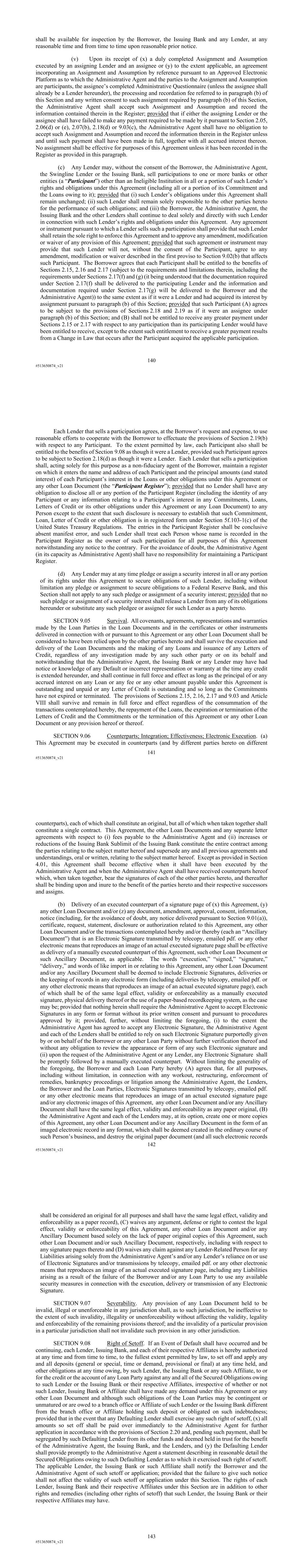 140 #513650874_v21 shall be available for inspection by the Borrower, the Issuing Bank and any Lender, at any reasonable time and from time to time upon reasonable prior notice. (v) Upon its receipt of (x) a duly completed Assignment and Assumption executed by an assigning Lender and an assignee or (y) to the extent applicable, an agreement incorporating an Assignment and Assumption by reference pursuant to an Approved Electronic Platform as to which the Administrative Agent and the parties to the Assignment and Assumption are participants, the assignee’s completed Administrative Questionnaire (unless the assignee shall already be a Lender hereunder), the processing and recordation fee referred to in paragraph (b) of this Section and any written consent to such assignment required by paragraph (b) of this Section, the Administrative Agent shall accept such Assignment and Assumption and record the information contained therein in the Register; provided that if either the assigning Lender or the assignee shall have failed to make any payment required to be made by it pursuant to Section 2.05, 2.06(d) or (e), 2.07(b), 2.18(d) or 9.03(c), the Administrative Agent shall have no obligation to accept such Assignment and Assumption and record the information therein in the Register unless and until such payment shall have been made in full, together with all accrued interest thereon. No assignment shall be effective for purposes of this Agreement unless it has been recorded in the Register as provided in this paragraph. (c) Any Lender may, without the consent of the Borrower, the Administrative Agent, the Swingline Lender or the Issuing Bank, sell participations to one or more banks or other entities (a “Participant”) other than an Ineligible Institution in all or a portion of such Lender’s rights and obligations under this Agreement (including all or a portion of its Commitment and the Loans owing to it); provided that (i) such Lender’s obligations under this Agreement shall remain unchanged; (ii) such Lender shall remain solely responsible to the other parties hereto for the performance of such obligations; and (iii) the Borrower, the Administrative Agent, the Issuing Bank and the other Lenders shall continue to deal solely and directly with such Lender in connection with such Lender’s rights and obligations under this Agreement. Any agreement or instrument pursuant to which a Lender sells such a participation shall provide that such Lender shall retain the sole right to enforce this Agreement and to approve any amendment, modification or waiver of any provision of this Agreement; provided that such agreement or instrument may provide that such Lender will not, without the consent of the Participant, agree to any amendment, modification or waiver described in the first proviso to Section 9.02(b) that affects such Participant. The Borrower agrees that each Participant shall be entitled to the benefits of Sections 2.15, 2.16 and 2.17 (subject to the requirements and limitations therein, including the requirements under Sections 2.17(f) and (g) (it being understood that the documentation required under Section 2.17(f) shall be delivered to the participating Lender and the information and documentation required under Section 2.17(g) will be delivered to the Borrower and the Administrative Agent)) to the same extent as if it were a Lender and had acquired its interest by assignment pursuant to paragraph (b) of this Section; provided that such Participant (A) agrees to be subject to the provisions of Sections 2.18 and 2.19 as if it were an assignee under paragraph (b) of this Section; and (B) shall not be entitled to receive any greater payment under Sections 2.15 or 2.17 with respect to any participation than its participating Lender would have been entitled to receive, except to the extent such entitlement to receive a greater payment results from a Change in Law that occurs after the Participant acquired the applicable participation. 141 #513650874_v21 Each Lender that sells a participation agrees, at the Borrower’s request and expense, to use reasonable efforts to cooperate with the Borrower to effectuate the provisions of Section 2.19(b) with respect to any Participant. To the extent permitted by law, each Participant also shall be entitled to the benefits of Section 9.08 as though it were a Lender, provided such Participant agrees to be subject to Section 2.18(d) as though it were a Lender. Each Lender that sells a participation shall, acting solely for this purpose as a non-fiduciary agent of the Borrower, maintain a register on which it enters the name and address of each Participant and the principal amounts (and stated interest) of each Participant’s interest in the Loans or other obligations under this Agreement or any other Loan Document (the “Participant Register”); provided that no Lender shall have any obligation to disclose all or any portion of the Participant Register (including the identity of any Participant or any information relating to a Participant’s interest in any Commitments, Loans, Letters of Credit or its other obligations under this Agreement or any Loan Document) to any Person except to the extent that such disclosure is necessary to establish that such Commitment, Loan, Letter of Credit or other obligation is in registered form under Section 5f.103-1(c) of the United States Treasury Regulations. The entries in the Participant Register shall be conclusive absent manifest error, and such Lender shall treat each Person whose name is recorded in the Participant Register as the owner of such participation for all purposes of this Agreement notwithstanding any notice to the contrary. For the avoidance of doubt, the Administrative Agent (in its capacity as Administrative Agent) shall have no responsibility for maintaining a Participant Register. (d) Any Lender may at any time pledge or assign a security interest in all or any portion of its rights under