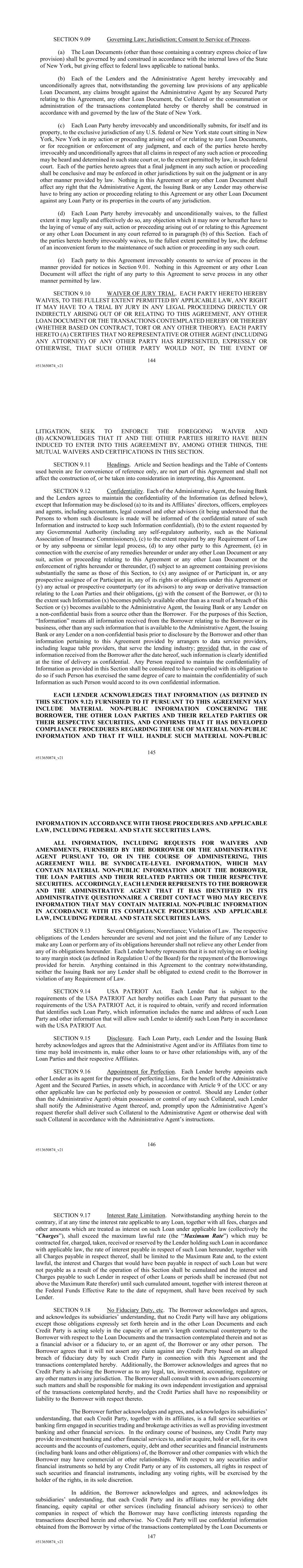 144 #513650874_v21 SECTION 9.09 Governing Law; Jurisdiction; Consent to Service of Process. (a) The Loan Documents (other than those containing a contrary express choice of law provision) shall be governed by and construed in accordance with the internal laws of the State of New York, but giving effect to federal laws applicable to national banks. (b) Each of the Lenders and the Administrative Agent hereby irrevocably and unconditionally agrees that, notwithstanding the governing law provisions of any applicable Loan Document, any claims brought against the Administrative Agent by any Secured Party relating to this Agreement, any other Loan Document, the Collateral or the consummation or administration of the transactions contemplated hereby or thereby shall be construed in accordance with and governed by the law of the State of New York. (c) Each Loan Party hereby irrevocably and unconditionally submits, for itself and its property, to the exclusive jurisdiction of any U.S. federal or New York state court sitting in New York, New York in any action or proceeding arising out of or relating to any Loan Documents, or for recognition or enforcement of any judgment, and each of the parties hereto hereby irrevocably and unconditionally agrees that all claims in respect of any such action or proceeding may be heard and determined in such state court or, to the extent permitted by law, in such federal court. Each of the parties hereto agrees that a final judgment in any such action or proceeding shall be conclusive and may be enforced in other jurisdictions by suit on the judgment or in any other manner provided by law. Nothing in this Agreement or any other Loan Document shall affect any right that the Administrative Agent, the Issuing Bank or any Lender may otherwise have to bring any action or proceeding relating to this Agreement or any other Loan Document against any Loan Party or its properties in the courts of any jurisdiction. (d) Each Loan Party hereby irrevocably and unconditionally waives, to the fullest extent it may legally and effectively do so, any objection which it may now or hereafter have to the laying of venue of any suit, action or proceeding arising out of or relating to this Agreement or any other Loan Document in any court referred to in paragraph (b) of this Section. Each of the parties hereto hereby irrevocably waives, to the fullest extent permitted by law, the defense of an inconvenient forum to the maintenance of such action or proceeding in any such court. (e) Each party to this Agreement irrevocably consents to service of process in the manner provided for notices in Section 9.01. Nothing in this Agreement or any other Loan Document will affect the right of any party to this Agreement to serve process in any other manner permitted by law. SECTION 9.10 WAIVER OF JURY TRIAL. EACH PARTY HERETO HEREBY WAIVES, TO THE FULLEST EXTENT PERMITTED BY APPLICABLE LAW, ANY RIGHT IT MAY HAVE TO A TRIAL BY JURY IN ANY LEGAL PROCEEDING DIRECTLY OR INDIRECTLY ARISING OUT OF OR RELATING TO THIS AGREEMENT, ANY OTHER LOAN DOCUMENT OR THE TRANSACTIONS CONTEMPLATED HEREBY OR THEREBY (WHETHER BASED ON CONTRACT, TORT OR ANY OTHER THEORY). EACH PARTY HERETO (A) CERTIFIES THAT NO REPRESENTATIVE OR OTHER AGENT (INCLUDING ANY ATTORNEY) OF ANY OTHER PARTY HAS REPRESENTED, EXPRESSLY OR OTHERWISE, THAT SUCH OTHER PARTY WOULD NOT, IN THE EVENT OF 145 #513650874_v21 LITIGATION, SEEK TO ENFORCE THE FOREGOING WAIVER AND (B) ACKNOWLEDGES THAT IT AND THE OTHER PARTIES HERETO HAVE BEEN INDUCED TO ENTER INTO THIS AGREEMENT BY, AMONG OTHER THINGS, THE MUTUAL WAIVERS AND CERTIFICATIONS IN THIS SECTION. SECTION 9.11 Headings. Article and Section headings and the Table of Contents used herein are for convenience of reference only, are not part of this Agreement and shall not affect the construction of, or be taken into consideration in interpreting, this Agreement. SECTION 9.12 Confidentiality. Each of the Administrative Agent, the Issuing Bank and the Lenders agrees to maintain the confidentiality of the Information (as defined below), except that Information may be disclosed (a) to its and its Affiliates’ directors, officers, employees and agents, including accountants, legal counsel and other advisors (it being understood that the Persons to whom such disclosure is made will be informed of the confidential nature of such Information and instructed to keep such Information confidential), (b) to the extent requested by any Governmental Authority (including any self-regulatory authority, such as the National Association of Insurance Commissioners), (c) to the extent required by any Requirement of Law or by any subpoena or similar legal process, (d) to any other party to this Agreement, (e) in connection with the exercise of any remedies hereunder or under any other Loan Document or any suit, action or proceeding relating to this Agreement or any other Loan Document or the enforcement of rights hereunder or thereunder, (f) subject to an agreement containing provisions substantially the same as those of this Section, to (x) any assignee of or Participant in, or any prospective assignee of or Participant in, any of its rights or obligations under this Agreement or (y) any actual or prospective counterparty (or its advisors) to any swap or derivative transaction relating to the Loan Parties and their obligations, (g) with the consent of the Borrower, or (h) to the extent such Information (x) becomes publicly available other than as a result of a breach of this Section or (y) becomes available to the Administrative Agent, the Issuing Bank or any Lender on a non-confidential basis from a source other than the Borrower. For the purposes of this Section, “Information” means all information received from the Borrower relating to the Borrower or its business, other than any such information that is available to the Administrative Agent, the Issuing Bank or any Lender on a non-confidential basis prior to disclos