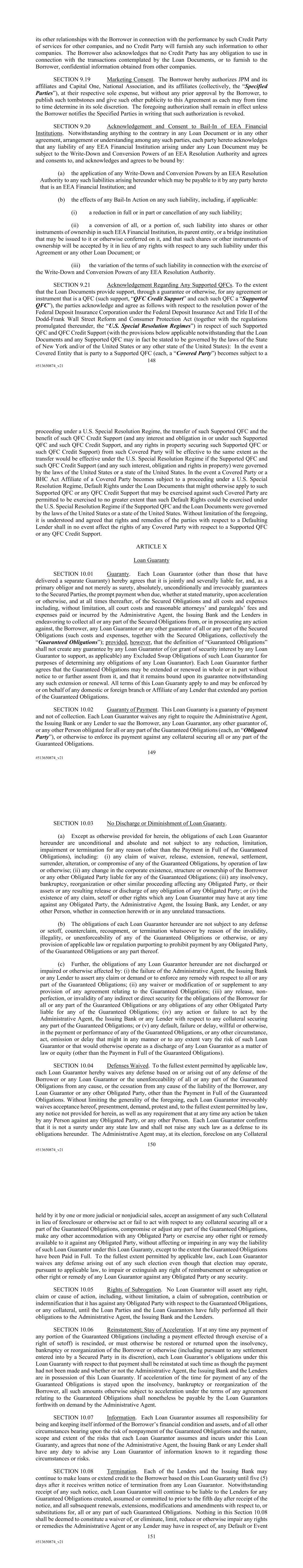 148 #513650874_v21 its other relationships with the Borrower in connection with the performance by such Credit Party of services for other companies, and no Credit Party will furnish any such information to other companies. The Borrower also acknowledges that no Credit Party has any obligation to use in connection with the transactions contemplated by the Loan Documents, or to furnish to the Borrower, confidential information obtained from other companies. SECTION 9.19 Marketing Consent. The Borrower hereby authorizes JPM and its affiliates and Capital One, National Association, and its affiliates (collectively, the “Specified Parties”), at their respective sole expense, but without any prior approval by the Borrower, to publish such tombstones and give such other publicity to this Agreement as each may from time to time determine in its sole discretion. The foregoing authorization shall remain in effect unless the Borrower notifies the Specified Parties in writing that such authorization is revoked. SECTION 9.20 Acknowledgement and Consent to Bail-In of EEA Financial Institutions. Notwithstanding anything to the contrary in any Loan Document or in any other agreement, arrangement or understanding among any such parties, each party hereto acknowledges that any liability of any EEA Financial Institution arising under any Loan Document may be subject to the Write-Down and Conversion Powers of an EEA Resolution Authority and agrees and consents to, and acknowledges and agrees to be bound by: (a) the application of any Write-Down and Conversion Powers by an EEA Resolution Authority to any such liabilities arising hereunder which may be payable to it by any party hereto that is an EEA Financial Institution; and (b) the effects of any Bail-In Action on any such liability, including, if applicable: (i) a reduction in full or in part or cancellation of any such liability; (ii) a conversion of all, or a portion of, such liability into shares or other instruments of ownership in such EEA Financial Institution, its parent entity, or a bridge institution that may be issued to it or otherwise conferred on it, and that such shares or other instruments of ownership will be accepted by it in lieu of any rights with respect to any such liability under this Agreement or any other Loan Document; or (iii) the variation of the terms of such liability in connection with the exercise of the Write-Down and Conversion Powers of any EEA Resolution Authority. SECTION 9.21 Acknowledgement Regarding Any Supported QFCs. To the extent that the Loan Documents provide support, through a guarantee or otherwise, for any agreement or instrument that is a QFC (such support, “QFC Credit Support” and each such QFC a “Supported QFC”), the parties acknowledge and agree as follows with respect to the resolution power of the Federal Deposit Insurance Corporation under the Federal Deposit Insurance Act and Title II of the Dodd-Frank Wall Street Reform and Consumer Protection Act (together with the regulations promulgated thereunder, the “U.S. Special Resolution Regimes”) in respect of such Supported QFC and QFC Credit Support (with the provisions below applicable notwithstanding that the Loan Documents and any Supported QFC may in fact be stated to be governed by the laws of the State of New York and/or of the United States or any other state of the United States): In the event a Covered Entity that is party to a Supported QFC (each, a “Covered Party”) becomes subject to a 149 #513650874_v21 proceeding under a U.S. Special Resolution Regime, the transfer of such Supported QFC and the benefit of such QFC Credit Support (and any interest and obligation in or under such Supported QFC and such QFC Credit Support, and any rights in property securing such Supported QFC or such QFC Credit Support) from such Covered Party will be effective to the same extent as the transfer would be effective under the U.S. Special Resolution Regime if the Supported QFC and such QFC Credit Support (and any such interest, obligation and rights in property) were governed by the laws of the United States or a state of the United States. In the event a Covered Party or a BHC Act Affiliate of a Covered Party becomes subject to a proceeding under a U.S. Special Resolution Regime, Default Rights under the Loan Documents that might otherwise apply to such Supported QFC or any QFC Credit Support that may be exercised against such Covered Party are permitted to be exercised to no greater extent than such Default Rights could be exercised under the U.S. Special Resolution Regime if the Supported QFC and the Loan Documents were governed by the laws of the United States or a state of the United States. Without limitation of the foregoing, it is understood and agreed that rights and remedies of the parties with respect to a Defaulting Lender shall in no event affect the rights of any Covered Party with respect to a Supported QFC or any QFC Credit Support. ARTICLE X Loan Guaranty SECTION 10.01 Guaranty. Each Loan Guarantor (other than those that have delivered a separate Guaranty) hereby agrees that it is jointly and severally liable for, and, as a primary obligor and not merely as surety, absolutely, unconditionally and irrevocably guarantees to the Secured Parties, the prompt payment when due, whether at stated maturity, upon acceleration or otherwise, and at all times thereafter, of the Secured Obligations and all costs and expenses including, without limitation, all court costs and reasonable attorneys’ and paralegals’ fees and expenses paid or incurred by the Administrative Agent, the Issuing Bank and the Lenders in endeavoring to collect all or any part of the Secured Obligations from, or in prosecuting any action against, the Borrower, any Loan Guarantor or any other guarantor of all or any part of the Secured Obligations (such costs and expenses, together with the Secured Obligations, collectively the “Guaranteed Obligations”); provid