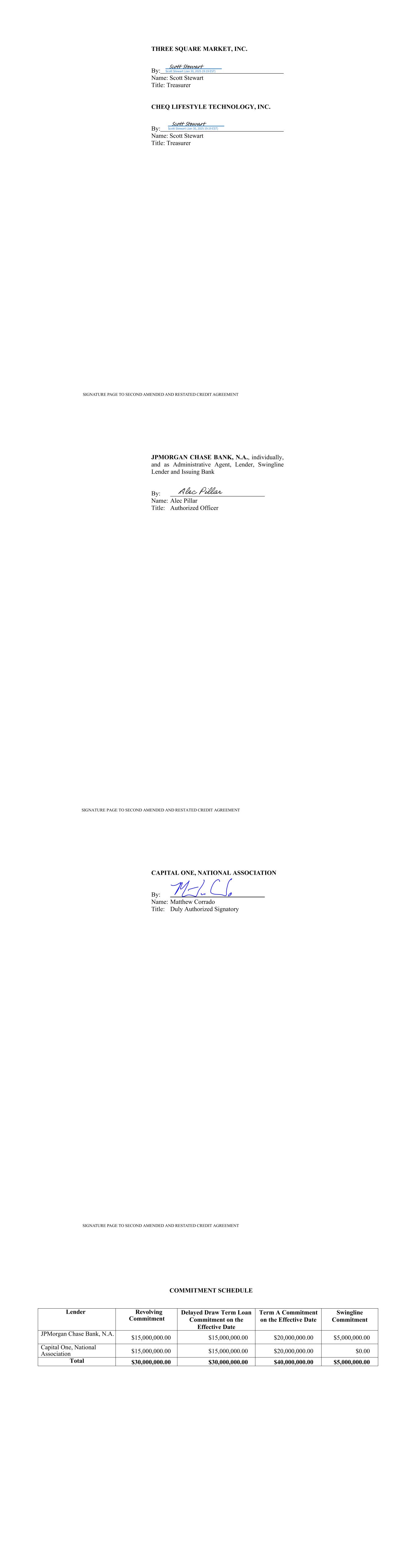 SIGNATURE PAGE TO SECOND AMENDED AND RESTATED CREDIT AGREEMENT THREE SQUARE MARKET, INC. By: Name: Scott Stewart Title: Treasurer CHEQ LIFESTYLE TECHNOLOGY, INC. By: Name: Scott Stewart Title: Treasurer SIGNATURE PAGE TO SECOND AMENDED AND RESTATED CREDIT AGREEMENT JPMORGAN CHASE BANK, N.A., individually, and as Administrative Agent, Lender, Swingline Lender and Issuing Bank By: Name: Alec Pillar Title: Authorized Officer CAPITAL ONE, NATIONAL ASSOCIATION By: Name: Matthew Corrado Title: Duly Authorized Signatory SIGNATURE PAGE TO SECOND AMENDED AND RESTATED CREDIT AGREEMENT COMMITMENT SCHEDULE Lender Revolving Commitment Delayed Draw Term Loan Commitment on the Effective Date Term A Commitment on the Effective Date Swingline Commitment JPMorgan Chase Bank, N.A. $15,000,000.00 $15,000,000.00 $20,000,000.00 $5,000,000.00 Capital One, National Association $15,000,000.00 $15,000,000.00 $20,000,000.00 $0.00 Total $30,000,000.00 $30,000,000.00 $40,000,000.00 $5,000,000.00