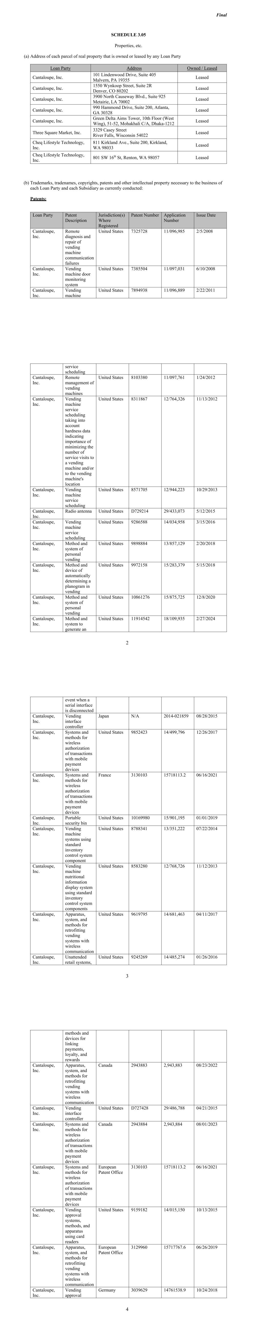 Final SCHEDULE 3.05 Properties, etc. (a) Address of each parcel of real property that is owned or leased by any Loan Party Loan Party Address Owned / Leased Cantaloupe, Inc. 101 Lindenwood Drive, Suite 405 Malvern, PA 19355 Leased Cantaloupe, Inc. 1550 Wynkoop Street, Suite 2R Denver, CO 80202 Leased Cantaloupe, Inc. 3900 North Causeway Blvd., Suite 925 Metairie, LA 70002 Leased Cantaloupe, Inc. 990 Hammond Drive, Suite 200, Atlanta, GA 30328 Leased Cantaloupe, Inc. Green Delta Aims Tower, 10th Floor (West Wing), 51-52, Mohakhali C/A, Dhaka-1212 Leased Three Square Market, Inc. 3329 Casey Street River Falls, Wisconsin 54022 Leased Cheq Lifestyle Technology, Inc. 811 Kirkland Ave., Suite 200, Kirkland, WA 98033 Leased Cheq Lifestyle Technology, Inc. 801 SW 16th St, Renton, WA 98057 Leased (b) Trademarks, tradenames, copyrights, patents and other intellectual property necessary to the business of each Loan Party and each Subsidiary as currently conducted: Patents: Loan Party Patent Description Jurisdiction(s) Where Registered Patent Number Application Number Issue Date Cantaloupe, Inc. Remote diagnosis and repair of vending machine communication failures United States 7325728 11/096,985 2/5/2008 Cantaloupe, Inc. Vending machine door monitoring system United States 7385504 11/097,031 6/10/2008 Cantaloupe, Inc. Vending machine United States 7894938 11/096,889 2/22/2011 2 service scheduling Cantaloupe, Inc. Remote management of vending machines United States 8103380 11/097,761 1/24/2012 Cantaloupe, Inc. Vending machine service scheduling taking into account hardness data indicating importance of minimizing the number of service visits to a vending machine and/or to the vending machine's location United States 8311867 12/764,326 11/13/2012 Cantaloupe, Inc. Vending machine service scheduling United States 8571705 12/944,223 10/29/2013 Cantaloupe, Inc. Radio antenna United States D729214 29/433,073 5/12/2015 Cantaloupe, Inc. Vending machine service scheduling United States 9286588 14/034,958 3/15/2016 Cantaloupe, Inc. Method and system of personal vending United States 9898884 13/857,129 2/20/2018 Cantaloupe, Inc. Method and device of automatically determining a planogram in vending United States 9972158 15/283,379 5/15/2018 Cantaloupe, Inc. Method and system of personal vending United States 10861276 15/875,725 12/8/2020 Cantaloupe, Inc. Method and system to generate an United States 11914542 18/109,935 2/27/2024 3 event when a serial interface is disconnected Cantaloupe, Inc. Vending interface controller Japan N/A 2014-021859 08/28/2015 Cantaloupe, Inc. Systems and methods for wireless authorization of transactions with mobile payment devices United States 9852423 14/499,796 12/26/2017 Cantaloupe, Inc. Systems and methods for wireless authorization of transactions with mobile payment devices France 3130103 15718113.2 06/16/2021 Cantaloupe, Inc. Portable security bin United States 10169980 15/901,195 01/01/2019 Cantaloupe, Inc. Vending machine systems using standard inventory control system component United States 8788341 13/351,222 07/22/2014 Cantaloupe, Inc. Vending machine nutritional information display system using standard inventory control system components United States 8583280 12/768,726 11/12/2013 Cantaloupe, Inc. Apparatus, system, and methods for retrofitting vending systems with wireless communication United States 9619795 14/681,463 04/11/2017 Cantaloupe, Inc. Unattended retail systems, United States 9245269 14/485,274 01/26/2016 4 methods and devices for linking payments, loyalty, and rewards Cantaloupe, Inc. Apparatus, system, and methods for retrofitting vending systems with wireless communication Canada 2943883 2,943,883 08/23/2022 Cantaloupe, Inc. Vending interface controller United States D727428 29/486,788 04/21/2015 Cantaloupe, Inc. Systems and methods for wireless authorization of transactions with mobile payment devices Canada 2943884 2,943,884 08/01/2023 Cantaloupe, Inc. Systems and methods for wireless authorization of transactions with mobile payment devices European Patent Office 3130103 15718113.2 06/16/2021 Cantaloupe, Inc. Vending approval systems, methods, and apparatus using card readers United States 9159182 14/015,150 10/13/2015 Cantaloupe, Inc. Apparatus, system, and methods for retrofitting vending systems with wireless communication European Patent Office 3129960 15717767.6 06/26/2019 Cantaloupe, Inc. Vending approval Germany 3039629 14761538.9 10/24/2018
