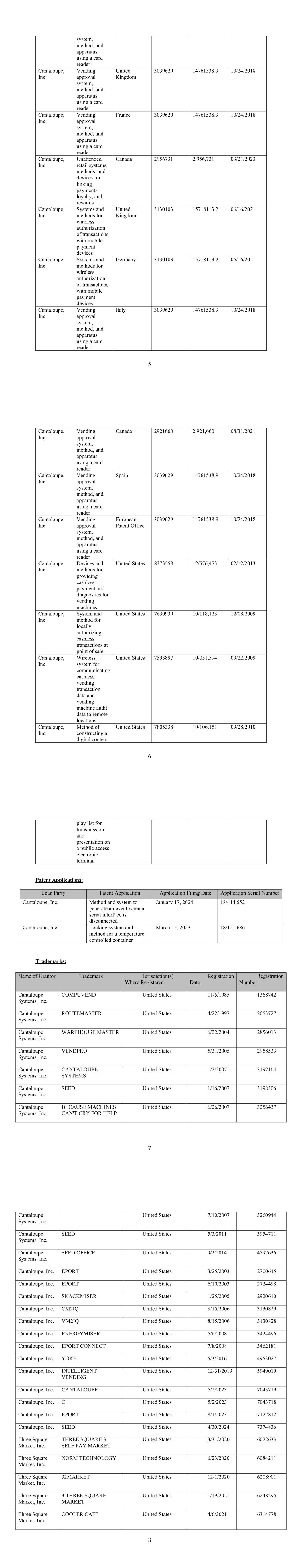 5 system, method, and apparatus using a card reader Cantaloupe, Inc. Vending approval system, method, and apparatus using a card reader United Kingdom 3039629 14761538.9 10/24/2018 Cantaloupe, Inc. Vending approval system, method, and apparatus using a card reader France 3039629 14761538.9 10/24/2018 Cantaloupe, Inc. Unattended retail systems, methods, and devices for linking payments, loyalty, and rewards Canada 2956731 2,956,731 03/21/2023 Cantaloupe, Inc. Systems and methods for wireless authorization of transactions with mobile payment devices United Kingdom 3130103 15718113.2 06/16/2021 Cantaloupe, Inc. Systems and methods for wireless authorization of transactions with mobile payment devices Germany 3130103 15718113.2 06/16/2021 Cantaloupe, Inc. Vending approval system, method, and apparatus using a card reader Italy 3039629 14761538.9 10/24/2018 6 Cantaloupe, Inc. Vending approval system, method, and apparatus using a card reader Canada 2921660 2,921,660 08/31/2021 Cantaloupe, Inc. Vending approval system, method, and apparatus using a card reader Spain 3039629 14761538.9 10/24/2018 Cantaloupe, Inc. Vending approval system, method, and apparatus using a card reader European Patent Office 3039629 14761538.9 10/24/2018 Cantaloupe, Inc. Devices and methods for providing cashless payment and diagnostics for vending machines United States 8373558 12/576,473 02/12/2013 Cantaloupe, Inc. System and method for locally authorizing cashless transactions at point of sale United States 7630939 10/118,123 12/08/2009 Cantaloupe, Inc. Wireless system for communicating cashless vending transaction data and vending machine audit data to remote locations United States 7593897 10/051,594 09/22/2009 Cantaloupe, Inc. Method of constructing a digital content United States 7805338 10/106,151 09/28/2010 7 play list for transmission and presentation on a public access electronic terminal Patent Applications: Loan Party Patent Application Application Filing Date Application Serial Number Cantaloupe, Inc. Method and system to generate an event when a serial interface is disconnected January 17, 2024 18/414,552 Cantaloupe, Inc. Locking system and method for a temperature- controlled container March 15, 2023 18/121,686 Trademarks: Name of Grantor Trademark Jurisdiction(s) Where Registered Registration Date Registration Number Cantaloupe Systems, Inc. COMPUVEND United States 11/5/1985 1368742 Cantaloupe Systems, Inc. ROUTEMASTER United States 4/22/1997 2053727 Cantaloupe Systems, Inc. WAREHOUSE MASTER United States 6/22/2004 2856013 Cantaloupe Systems, Inc. VENDPRO United States 5/31/2005 2958533 Cantaloupe Systems, Inc. CANTALOUPE SYSTEMS United States 1/2/2007 3192164 Cantaloupe Systems, Inc. SEED United States 1/16/2007 3198306 Cantaloupe Systems, Inc. BECAUSE MACHINES CAN'T CRY FOR HELP United States 6/26/2007 3256437 8 Cantaloupe Systems, Inc. United States 7/10/2007 3260944 Cantaloupe Systems, Inc. SEED United States 5/3/2011 3954711 Cantaloupe Systems, Inc. SEED OFFICE United States 9/2/2014 4597636 Cantaloupe, Inc. EPORT United States 3/25/2003 2700645 Cantaloupe, Inc. EPORT United States 6/10/2003 2724498 Cantaloupe, Inc. SNACKMISER United States 1/25/2005 2920610 Cantaloupe, Inc. CM2IQ United States 8/15/2006 3130829 Cantaloupe, Inc. VM2IQ United States 8/15/2006 3130828 Cantaloupe, Inc. ENERGYMISER United States 5/6/2008 3424496 Cantaloupe, Inc. EPORT CONNECT United States 7/8/2008 3462181 Cantaloupe, Inc. YOKE United States 5/3/2016 4953027 Cantaloupe, Inc. INTELLIGENT VENDING United States 12/31/2019 5949019 Cantaloupe, Inc. CANTALOUPE United States 5/2/2023 7043719 Cantaloupe, Inc. C United States 5/2/2023 7043718 Cantaloupe, Inc. EPORT United States 8/1/2023 7127812 Cantaloupe, Inc. SEED United States 4/30/2024 7374836 Three Square Market, Inc. THREE SQUARE 3 SELF PAY MARKET United States 3/31/2020 6022633 Three Square Market, Inc. NORM TECHNOLOGY United States 6/23/2020 6084211 Three Square Market, Inc. 32MARKET United States 12/1/2020 6208901 Three Square Market, Inc. 3 THREE SQUARE MARKET United States 1/19/2021 6248295 Three Square Market, Inc. COOLER CAFE United States 4/6/2021 6314778