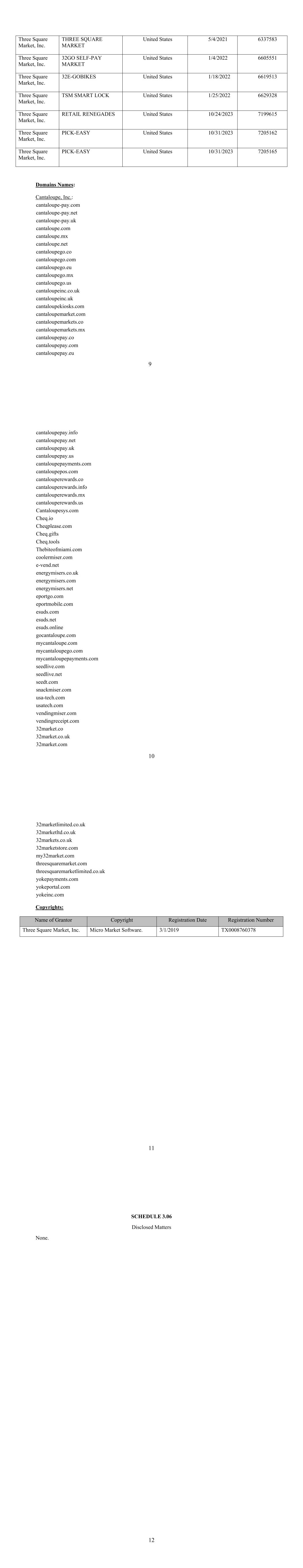 9 Three Square Market, Inc. THREE SQUARE MARKET United States 5/4/2021 6337583 Three Square Market, Inc. 32GO SELF-PAY MARKET United States 1/4/2022 6605551 Three Square Market, Inc. 32E-GOBIKES United States 1/18/2022 6619513 Three Square Market, Inc. TSM SMART LOCK United States 1/25/2022 6629328 Three Square Market, Inc. RETAIL RENEGADES United States 10/24/2023 7199615 Three Square Market, Inc. PICK-EASY United States 10/31/2023 7205162 Three Square Market, Inc. PICK-EASY United States 10/31/2023 7205165 Domains Names: Cantaloupe, Inc.: cantaloupe-pay.com cantaloupe-pay.net cantaloupe-pay.uk cantaloupe.com cantaloupe.mx cantaloupe.net cantaloupego.co cantaloupego.com cantaloupego.eu cantaloupego.mx cantaloupego.us cantaloupeinc.co.uk cantaloupeinc.uk cantaloupekiosks.com cantaloupemarket.com cantaloupemarkets.co cantaloupemarkets.mx cantaloupepay.co cantaloupepay.com cantaloupepay.eu 10 cantaloupepay.info cantaloupepay.net cantaloupepay.uk cantaloupepay.us cantaloupepayments.com cantaloupepos.com cantalouperewards.co cantalouperewards.info cantalouperewards.mx cantalouperewards.us Cantaloupesys.com Cheq.io Cheqplease.com Cheq.gifts Cheq.tools Thebiteofmiami.com coolermiser.com e-vend.net energymisers.co.uk energymisers.com energymisers.net eportgo.com eportmobile.com esuds.com esuds.net esuds.online gocantaloupe.com mycantaloupe.com mycantaloupego.com mycantaloupepayments.com seedlive.com seedlive.net seedt.com snackmiser.com usa-tech.com usatech.com vendingmiser.com vendingreceipt.com 32market.co 32market.co.uk 32market.com 11 32marketlimited.co.uk 32marketltd.co.uk 32markets.co.uk 32marketstore.com my32market.com threesquaremarket.com threesquaremarketlimited.co.uk yokepayments.com yokeportal.com yokeinc.com Copyrights: Name of Grantor Copyright Registration Date Registration Number Three Square Market, Inc. Micro Market Software. 3/1/2019 TX0008760378 12 SCHEDULE 3.06 Disclosed Matters None.