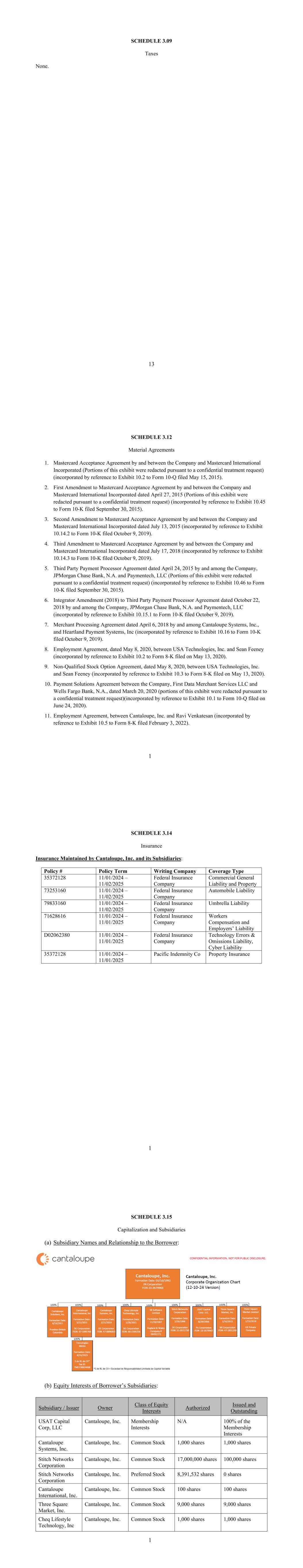 13 SCHEDULE 3.09 Taxes None. 1 SCHEDULE 3.12 Material Agreements 1. Mastercard Acceptance Agreement by and between the Company and Mastercard International Incorporated (Portions of this exhibit were redacted pursuant to a confidential treatment request) (incorporated by reference to Exhibit 10.2 to Form 10‑Q filed May 15, 2015). 2. First Amendment to Mastercard Acceptance Agreement by and between the Company and Mastercard International Incorporated dated April 27, 2015 (Portions of this exhibit were redacted pursuant to a confidential treatment request) (incorporated by reference to Exhibit 10.45 to Form 10‑K filed September 30, 2015). 3. Second Amendment to Mastercard Acceptance Agreement by and between the Company and Mastercard International Incorporated dated July 13, 2015 (incorporated by reference to Exhibit 10.14.2 to Form 10‑K filed October 9, 2019). 4. Third Amendment to Mastercard Acceptance Agreement by and between the Company and Mastercard International Incorporated dated July 17, 2018 (incorporated by reference to Exhibit 10.14.3 to Form 10‑K filed October 9, 2019). 5. Third Party Payment Processor Agreement dated April 24, 2015 by and among the Company, JPMorgan Chase Bank, N.A. and Paymentech, LLC (Portions of this exhibit were redacted pursuant to a confidential treatment request) (incorporated by reference to Exhibit 10.46 to Form 10‑K filed September 30, 2015). 6. Integrator Amendment (2018) to Third Party Payment Processor Agreement dated October 22, 2018 by and among the Company, JPMorgan Chase Bank, N.A. and Paymentech, LLC (incorporated by reference to Exhibit 10.15.1 to Form 10‑K filed October 9, 2019). 7. Merchant Processing Agreement dated April 6, 2018 by and among Cantaloupe Systems, Inc., and Heartland Payment Systems, Inc (incorporated by reference to Exhibit 10.16 to Form 10‑K filed October 9, 2019). 8. Employment Agreement, dated May 8, 2020, between USA Technologies, Inc. and Sean Feeney (incorporated by reference to Exhibit 10.2 to Form 8-K filed on May 13, 2020). 9. Non-Qualified Stock Option Agreement, dated May 8, 2020, between USA Technologies, Inc. and Sean Feeney (incorporated by reference to Exhibit 10.3 to Form 8-K filed on May 13, 2020). 10. Payment Solutions Agreement between the Company, First Data Merchant Services LLC and Wells Fargo Bank, N.A., dated March 20, 2020 (portions of this exhibit were redacted pursuant to a confidential treatment request)(incorporated by reference to Exhibit 10.1 to Form 10-Q filed on June 24, 2020). 11. Employment Agreement, between Cantaloupe, Inc. and Ravi Venkatesan (incorporated by reference to Exhibit 10.5 to Form 8-K filed February 3, 2022). 1 SCHEDULE 3.14 Insurance Insurance Maintained by Cantaloupe, Inc. and its Subsidiaries: Policy # Policy Term Writing Company Coverage Type 35372128 11/01/2024 – 11/02/2025 Federal Insurance Company Commercial General Liability and Property 73253160 11/01/2024 – 11/02/2025 Federal Insurance Company Automobile Liability 79833160 11/01/2024 – 11/02/2025 Federal Insurance Company Umbrella Liability 71628616 11/01/2024 – 11/01/2025 Federal Insurance Company Workers Compensation and Employers’ Liability D02062380 11/01/2024 – 11/01/2025 Federal Insurance Company Technology Errors & Omissions Liability, Cyber Liability 35372128 11/01/2024 – 11/01/2025 Pacific Indemnity Co Property Insurance 1 SCHEDULE 3.15 Capitalization and Subsidiaries (a) Subsidiary Names and Relationship to the Borrower: (b) Equity Interests of Borrower’s Subsidiaries: Subsidiary / Issuer Owner Class of Equity Interests Authorized Issued and Outstanding USAT Capital Corp, LLC Cantaloupe, Inc. Membership Interests N/A 100% of the Membership Interests Cantaloupe Systems, Inc. Cantaloupe, Inc. Common Stock 1,000 shares 1,000 shares Stitch Networks Corporation Cantaloupe, Inc. Common Stock 17,000,000 shares 100,000 shares Stitch Networks Corporation Cantaloupe, Inc. Preferred Stock 8,391,532 shares 0 shares Cantaloupe International, Inc. Cantaloupe, Inc. Common Stock 100 shares 100 shares Three Square Market, Inc. Cantaloupe, Inc. Common Stock 9,000 shares 9,000 shares Cheq Lifestyle Technology, Inc Cantaloupe, Inc. Common Stock 1,000 shares 1,000 shares