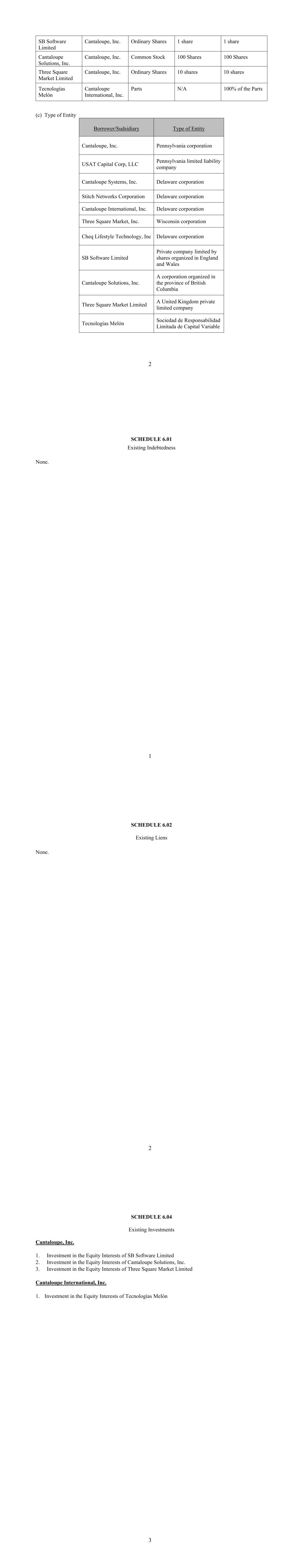 2 SB Software Limited Cantaloupe, Inc. Ordinary Shares 1 share 1 share Cantaloupe Solutions, Inc. Cantaloupe, Inc. Common Stock 100 Shares 100 Shares Three Square Market Limited Cantaloupe, Inc. Ordinary Shares 10 shares 10 shares Tecnologías Melón Cantaloupe International, Inc. Parts N/A 100% of the Parts (c) Type of Entity Borrower/Sudsidiary Type of Entity Cantaloupe, Inc. Pennsylvania corporation USAT Capital Corp, LLC Pennsylvania limited liability company Cantaloupe Systems, Inc. Delaware corporation Stitch Networks Corporation Delaware corporation Cantaloupe International, Inc. Delaware corporation Three Square Market, Inc. Wisconsin corporation Cheq Lifestyle Technology, Inc Delaware corporation SB Software Limited Private company limited by shares organized in England and Wales Cantaloupe Solutions, Inc. A corporation organized in the province of British Columbia Three Square Market Limited A United Kingdom private limited company Tecnologías Melón Sociedad de Responsabilidad Limitada de Capital Variable 1 SCHEDULE 6.01 Existing Indebtedness None. 2 SCHEDULE 6.02 Existing Liens None. 3 SCHEDULE 6.04 Existing Investments Cantaloupe, Inc. 1. Investment in the Equity Interests of SB Software Limited 2. Investment in the Equity Interests of Cantaloupe Solutions, Inc. 3. Investment in the Equity Interests of Three Square Market Limited Cantaloupe International, Inc. 1. Investment in the Equity Interests of Tecnologías Melón