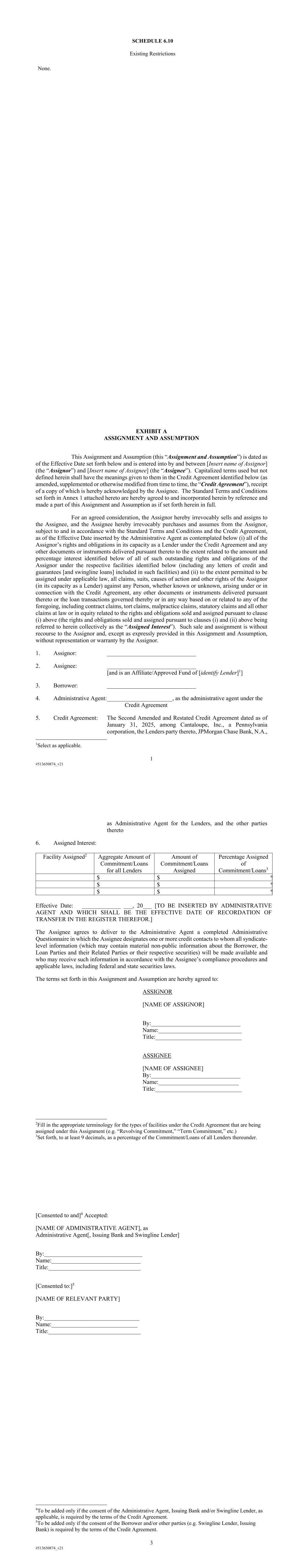 SCHEDULE 6.10 Existing Restrictions None. 1 #513650874_v21 EXHIBIT A ASSIGNMENT AND ASSUMPTION This Assignment and Assumption (this “Assignment and Assumption”) is dated as of the Effective Date set forth below and is entered into by and between [Insert name of Assignor] (the “Assignor”) and [Insert name of Assignee] (the “Assignee”). Capitalized terms used but not defined herein shall have the meanings given to them in the Credit Agreement identified below (as amended, supplemented or otherwise modified from time to time, the “Credit Agreement”), receipt of a copy of which is hereby acknowledged by the Assignee. The Standard Terms and Conditions set forth in Annex 1 attached hereto are hereby agreed to and incorporated herein by reference and made a part of this Assignment and Assumption as if set forth herein in full. For an agreed consideration, the Assignor hereby irrevocably sells and assigns to the Assignee, and the Assignee hereby irrevocably purchases and assumes from the Assignor, subject to and in accordance with the Standard Terms and Conditions and the Credit Agreement, as of the Effective Date inserted by the Administrative Agent as contemplated below (i) all of the Assignor’s rights and obligations in its capacity as a Lender under the Credit Agreement and any other documents or instruments delivered pursuant thereto to the extent related to the amount and percentage interest identified below of all of such outstanding rights and obligations of the Assignor under the respective facilities identified below (including any letters of credit and guarantees [and swingline loans] included in such facilities) and (ii) to the extent permitted to be assigned under applicable law, all claims, suits, causes of action and other rights of the Assignor (in its capacity as a Lender) against any Person, whether known or unknown, arising under or in connection with the Credit Agreement, any other documents or instruments delivered pursuant thereto or the loan transactions governed thereby or in any way based on or related to any of the foregoing, including contract claims, tort claims, malpractice claims, statutory claims and all other claims at law or in equity related to the rights and obligations sold and assigned pursuant to clause (i) above (the rights and obligations sold and assigned pursuant to clauses (i) and (ii) above being referred to herein collectively as the “Assigned Interest”). Such sale and assignment is without recourse to the Assignor and, except as expressly provided in this Assignment and Assumption, without representation or warranty by the Assignor. 1. Assignor: ______________________________ 2. Assignee: ______________________________ [and is an Affiliate/Approved Fund of [identify Lender]1] 3. Borrower: ______________________________ 4. Administrative Agent: ______________________, as the administrative agent under the Credit Agreement 5. Credit Agreement: The Second Amended and Restated Credit Agreement dated as of January 31, 2025, among Cantaloupe, Inc., a Pennsylvania corporation, the Lenders party thereto, JPMorgan Chase Bank, N.A., 1Select as applicable. as Administrative Agent for the Lenders, and the other parties thereto 6. Assigned Interest: Facility Assigned2 Aggregate Amount of Commitment/Loans for all Lenders Amount of Commitment/Loans Assigned Percentage Assigned of Commitment/Loans3 $ $ % $ $ % $ $ % Effective Date: _____________ ___, 20___ [TO BE INSERTED BY ADMINISTRATIVE AGENT AND WHICH SHALL BE THE EFFECTIVE DATE OF RECORDATION OF TRANSFER IN THE REGISTER THEREFOR.] The Assignee agrees to deliver to the Administrative Agent a completed Administrative Questionnaire in which the Assignee designates one or more credit contacts to whom all syndicate- level information (which may contain material non-public information about the Borrower, the Loan Parties and their Related Parties or their respective securities) will be made available and who may receive such information in accordance with the Assignee’s compliance procedures and applicable laws, including federal and state securities laws. The terms set forth in this Assignment and Assumption are hereby agreed to: ASSIGNOR [NAME OF ASSIGNOR] By:______________________________ Name:____________________________ Title:_____________________________ ASSIGNEE [NAME OF ASSIGNEE] By:______________________________ Name:___________________________ Title:_____________________________ 2Fill in the appropriate terminology for the types of facilities under the Credit Agreement that are being assigned under this Assignment (e.g. “Revolving Commitment,” “Term Commitment,” etc.) 3Set forth, to at least 9 decimals, as a percentage of the Commitment/Loans of all Lenders thereunder. 3 #513650874_v21 [Consented to and]4 Accepted: [NAME OF ADMINISTRATIVE AGENT], as Administrative Agent[, Issuing Bank and Swingline Lender] By:_________________________________ Name:______________________________ Title:_______________________________ [Consented to:]5 [NAME OF RELEVANT PARTY] By:________________________________ Name:_____________________________ Title:_______________________________ 4To be added only if the consent of the Administrative Agent, Issuing Bank and/or Swingline Lender, as applicable, is required by the terms of the Credit Agreement. 5To be added only if the consent of the Borrower and/or other parties (e.g. Swingline Lender, Issuing Bank) is required by the terms of the Credit Agreement.