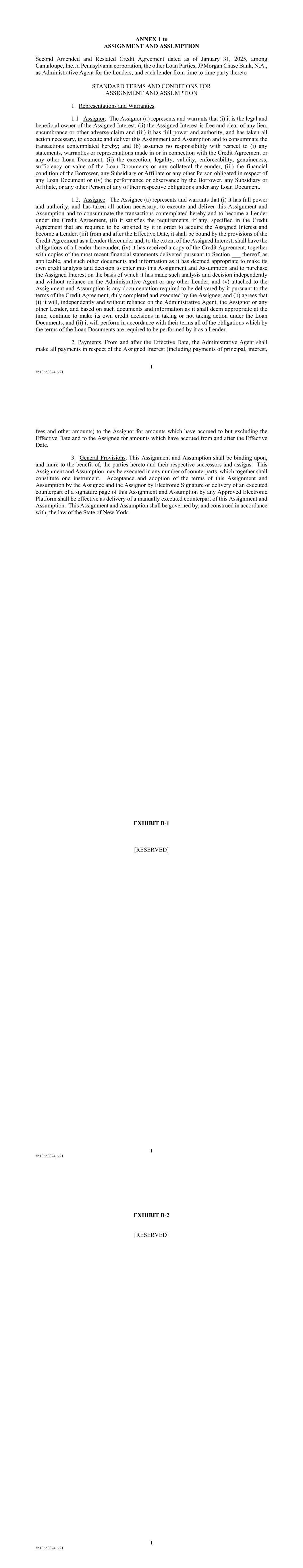 1 #513650874_v21 ANNEX 1 to ASSIGNMENT AND ASSUMPTION Second Amended and Restated Credit Agreement dated as of January 31, 2025, among Cantaloupe, Inc., a Pennsylvania corporation, the other Loan Parties, JPMorgan Chase Bank, N.A., as Administrative Agent for the Lenders, and each lender from time to time party thereto STANDARD TERMS AND CONDITIONS FOR ASSIGNMENT AND ASSUMPTION 1. Representations and Warranties. 1.1 Assignor. The Assignor (a) represents and warrants that (i) it is the legal and beneficial owner of the Assigned Interest, (ii) the Assigned Interest is free and clear of any lien, encumbrance or other adverse claim and (iii) it has full power and authority, and has taken all action necessary, to execute and deliver this Assignment and Assumption and to consummate the transactions contemplated hereby; and (b) assumes no responsibility with respect to (i) any statements, warranties or representations made in or in connection with the Credit Agreement or any other Loan Document, (ii) the execution, legality, validity, enforceability, genuineness, sufficiency or value of the Loan Documents or any collateral thereunder, (iii) the financial condition of the Borrower, any Subsidiary or Affiliate or any other Person obligated in respect of any Loan Document or (iv) the performance or observance by the Borrower, any Subsidiary or Affiliate, or any other Person of any of their respective obligations under any Loan Document. 1.2. Assignee. The Assignee (a) represents and warrants that (i) it has full power and authority, and has taken all action necessary, to execute and deliver this Assignment and Assumption and to consummate the transactions contemplated hereby and to become a Lender under the Credit Agreement, (ii) it satisfies the requirements, if any, specified in the Credit Agreement that are required to be satisfied by it in order to acquire the Assigned Interest and become a Lender, (iii) from and after the Effective Date, it shall be bound by the provisions of the Credit Agreement as a Lender thereunder and, to the extent of the Assigned Interest, shall have the obligations of a Lender thereunder, (iv) it has received a copy of the Credit Agreement, together with copies of the most recent financial statements delivered pursuant to Section ___ thereof, as applicable, and such other documents and information as it has deemed appropriate to make its own credit analysis and decision to enter into this Assignment and Assumption and to purchase the Assigned Interest on the basis of which it has made such analysis and decision independently and without reliance on the Administrative Agent or any other Lender, and (v) attached to the Assignment and Assumption is any documentation required to be delivered by it pursuant to the terms of the Credit Agreement, duly completed and executed by the Assignee; and (b) agrees that (i) it will, independently and without reliance on the Administrative Agent, the Assignor or any other Lender, and based on such documents and information as it shall deem appropriate at the time, continue to make its own credit decisions in taking or not taking action under the Loan Documents, and (ii) it will perform in accordance with their terms all of the obligations which by the terms of the Loan Documents are required to be performed by it as a Lender. 2. Payments. From and after the Effective Date, the Administrative Agent shall make all payments in respect of the Assigned Interest (including payments of principal, interest, fees and other amounts) to the Assignor for amounts which have accrued to but excluding the Effective Date and to the Assignee for amounts which have accrued from and after the Effective Date. 3. General Provisions. This Assignment and Assumption shall be binding upon, and inure to the benefit of, the parties hereto and their respective successors and assigns. This Assignment and Assumption may be executed in any number of counterparts, which together shall constitute one instrument. Acceptance and adoption of the terms of this Assignment and Assumption by the Assignee and the Assignor by Electronic Signature or delivery of an executed counterpart of a signature page of this Assignment and Assumption by any Approved Electronic Platform shall be effective as delivery of a manually executed counterpart of this Assignment and Assumption. This Assignment and Assumption shall be governed by, and construed in accordance with, the law of the State of New York. 1 #513650874_v21 EXHIBIT B-1 [RESERVED] 1 #513650874_v21 EXHIBIT B-2 [RESERVED]