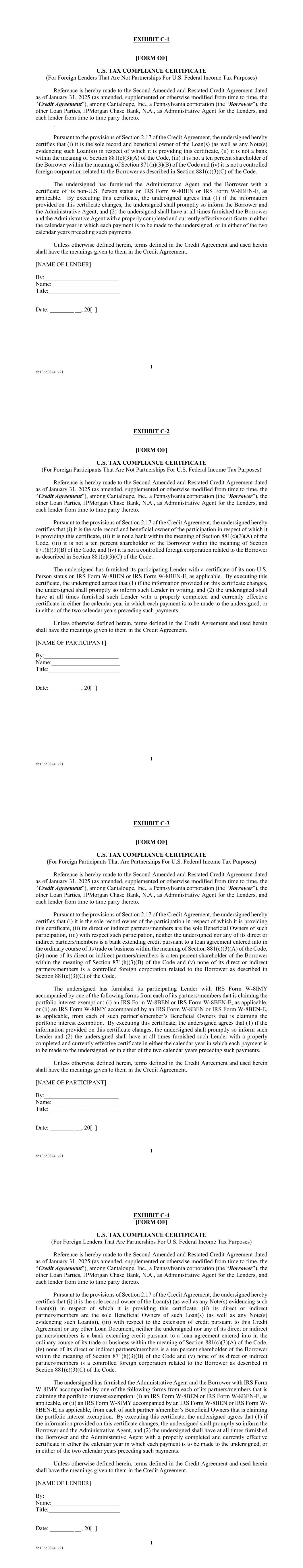 1 #513650874_v21 EXHIBIT C-1 [FORM OF] U.S. TAX COMPLIANCE CERTIFICATE (For Foreign Lenders That Are Not Partnerships For U.S. Federal Income Tax Purposes) Reference is hereby made to the Second Amended and Restated Credit Agreement dated as of January 31, 2025 (as amended, supplemented or otherwise modified from time to time, the “Credit Agreement”), among Cantaloupe, Inc., a Pennsylvania corporation (the “Borrower”), the other Loan Parties, JPMorgan Chase Bank, N.A., as Administrative Agent for the Lenders, and each lender from time to time party thereto. . Pursuant to the provisions of Section 2.17 of the Credit Agreement, the undersigned hereby certifies that (i) it is the sole record and beneficial owner of the Loan(s) (as well as any Note(s) evidencing such Loan(s)) in respect of which it is providing this certificate, (ii) it is not a bank within the meaning of Section 881(c)(3)(A) of the Code, (iii) it is not a ten percent shareholder of the Borrower within the meaning of Section 871(h)(3)(B) of the Code and (iv) it is not a controlled foreign corporation related to the Borrower as described in Section 881(c)(3)(C) of the Code. The undersigned has furnished the Administrative Agent and the Borrower with a certificate of its non-U.S. Person status on IRS Form W-8BEN or IRS Form W-8BEN-E, as applicable. By executing this certificate, the undersigned agrees that (1) if the information provided on this certificate changes, the undersigned shall promptly so inform the Borrower and the Administrative Agent, and (2) the undersigned shall have at all times furnished the Borrower and the Administrative Agent with a properly completed and currently effective certificate in either the calendar year in which each payment is to be made to the undersigned, or in either of the two calendar years preceding such payments. Unless otherwise defined herein, terms defined in the Credit Agreement and used herein shall have the meanings given to them in the Credit Agreement. [NAME OF LENDER] By:_________________________ Name:_______________________ Title:________________________ Date: ________ __, 20[ ] 1 #513650874_v21 EXHIBIT C-2 [FORM OF] U.S. TAX COMPLIANCE CERTIFICATE (For Foreign Participants That Are Not Partnerships For U.S. Federal Income Tax Purposes) Reference is hereby made to the Second Amended and Restated Credit Agreement dated as of January 31, 2025 (as amended, supplemented or otherwise modified from time to time, the “Credit Agreement”), among Cantaloupe, Inc., a Pennsylvania corporation (the “Borrower”), the other Loan Parties, JPMorgan Chase Bank, N.A., as Administrative Agent for the Lenders, and each lender from time to time party thereto. Pursuant to the provisions of Section 2.17 of the Credit Agreement, the undersigned hereby certifies that (i) it is the sole record and beneficial owner of the participation in respect of which it is providing this certificate, (ii) it is not a bank within the meaning of Section 881(c)(3)(A) of the Code, (iii) it is not a ten percent shareholder of the Borrower within the meaning of Section 871(h)(3)(B) of the Code, and (iv) it is not a controlled foreign corporation related to the Borrower as described in Section 881(c)(3)(C) of the Code. The undersigned has furnished its participating Lender with a certificate of its non-U.S. Person status on IRS Form W-8BEN or IRS Form W-8BEN-E, as applicable. By executing this certificate, the undersigned agrees that (1) if the information provided on this certificate changes, the undersigned shall promptly so inform such Lender in writing, and (2) the undersigned shall have at all times furnished such Lender with a properly completed and currently effective certificate in either the calendar year in which each payment is to be made to the undersigned, or in either of the two calendar years preceding such payments. Unless otherwise defined herein, terms defined in the Credit Agreement and used herein shall have the meanings given to them in the Credit Agreement. [NAME OF PARTICIPANT] By:_________________________ Name:_______________________ Title:________________________ Date: ________ __, 20[ ] 1 #513650874_v21 EXHIBIT C-3 [FORM OF] U.S. TAX COMPLIANCE CERTIFICATE (For Foreign Participants That Are Partnerships For U.S. Federal Income Tax Purposes) Reference is hereby made to the Second Amended and Restated Credit Agreement dated as of January 31, 2025 (as amended, supplemented or otherwise modified from time to time, the “Credit Agreement”), among Cantaloupe, Inc., a Pennsylvania corporation (the “Borrower”), the other Loan Parties, JPMorgan Chase Bank, N.A., as Administrative Agent for the Lenders, and each lender from time to time party thereto. Pursuant to the provisions of Section 2.17 of the Credit Agreement, the undersigned hereby certifies that (i) it is the sole record owner of the participation in respect of which it is providing this certificate, (ii) its direct or indirect partners/members are the sole Beneficial Owners of such participation, (iii) with respect such participation, neither the undersigned nor any of its direct or indirect partners/members is a bank extending credit pursuant to a loan agreement entered into in the ordinary course of its trade or business within the meaning of Section 881(c)(3)(A) of the Code, (iv) none of its direct or indirect partners/members is a ten percent shareholder of the Borrower within the meaning of Section 871(h)(3)(B) of the Code and (v) none of its direct or indirect partners/members is a controlled foreign corporation related to the Borrower as described in Section 881(c)(3)(C) of the Code. The undersigned has furnished its participating Lender with IRS Form W-8IMY accompanied by one of the following forms from each of its partners/members that is claiming the portfolio interest exemption: (i) an IRS Form W-8BEN or IRS Form W-8BEN-E, as applicable, or (ii) an IRS Form W-8IMY accompanied by an IRS Form W-8BEN or IRS Form W-8BE