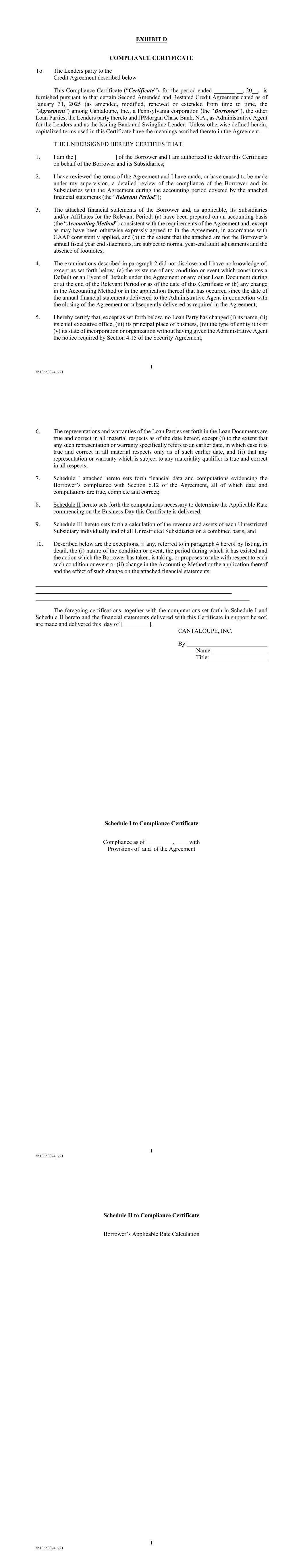 1 #513650874_v21 EXHIBIT D COMPLIANCE CERTIFICATE To: The Lenders party to the Credit Agreement described below This Compliance Certificate (“Certificate”), for the period ended _______ __, 20__, is furnished pursuant to that certain Second Amended and Restated Credit Agreement dated as of January 31, 2025 (as amended, modified, renewed or extended from time to time, the “Agreement”) among Cantaloupe, Inc., a Pennsylvania corporation (the “Borrower”), the other Loan Parties, the Lenders party thereto and JPMorgan Chase Bank, N.A., as Administrative Agent for the Lenders and as the Issuing Bank and Swingline Lender. Unless otherwise defined herein, capitalized terms used in this Certificate have the meanings ascribed thereto in the Agreement. THE UNDERSIGNED HEREBY CERTIFIES THAT: 1. I am the [ ] of the Borrower and I am authorized to deliver this Certificate on behalf of the Borrower and its Subsidiaries; 2. I have reviewed the terms of the Agreement and I have made, or have caused to be made under my supervision, a detailed review of the compliance of the Borrower and its Subsidiaries with the Agreement during the accounting period covered by the attached financial statements (the “Relevant Period”); 3. The attached financial statements of the Borrower and, as applicable, its Subsidiaries and/or Affiliates for the Relevant Period: (a) have been prepared on an accounting basis (the “Accounting Method”) consistent with the requirements of the Agreement and, except as may have been otherwise expressly agreed to in the Agreement, in accordance with GAAP consistently applied, and (b) to the extent that the attached are not the Borrower’s annual fiscal year end statements, are subject to normal year-end audit adjustments and the absence of footnotes; 4. The examinations described in paragraph 2 did not disclose and I have no knowledge of, except as set forth below, (a) the existence of any condition or event which constitutes a Default or an Event of Default under the Agreement or any other Loan Document during or at the end of the Relevant Period or as of the date of this Certificate or (b) any change in the Accounting Method or in the application thereof that has occurred since the date of the annual financial statements delivered to the Administrative Agent in connection with the closing of the Agreement or subsequently delivered as required in the Agreement; 5. I hereby certify that, except as set forth below, no Loan Party has changed (i) its name, (ii) its chief executive office, (iii) its principal place of business, (iv) the type of entity it is or (v) its state of incorporation or organization without having given the Administrative Agent the notice required by Section 4.15 of the Security Agreement; 6. The representations and warranties of the Loan Parties set forth in the Loan Documents are true and correct in all material respects as of the date hereof, except (i) to the extent that any such representation or warranty specifically refers to an earlier date, in which case it is true and correct in all material respects only as of such earlier date, and (ii) that any representation or warranty which is subject to any materiality qualifier is true and correct in all respects; 7. Schedule I attached hereto sets forth financial data and computations evidencing the Borrower’s compliance with Section 6.12 of the Agreement, all of which data and computations are true, complete and correct; 8. Schedule II hereto sets forth the computations necessary to determine the Applicable Rate commencing on the Business Day this Certificate is delivered; 9. Schedule III hereto sets forth a calculation of the revenue and assets of each Unrestricted Subsidiary individually and of all Unrestricted Subsidiaries on a combined basis; and 10. Described below are the exceptions, if any, referred to in paragraph 4 hereof by listing, in detail, the (i) nature of the condition or event, the period during which it has existed and the action which the Borrower has taken, is taking, or proposes to take with respect to each such condition or event or (ii) change in the Accounting Method or the application thereof and the effect of such change on the attached financial statements: The foregoing certifications, together with the computations set forth in Schedule I and Schedule II hereto and the financial statements delivered with this Certificate in support hereof, are made and delivered this day of [_________]. CANTALOUPE, INC. By: Name: Title: 1 #513650874_v21 Schedule I to Compliance Certificate Compliance as of _________, ____ with Provisions of and of the Agreement 1 #513650874_v21 Schedule II to Compliance Certificate Borrower’s Applicable Rate Calculation