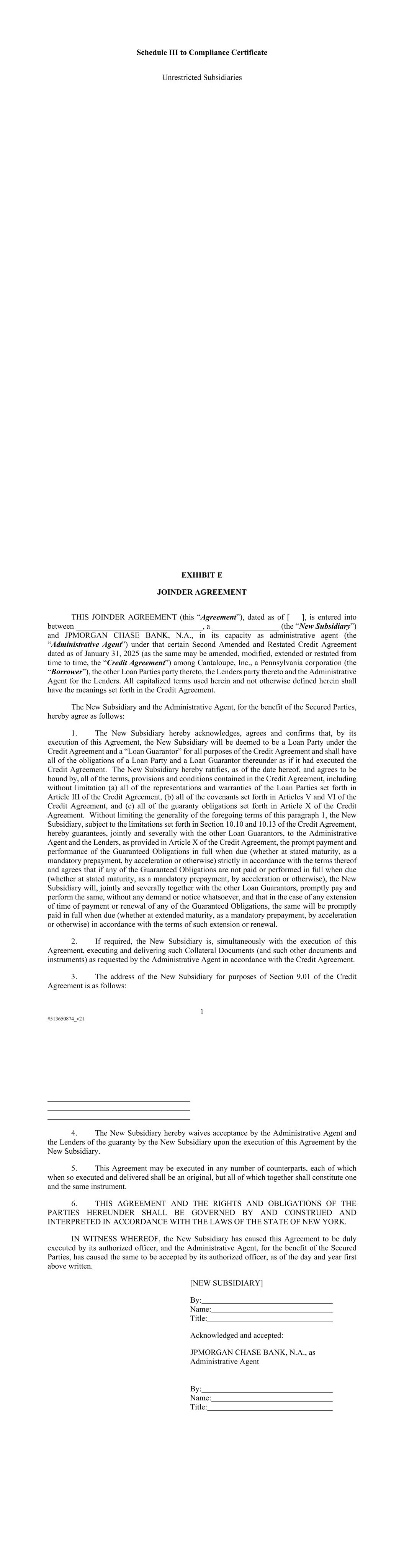 Schedule III to Compliance Certificate Unrestricted Subsidiaries 1 #513650874_v21 EXHIBIT E JOINDER AGREEMENT THIS JOINDER AGREEMENT (this “Agreement”), dated as of [ ], is entered into between ________________________________, a _________________ (the “New Subsidiary”) and JPMORGAN CHASE BANK, N.A., in its capacity as administrative agent (the “Administrative Agent”) under that certain Second Amended and Restated Credit Agreement dated as of January 31, 2025 (as the same may be amended, modified, extended or restated from time to time, the “Credit Agreement”) among Cantaloupe, Inc., a Pennsylvania corporation (the “Borrower”), the other Loan Parties party thereto, the Lenders party thereto and the Administrative Agent for the Lenders. All capitalized terms used herein and not otherwise defined herein shall have the meanings set forth in the Credit Agreement. The New Subsidiary and the Administrative Agent, for the benefit of the Secured Parties, hereby agree as follows: 1. The New Subsidiary hereby acknowledges, agrees and confirms that, by its execution of this Agreement, the New Subsidiary will be deemed to be a Loan Party under the Credit Agreement and a “Loan Guarantor” for all purposes of the Credit Agreement and shall have all of the obligations of a Loan Party and a Loan Guarantor thereunder as if it had executed the Credit Agreement. The New Subsidiary hereby ratifies, as of the date hereof, and agrees to be bound by, all of the terms, provisions and conditions contained in the Credit Agreement, including without limitation (a) all of the representations and warranties of the Loan Parties set forth in Article III of the Credit Agreement, (b) all of the covenants set forth in Articles V and VI of the Credit Agreement, and (c) all of the guaranty obligations set forth in Article X of the Credit Agreement. Without limiting the generality of the foregoing terms of this paragraph 1, the New Subsidiary, subject to the limitations set forth in Section 10.10 and 10.13 of the Credit Agreement, hereby guarantees, jointly and severally with the other Loan Guarantors, to the Administrative Agent and the Lenders, as provided in Article X of the Credit Agreement, the prompt payment and performance of the Guaranteed Obligations in full when due (whether at stated maturity, as a mandatory prepayment, by acceleration or otherwise) strictly in accordance with the terms thereof and agrees that if any of the Guaranteed Obligations are not paid or performed in full when due (whether at stated maturity, as a mandatory prepayment, by acceleration or otherwise), the New Subsidiary will, jointly and severally together with the other Loan Guarantors, promptly pay and perform the same, without any demand or notice whatsoever, and that in the case of any extension of time of payment or renewal of any of the Guaranteed Obligations, the same will be promptly paid in full when due (whether at extended maturity, as a mandatory prepayment, by acceleration or otherwise) in accordance with the terms of such extension or renewal. 2. If required, the New Subsidiary is, simultaneously with the execution of this Agreement, executing and delivering such Collateral Documents (and such other documents and instruments) as requested by the Administrative Agent in accordance with the Credit Agreement. 3. The address of the New Subsidiary for purposes of Section 9.01 of the Credit Agreement is as follows: 4. The New Subsidiary hereby waives acceptance by the Administrative Agent and the Lenders of the guaranty by the New Subsidiary upon the execution of this Agreement by the New Subsidiary. 5. This Agreement may be executed in any number of counterparts, each of which when so executed and delivered shall be an original, but all of which together shall constitute one and the same instrument. 6. THIS AGREEMENT AND THE RIGHTS AND OBLIGATIONS OF THE PARTIES HEREUNDER SHALL BE GOVERNED BY AND CONSTRUED AND INTERPRETED IN ACCORDANCE WITH THE LAWS OF THE STATE OF NEW YORK. IN WITNESS WHEREOF, the New Subsidiary has caused this Agreement to be duly executed by its authorized officer, and the Administrative Agent, for the benefit of the Secured Parties, has caused the same to be accepted by its authorized officer, as of the day and year first above written. [NEW SUBSIDIARY] By: Name: Title: Acknowledged and accepted: JPMORGAN CHASE BANK, N.A., as Administrative Agent By: Name: Title: