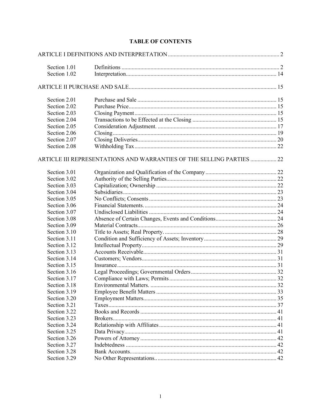 1 TABLE OF CONTENTS ARTICLE I DEFINITIONS AND INTERPRETATION ............................................................................. 2 Section 1.01 Definitions ............................................................................................................. 2 Section 1.02 Interpretation ........................................................................................................ 14 ARTICLE II PURCHASE AND SALE...................................................................................................... 15 Section 2.01 Purchase and Sale ................................................................................................ 15 Section 2.02 Purchase Price ...................................................................................................... 15 Section 2.03 Closing Payment .................................................................................................. 15 Section 2.04 Transactions to be Effected at the Closing .......................................................... 15 Section 2.05 Consideration Adjustment. .................................................................................. 17 Section 2.06 Closing ................................................................................................................. 19 Section 2.07 Closing Deliveries................................................................................................ 20 Section 2.08 Withholding Tax .................................................................................................. 22 ARTICLE III REPRESENTATIONS AND WARRANTIES OF THE SELLING PARTIES .................. 22 Section 3.01 Organization and Qualification of the Company ................................................. 22 Section 3.02 Authority of the Selling Parties............................................................................ 22 Section 3.03 Capitalization; Ownership ................................................................................... 22 Section 3.04 Subsidiaries .......................................................................................................... 23 Section 3.05 No Conflicts; Consents ........................................................................................ 23 Section 3.06 Financial Statements. ........................................................................................... 24 Section 3.07 Undisclosed Liabilities ........................................................................................ 24 Section 3.08 Absence of Certain Changes, Events and Conditions .......................................... 24 Section 3.09 Material Contracts................................................................................................ 26 Section 3.10 Title to Assets; Real Property. ............................................................................. 28 Section 3.11 Condition and Sufficiency of Assets; Inventory .................................................. 29 Section 3.12 Intellectual Property ............................................................................................. 29 Section 3.13 Accounts Receivable ............................................................................................ 31 Section 3.14 Customers; Vendors ............................................................................................. 31 Section 3.15 Insurance .............................................................................................................. 31 Section 3.16 Legal Proceedings; Governmental Orders ........................................................... 32 Section 3.17 Compliance with Laws; Permits .......................................................................... 32 Section 3.18 Environmental Matters. ....................................................................................... 32 Section 3.19 Employee Benefit Matters ................................................................................... 33 Section 3.20 Employment Matters............................................................................................ 35 Section 3.21 Taxes .................................................................................................................... 37 Section 3.22 Books and Records .............................................................................................. 41 Section 3.23 Brokers ................................................................................................................. 41 Section 3.24 Relationship with Affiliates ................................................................................. 41 Section 3.25 Data Privacy ......................................................................................................... 41 Section 3.26 Powers of Attorney .............................................................................................. 42 Section 3.27 Indebtedness ........................................................................................................ 42 Section 3.28 Bank Accounts.. ................................................................................................... 42 Section 3.29 No Other Representations.. .................................................................................. 42