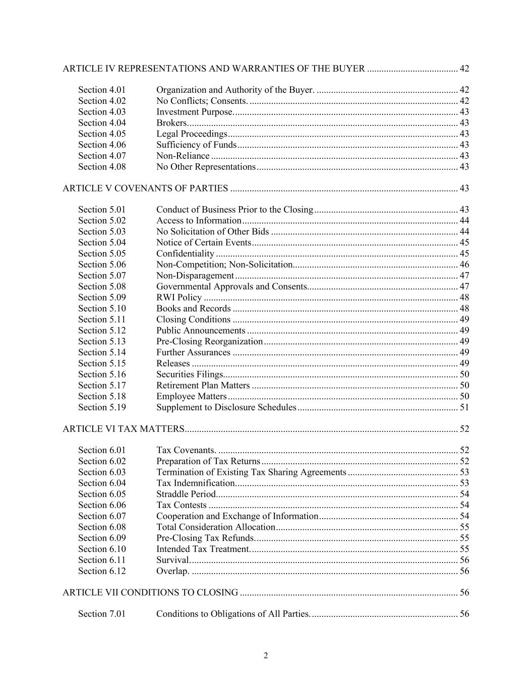2 ARTICLE IV REPRESENTATIONS AND WARRANTIES OF THE BUYER ...................................... 42 Section 4.01 Organization and Authority of the Buyer. ........................................................... 42 Section 4.02 No Conflicts; Consents. ....................................................................................... 42 Section 4.03 Investment Purpose. ............................................................................................. 43 Section 4.04 Brokers. ................................................................................................................ 43 Section 4.05 Legal Proceedings ................................................................................................ 43 Section 4.06 Sufficiency of Funds ............................................................................................ 43 Section 4.07 Non-Reliance ....................................................................................................... 43 Section 4.08 No Other Representations .................................................................................... 43 ARTICLE V COVENANTS OF PARTIES ............................................................................................... 43 Section 5.01 Conduct of Business Prior to the Closing ............................................................ 43 Section 5.02 Access to Information .......................................................................................... 44 Section 5.03 No Solicitation of Other Bids .............................................................................. 44 Section 5.04 Notice of Certain Events ...................................................................................... 45 Section 5.05 Confidentiality ..................................................................................................... 45 Section 5.06 Non-Competition; Non-Solicitation..................................................................... 46 Section 5.07 Non-Disparagement ............................................................................................. 47 Section 5.08 Governmental Approvals and Consents............................................................... 47 Section 5.09 RWI Policy .......................................................................................................... 48 Section 5.10 Books and Records .............................................................................................. 48 Section 5.11 Closing Conditions .............................................................................................. 49 Section 5.12 Public Announcements ........................................................................................ 49 Section 5.13 Pre-Closing Reorganization ................................................................................. 49 Section 5.14 Further Assurances .............................................................................................. 49 Section 5.15 Releases ............................................................................................................... 49 Section 5.16 Securities Filings.................................................................................................. 50 Section 5.17 Retirement Plan Matters ...................................................................................... 50 Section 5.18 Employee Matters ................................................................................................ 50 Section 5.19 Supplement to Disclosure Schedules ................................................................... 51 ARTICLE VI TAX MATTERS .................................................................................................................. 52 Section 6.01 Tax Covenants. .................................................................................................... 52 Section 6.02 Preparation of Tax Returns .................................................................................. 52 Section 6.03 Termination of Existing Tax Sharing Agreements .............................................. 53 Section 6.04 Tax Indemnification. ............................................................................................ 53 Section 6.05 Straddle Period ..................................................................................................... 54 Section 6.06 Tax Contests ........................................................................................................ 54 Section 6.07 Cooperation and Exchange of Information .......................................................... 54 Section 6.08 Total Consideration Allocation ............................................................................ 55 Section 6.09 Pre-Closing Tax Refunds. .................................................................................... 55 Section 6.10 Intended Tax Treatment. ...................................................................................... 55 Section 6.11 Survival. ............................................................................................................... 56 Section 6.12 Overlap. ............................................................................................................... 56 ARTICLE VII CONDITIONS TO CLOSING ........................................................................................... 56 Section 7.01 Conditions to Obligations of All Parties. ............................................................. 56