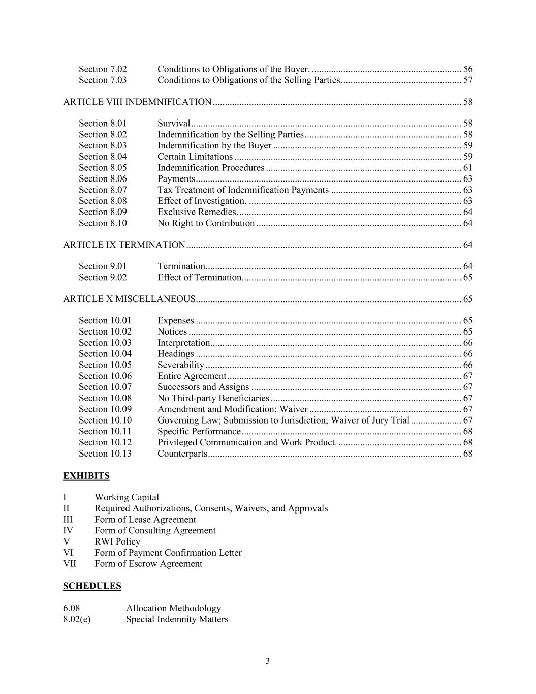 3 Section 7.02 Conditions to Obligations of the Buyer. .............................................................. 56 Section 7.03 Conditions to Obligations of the Selling Parties. ................................................. 57 ARTICLE VIII INDEMNIFICATION ....................................................................................................... 58 Section 8.01 Survival ................................................................................................................ 58 Section 8.02 Indemnification by the Selling Parties ................................................................. 58 Section 8.03 Indemnification by the Buyer .............................................................................. 59 Section 8.04 Certain Limitations .............................................................................................. 59 Section 8.05 Indemnification Procedures ................................................................................. 61 Section 8.06 Payments .............................................................................................................. 63 Section 8.07 Tax Treatment of Indemnification Payments ...................................................... 63 Section 8.08 Effect of Investigation. ........................................................................................ 63 Section 8.09 Exclusive Remedies. ............................................................................................ 64 Section 8.10 No Right to Contribution ..................................................................................... 64 ARTICLE IX TERMINATION .................................................................................................................. 64 Section 9.01 Termination. ......................................................................................................... 64 Section 9.02 Effect of Termination. .......................................................................................... 65 ARTICLE X MISCELLANEOUS.............................................................................................................. 65 Section 10.01 Expenses .............................................................................................................. 65 Section 10.02 Notices ................................................................................................................. 65 Section 10.03 Interpretation ........................................................................................................ 66 Section 10.04 Headings .............................................................................................................. 66 Section 10.05 Severability .......................................................................................................... 66 Section 10.06 Entire Agreement ................................................................................................. 67 Section 10.07 Successors and Assigns ....................................................................................... 67 Section 10.08 No Third-party Beneficiaries ............................................................................... 67 Section 10.09 Amendment and Modification; Waiver ............................................................... 67 Section 10.10 Governing Law; Submission to Jurisdiction; Waiver of Jury Trial ..................... 67 Section 10.11 Specific Performance ........................................................................................... 68 Section 10.12 Privileged Communication and Work Product. ................................................... 68 Section 10.13 Counterparts ......................................................................................................... 68 EXHIBITS I Working Capital II Required Authorizations, Consents, Waivers, and Approvals III Form of Lease Agreement IV Form of Consulting Agreement V RWI Policy VI Form of Payment Confirmation Letter VII Form of Escrow Agreement SCHEDULES 6.08 Allocation Methodology 8.02(e) Special Indemnity Matters