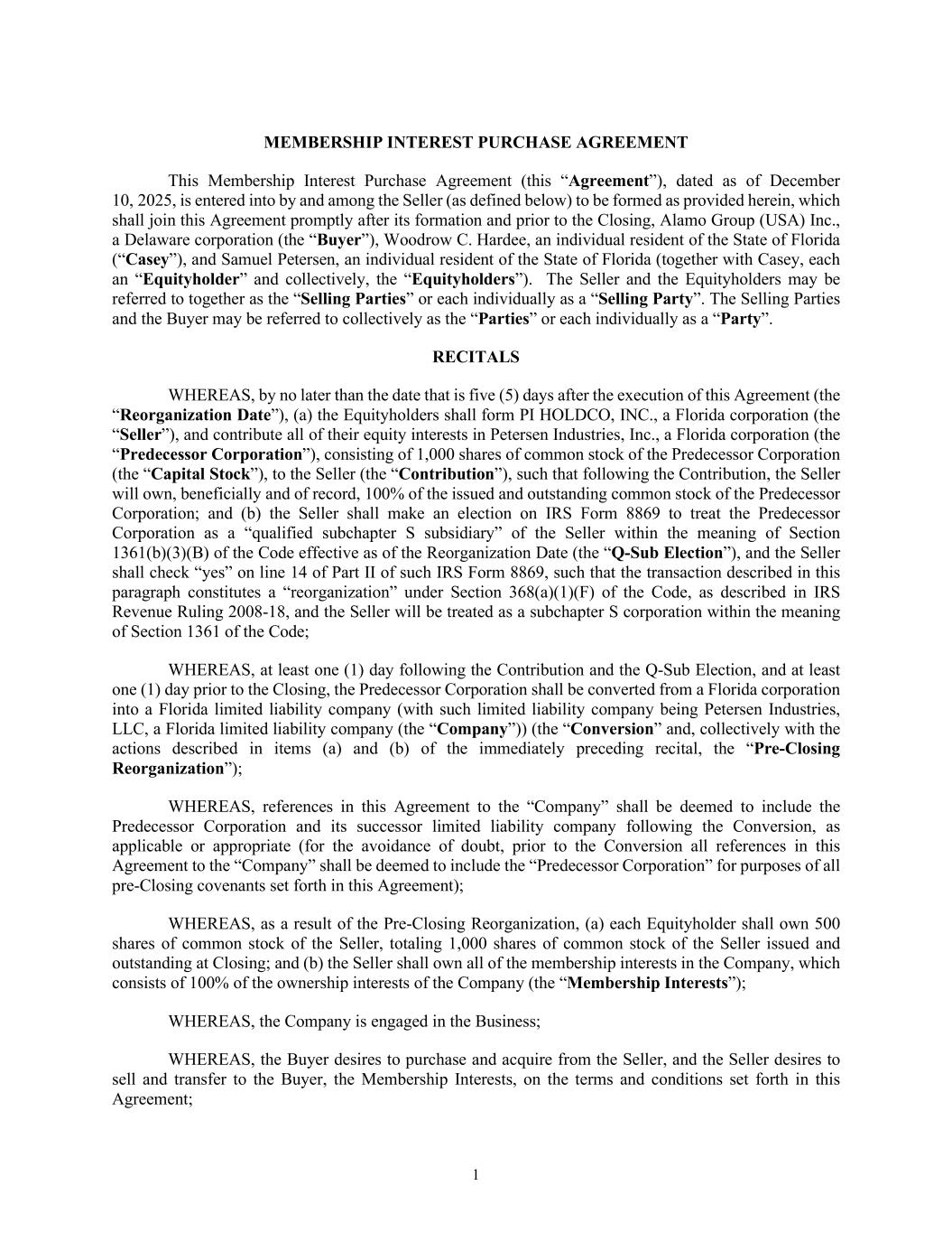 1 MEMBERSHIP INTEREST PURCHASE AGREEMENT This Membership Interest Purchase Agreement (this “Agreement”), dated as of December 10, 2025, is entered into by and among the Seller (as defined below) to be formed as provided herein, which shall join this Agreement promptly after its formation and prior to the Closing, Alamo Group (USA) Inc., a Delaware corporation (the “Buyer”), Woodrow C. Hardee, an individual resident of the State of Florida (“Casey”), and Samuel Petersen, an individual resident of the State of Florida (together with Casey, each an “Equityholder” and collectively, the “Equityholders”). The Seller and the Equityholders may be referred to together as the “Selling Parties” or each individually as a “Selling Party”. The Selling Parties and the Buyer may be referred to collectively as the “Parties” or each individually as a “Party”. RECITALS WHEREAS, by no later than the date that is five (5) days after the execution of this Agreement (the “Reorganization Date”), (a) the Equityholders shall form PI HOLDCO, INC., a Florida corporation (the “Seller”), and contribute all of their equity interests in Petersen Industries, Inc., a Florida corporation (the “Predecessor Corporation”), consisting of 1,000 shares of common stock of the Predecessor Corporation (the “Capital Stock”), to the Seller (the “Contribution”), such that following the Contribution, the Seller will own, beneficially and of record, 100% of the issued and outstanding common stock of the Predecessor Corporation; and (b) the Seller shall make an election on IRS Form 8869 to treat the Predecessor Corporation as a “qualified subchapter S subsidiary” of the Seller within the meaning of Section 1361(b)(3)(B) of the Code effective as of the Reorganization Date (the “Q-Sub Election”), and the Seller shall check “yes” on line 14 of Part II of such IRS Form 8869, such that the transaction described in this paragraph constitutes a “reorganization” under Section 368(a)(1)(F) of the Code, as described in IRS Revenue Ruling 2008-18, and the Seller will be treated as a subchapter S corporation within the meaning of Section 1361 of the Code; WHEREAS, at least one (1) day following the Contribution and the Q-Sub Election, and at least one (1) day prior to the Closing, the Predecessor Corporation shall be converted from a Florida corporation into a Florida limited liability company (with such limited liability company being Petersen Industries, LLC, a Florida limited liability company (the “Company”)) (the “Conversion” and, collectively with the actions described in items (a) and (b) of the immediately preceding recital, the “Pre-Closing Reorganization”); WHEREAS, references in this Agreement to the “Company” shall be deemed to include the Predecessor Corporation and its successor limited liability company following the Conversion, as applicable or appropriate (for the avoidance of doubt, prior to the Conversion all references in this Agreement to the “Company” shall be deemed to include the “Predecessor Corporation” for purposes of all pre-Closing covenants set forth in this Agreement); WHEREAS, as a result of the Pre-Closing Reorganization, (a) each Equityholder shall own 500 shares of common stock of the Seller, totaling 1,000 shares of common stock of the Seller issued and outstanding at Closing; and (b) the Seller shall own all of the membership interests in the Company, which consists of 100% of the ownership interests of the Company (the “Membership Interests”); WHEREAS, the Company is engaged in the Business; WHEREAS, the Buyer desires to purchase and acquire from the Seller, and the Seller desires to sell and transfer to the Buyer, the Membership Interests, on the terms and conditions set forth in this Agreement;