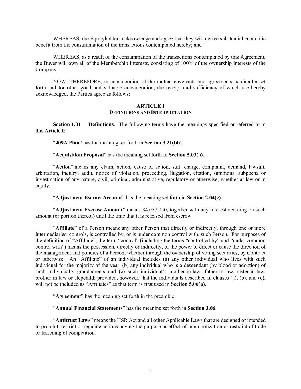 2 WHEREAS, the Equityholders acknowledge and agree that they will derive substantial economic benefit from the consummation of the transactions contemplated hereby; and WHEREAS, as a result of the consummation of the transactions contemplated by this Agreement, the Buyer will own all of the Membership Interests, consisting of 100% of the ownership interests of the Company. NOW, THEREFORE, in consideration of the mutual covenants and agreements hereinafter set forth and for other good and valuable consideration, the receipt and sufficiency of which are hereby acknowledged, the Parties agree as follows: ARTICLE I DEFINITIONS AND INTERPRETATION Section 1.01 Definitions. The following terms have the meanings specified or referred to in this Article I: “409A Plan” has the meaning set forth in Section 3.21(bb). “Acquisition Proposal” has the meaning set forth in Section 5.03(a). “Action” means any claim, action, cause of action, suit, charge, complaint, demand, lawsuit, arbitration, inquiry, audit, notice of violation, proceeding, litigation, citation, summons, subpoena or investigation of any nature, civil, criminal, administrative, regulatory or otherwise, whether at law or in equity. “Adjustment Escrow Account” has the meaning set forth in Section 2.04(c). “Adjustment Escrow Amount” means $4,057,050, together with any interest accruing on such amount (or portion thereof) until the time that it is released from escrow. “Affiliate” of a Person means any other Person that directly or indirectly, through one or more intermediaries, controls, is controlled by, or is under common control with, such Person. For purposes of the definition of “Affiliate”, the term “control” (including the terms “controlled by” and “under common control with”) means the possession, directly or indirectly, of the power to direct or cause the direction of the management and policies of a Person, whether through the ownership of voting securities, by Contract or otherwise. An “Affiliate” of an individual includes (a) any other individual who lives with such individual for the majority of the year, (b) any individual who is a descendant (by blood or adoption) of such individual’s grandparents and (c) such individual’s mother-in-law, father-in-law, sister-in-law, brother-in-law or stepchild; provided, however, that the individuals described in clauses (a), (b), and (c), will not be included as “Affiliates” as that term is first used in Section 5.06(a). “Agreement” has the meaning set forth in the preamble. “Annual Financial Statements” has the meaning set forth in Section 3.06. “Antitrust Laws” means the HSR Act and all other Applicable Laws that are designed or intended to prohibit, restrict or regulate actions having the purpose or effect of monopolization or restraint of trade or lessening of competition.