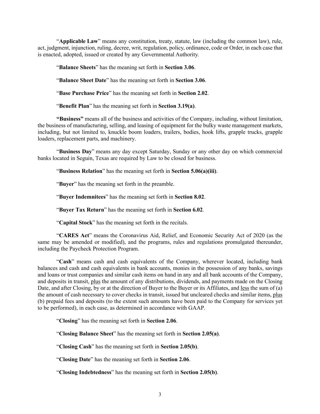 3 “Applicable Law” means any constitution, treaty, statute, law (including the common law), rule, act, judgment, injunction, ruling, decree, writ, regulation, policy, ordinance, code or Order, in each case that is enacted, adopted, issued or created by any Governmental Authority. “Balance Sheets” has the meaning set forth in Section 3.06. “Balance Sheet Date” has the meaning set forth in Section 3.06. “Base Purchase Price” has the meaning set forth in Section 2.02. “Benefit Plan” has the meaning set forth in Section 3.19(a). “Business” means all of the business and activities of the Company, including, without limitation, the business of manufacturing, selling, and leasing of equipment for the bulky waste management markets, including, but not limited to, knuckle boom loaders, trailers, bodies, hook lifts, grapple trucks, grapple loaders, replacement parts, and machinery. “Business Day” means any day except Saturday, Sunday or any other day on which commercial banks located in Seguin, Texas are required by Law to be closed for business. “Business Relation” has the meaning set forth in Section 5.06(a)(iii). “Buyer” has the meaning set forth in the preamble. “Buyer Indemnitees” has the meaning set forth in Section 8.02. “Buyer Tax Return” has the meaning set forth in Section 6.02. “Capital Stock” has the meaning set forth in the recitals. “CARES Act” means the Coronavirus Aid, Relief, and Economic Security Act of 2020 (as the same may be amended or modified), and the programs, rules and regulations promulgated thereunder, including the Paycheck Protection Program. “Cash” means cash and cash equivalents of the Company, wherever located, including bank balances and cash and cash equivalents in bank accounts, monies in the possession of any banks, savings and loans or trust companies and similar cash items on hand in any and all bank accounts of the Company, and deposits in transit, plus the amount of any distributions, dividends, and payments made on the Closing Date, and after Closing, by or at the direction of Buyer to the Buyer or its Affiliates, and less the sum of (a) the amount of cash necessary to cover checks in transit, issued but uncleared checks and similar items, plus (b) prepaid fees and deposits (to the extent such amounts have been paid to the Company for services yet to be performed), in each case, as determined in accordance with GAAP. “Closing” has the meaning set forth in Section 2.06. “Closing Balance Sheet” has the meaning set forth in Section 2.05(a). “Closing Cash” has the meaning set forth in Section 2.05(b). “Closing Date” has the meaning set forth in Section 2.06. “Closing Indebtedness” has the meaning set forth in Section 2.05(b).