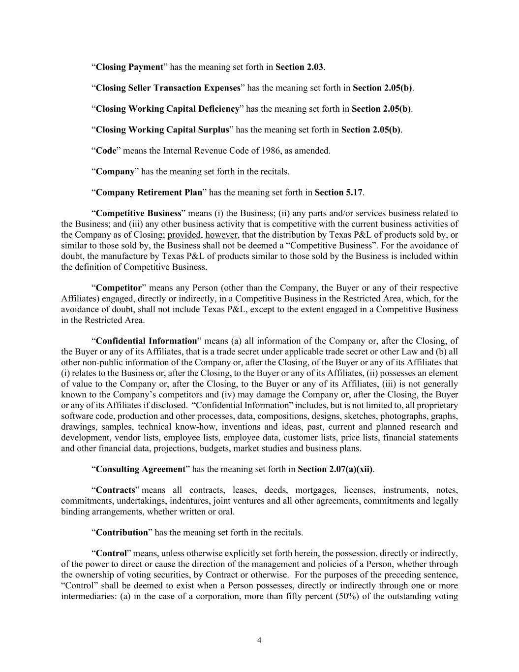 4 “Closing Payment” has the meaning set forth in Section 2.03. “Closing Seller Transaction Expenses” has the meaning set forth in Section 2.05(b). “Closing Working Capital Deficiency” has the meaning set forth in Section 2.05(b). “Closing Working Capital Surplus” has the meaning set forth in Section 2.05(b). “Code” means the Internal Revenue Code of 1986, as amended. “Company” has the meaning set forth in the recitals. “Company Retirement Plan” has the meaning set forth in Section 5.17. “Competitive Business” means (i) the Business; (ii) any parts and/or services business related to the Business; and (iii) any other business activity that is competitive with the current business activities of the Company as of Closing; provided, however, that the distribution by Texas P&L of products sold by, or similar to those sold by, the Business shall not be deemed a “Competitive Business”. For the avoidance of doubt, the manufacture by Texas P&L of products similar to those sold by the Business is included within the definition of Competitive Business. “Competitor” means any Person (other than the Company, the Buyer or any of their respective Affiliates) engaged, directly or indirectly, in a Competitive Business in the Restricted Area, which, for the avoidance of doubt, shall not include Texas P&L, except to the extent engaged in a Competitive Business in the Restricted Area. “Confidential Information” means (a) all information of the Company or, after the Closing, of the Buyer or any of its Affiliates, that is a trade secret under applicable trade secret or other Law and (b) all other non-public information of the Company or, after the Closing, of the Buyer or any of its Affiliates that (i) relates to the Business or, after the Closing, to the Buyer or any of its Affiliates, (ii) possesses an element of value to the Company or, after the Closing, to the Buyer or any of its Affiliates, (iii) is not generally known to the Company’s competitors and (iv) may damage the Company or, after the Closing, the Buyer or any of its Affiliates if disclosed. “Confidential Information” includes, but is not limited to, all proprietary software code, production and other processes, data, compositions, designs, sketches, photographs, graphs, drawings, samples, technical know-how, inventions and ideas, past, current and planned research and development, vendor lists, employee lists, employee data, customer lists, price lists, financial statements and other financial data, projections, budgets, market studies and business plans. “Consulting Agreement” has the meaning set forth in Section 2.07(a)(xii). “Contracts” means all contracts, leases, deeds, mortgages, licenses, instruments, notes, commitments, undertakings, indentures, joint ventures and all other agreements, commitments and legally binding arrangements, whether written or oral. “Contribution” has the meaning set forth in the recitals. “Control” means, unless otherwise explicitly set forth herein, the possession, directly or indirectly, of the power to direct or cause the direction of the management and policies of a Person, whether through the ownership of voting securities, by Contract or otherwise. For the purposes of the preceding sentence, “Control” shall be deemed to exist when a Person possesses, directly or indirectly through one or more intermediaries: (a) in the case of a corporation, more than fifty percent (50%) of the outstanding voting