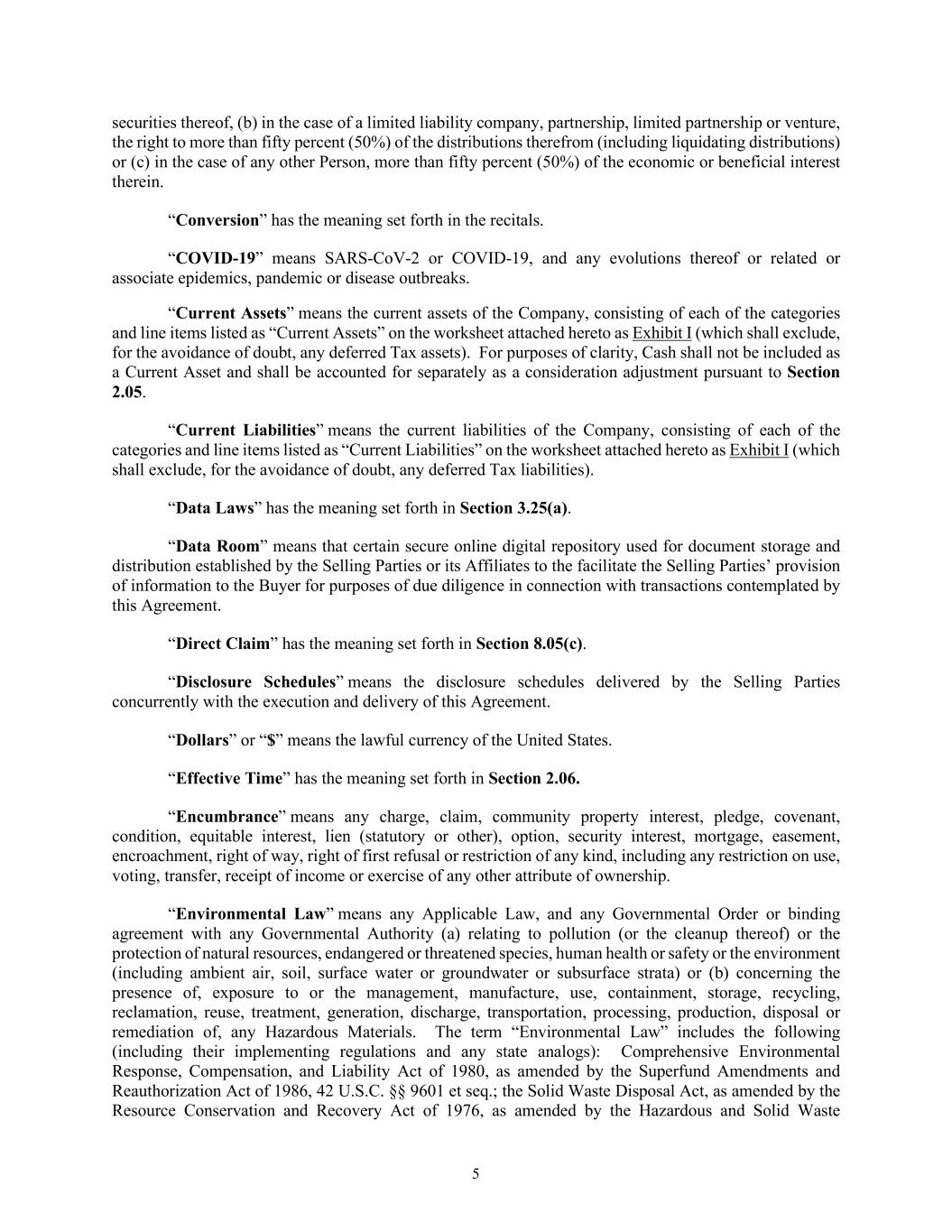 5 securities thereof, (b) in the case of a limited liability company, partnership, limited partnership or venture, the right to more than fifty percent (50%) of the distributions therefrom (including liquidating distributions) or (c) in the case of any other Person, more than fifty percent (50%) of the economic or beneficial interest therein. “Conversion” has the meaning set forth in the recitals. “COVID-19” means SARS-CoV-2 or COVID-19, and any evolutions thereof or related or associate epidemics, pandemic or disease outbreaks. “Current Assets” means the current assets of the Company, consisting of each of the categories and line items listed as “Current Assets” on the worksheet attached hereto as Exhibit I (which shall exclude, for the avoidance of doubt, any deferred Tax assets). For purposes of clarity, Cash shall not be included as a Current Asset and shall be accounted for separately as a consideration adjustment pursuant to Section 2.05. “Current Liabilities” means the current liabilities of the Company, consisting of each of the categories and line items listed as “Current Liabilities” on the worksheet attached hereto as Exhibit I (which shall exclude, for the avoidance of doubt, any deferred Tax liabilities). “Data Laws” has the meaning set forth in Section 3.25(a). “Data Room” means that certain secure online digital repository used for document storage and distribution established by the Selling Parties or its Affiliates to the facilitate the Selling Parties’ provision of information to the Buyer for purposes of due diligence in connection with transactions contemplated by this Agreement. “Direct Claim” has the meaning set forth in Section 8.05(c). “Disclosure Schedules” means the disclosure schedules delivered by the Selling Parties concurrently with the execution and delivery of this Agreement. “Dollars” or “$” means the lawful currency of the United States. “Effective Time” has the meaning set forth in Section 2.06. “Encumbrance” means any charge, claim, community property interest, pledge, covenant, condition, equitable interest, lien (statutory or other), option, security interest, mortgage, easement, encroachment, right of way, right of first refusal or restriction of any kind, including any restriction on use, voting, transfer, receipt of income or exercise of any other attribute of ownership. “Environmental Law” means any Applicable Law, and any Governmental Order or binding agreement with any Governmental Authority (a) relating to pollution (or the cleanup thereof) or the protection of natural resources, endangered or threatened species, human health or safety or the environment (including ambient air, soil, surface water or groundwater or subsurface strata) or (b) concerning the presence of, exposure to or the management, manufacture, use, containment, storage, recycling, reclamation, reuse, treatment, generation, discharge, transportation, processing, production, disposal or remediation of, any Hazardous Materials. The term “Environmental Law” includes the following (including their implementing regulations and any state analogs): Comprehensive Environmental Response, Compensation, and Liability Act of 1980, as amended by the Superfund Amendments and Reauthorization Act of 1986, 42 U.S.C. §§ 9601 et seq.; the Solid Waste Disposal Act, as amended by the Resource Conservation and Recovery Act of 1976, as amended by the Hazardous and Solid Waste