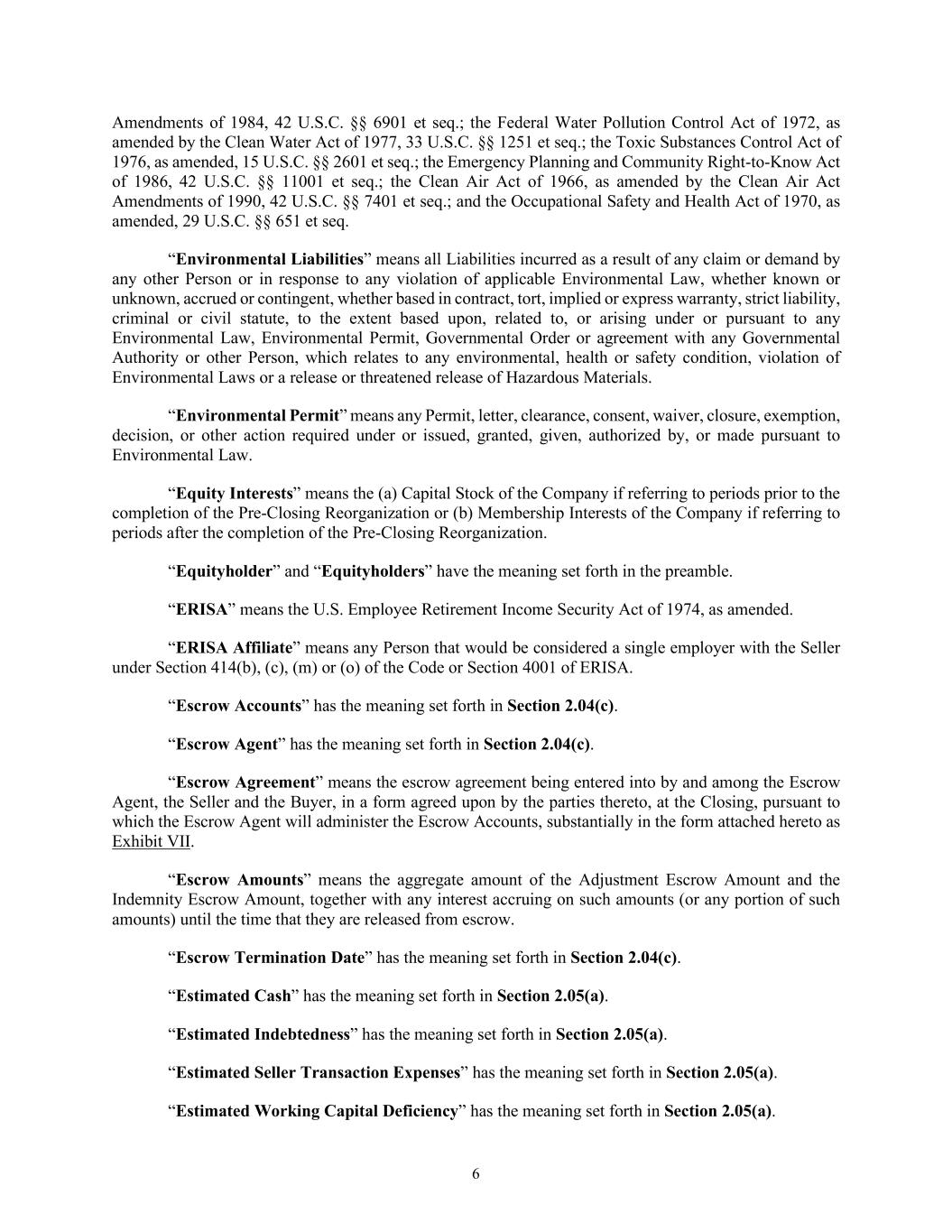 6 Amendments of 1984, 42 U.S.C. §§ 6901 et seq.; the Federal Water Pollution Control Act of 1972, as amended by the Clean Water Act of 1977, 33 U.S.C. §§ 1251 et seq.; the Toxic Substances Control Act of 1976, as amended, 15 U.S.C. §§ 2601 et seq.; the Emergency Planning and Community Right-to-Know Act of 1986, 42 U.S.C. §§ 11001 et seq.; the Clean Air Act of 1966, as amended by the Clean Air Act Amendments of 1990, 42 U.S.C. §§ 7401 et seq.; and the Occupational Safety and Health Act of 1970, as amended, 29 U.S.C. §§ 651 et seq. “Environmental Liabilities” means all Liabilities incurred as a result of any claim or demand by any other Person or in response to any violation of applicable Environmental Law, whether known or unknown, accrued or contingent, whether based in contract, tort, implied or express warranty, strict liability, criminal or civil statute, to the extent based upon, related to, or arising under or pursuant to any Environmental Law, Environmental Permit, Governmental Order or agreement with any Governmental Authority or other Person, which relates to any environmental, health or safety condition, violation of Environmental Laws or a release or threatened release of Hazardous Materials. “Environmental Permit” means any Permit, letter, clearance, consent, waiver, closure, exemption, decision, or other action required under or issued, granted, given, authorized by, or made pursuant to Environmental Law. “Equity Interests” means the (a) Capital Stock of the Company if referring to periods prior to the completion of the Pre-Closing Reorganization or (b) Membership Interests of the Company if referring to periods after the completion of the Pre-Closing Reorganization. “Equityholder” and “Equityholders” have the meaning set forth in the preamble. “ERISA” means the U.S. Employee Retirement Income Security Act of 1974, as amended. “ERISA Affiliate” means any Person that would be considered a single employer with the Seller under Section 414(b), (c), (m) or (o) of the Code or Section 4001 of ERISA. “Escrow Accounts” has the meaning set forth in Section 2.04(c). “Escrow Agent” has the meaning set forth in Section 2.04(c). “Escrow Agreement” means the escrow agreement being entered into by and among the Escrow Agent, the Seller and the Buyer, in a form agreed upon by the parties thereto, at the Closing, pursuant to which the Escrow Agent will administer the Escrow Accounts, substantially in the form attached hereto as Exhibit VII. “Escrow Amounts” means the aggregate amount of the Adjustment Escrow Amount and the Indemnity Escrow Amount, together with any interest accruing on such amounts (or any portion of such amounts) until the time that they are released from escrow. “Escrow Termination Date” has the meaning set forth in Section 2.04(c). “Estimated Cash” has the meaning set forth in Section 2.05(a). “Estimated Indebtedness” has the meaning set forth in Section 2.05(a). “Estimated Seller Transaction Expenses” has the meaning set forth in Section 2.05(a). “Estimated Working Capital Deficiency” has the meaning set forth in Section 2.05(a).
