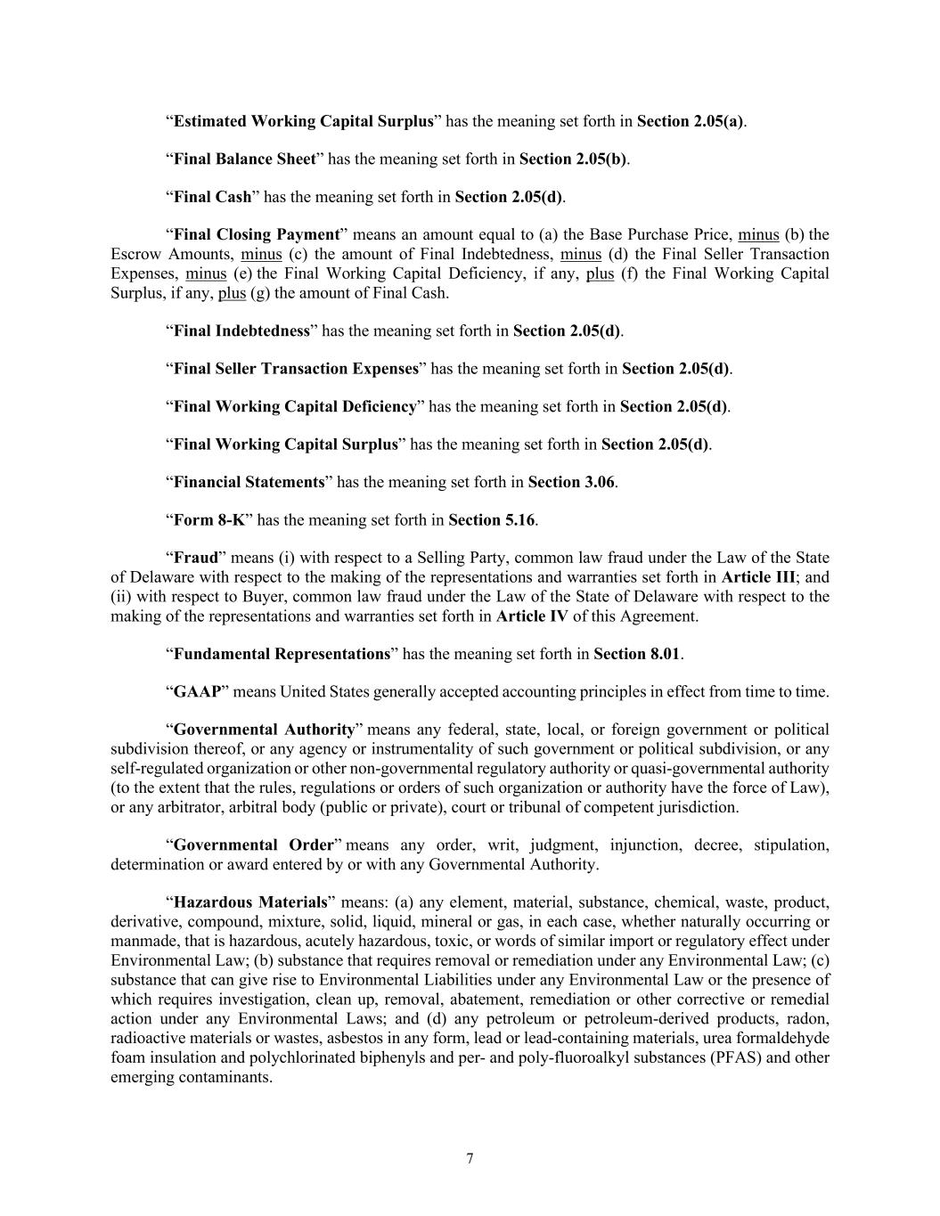 7 “Estimated Working Capital Surplus” has the meaning set forth in Section 2.05(a). “Final Balance Sheet” has the meaning set forth in Section 2.05(b). “Final Cash” has the meaning set forth in Section 2.05(d). “Final Closing Payment” means an amount equal to (a) the Base Purchase Price, minus (b) the Escrow Amounts, minus (c) the amount of Final Indebtedness, minus (d) the Final Seller Transaction Expenses, minus (e) the Final Working Capital Deficiency, if any, plus (f) the Final Working Capital Surplus, if any, plus (g) the amount of Final Cash. “Final Indebtedness” has the meaning set forth in Section 2.05(d). “Final Seller Transaction Expenses” has the meaning set forth in Section 2.05(d). “Final Working Capital Deficiency” has the meaning set forth in Section 2.05(d). “Final Working Capital Surplus” has the meaning set forth in Section 2.05(d). “Financial Statements” has the meaning set forth in Section 3.06. “Form 8-K” has the meaning set forth in Section 5.16. “Fraud” means (i) with respect to a Selling Party, common law fraud under the Law of the State of Delaware with respect to the making of the representations and warranties set forth in Article III; and (ii) with respect to Buyer, common law fraud under the Law of the State of Delaware with respect to the making of the representations and warranties set forth in Article IV of this Agreement. “Fundamental Representations” has the meaning set forth in Section 8.01. “GAAP” means United States generally accepted accounting principles in effect from time to time. “Governmental Authority” means any federal, state, local, or foreign government or political subdivision thereof, or any agency or instrumentality of such government or political subdivision, or any self-regulated organization or other non-governmental regulatory authority or quasi-governmental authority (to the extent that the rules, regulations or orders of such organization or authority have the force of Law), or any arbitrator, arbitral body (public or private), court or tribunal of competent jurisdiction. “Governmental Order” means any order, writ, judgment, injunction, decree, stipulation, determination or award entered by or with any Governmental Authority. “Hazardous Materials” means: (a) any element, material, substance, chemical, waste, product, derivative, compound, mixture, solid, liquid, mineral or gas, in each case, whether naturally occurring or manmade, that is hazardous, acutely hazardous, toxic, or words of similar import or regulatory effect under Environmental Law; (b) substance that requires removal or remediation under any Environmental Law; (c) substance that can give rise to Environmental Liabilities under any Environmental Law or the presence of which requires investigation, clean up, removal, abatement, remediation or other corrective or remedial action under any Environmental Laws; and (d) any petroleum or petroleum-derived products, radon, radioactive materials or wastes, asbestos in any form, lead or lead-containing materials, urea formaldehyde foam insulation and polychlorinated biphenyls and per- and poly-fluoroalkyl substances (PFAS) and other emerging contaminants.