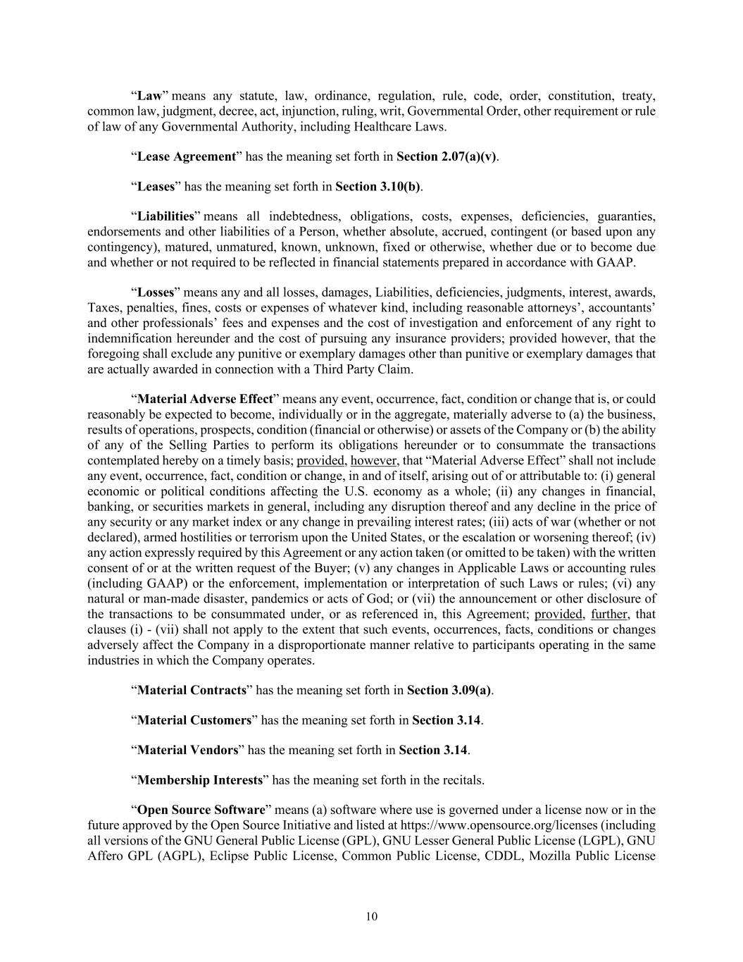 10 “Law” means any statute, law, ordinance, regulation, rule, code, order, constitution, treaty, common law, judgment, decree, act, injunction, ruling, writ, Governmental Order, other requirement or rule of law of any Governmental Authority, including Healthcare Laws. “Lease Agreement” has the meaning set forth in Section 2.07(a)(v). “Leases” has the meaning set forth in Section 3.10(b). “Liabilities” means all indebtedness, obligations, costs, expenses, deficiencies, guaranties, endorsements and other liabilities of a Person, whether absolute, accrued, contingent (or based upon any contingency), matured, unmatured, known, unknown, fixed or otherwise, whether due or to become due and whether or not required to be reflected in financial statements prepared in accordance with GAAP. “Losses” means any and all losses, damages, Liabilities, deficiencies, judgments, interest, awards, Taxes, penalties, fines, costs or expenses of whatever kind, including reasonable attorneys’, accountants’ and other professionals’ fees and expenses and the cost of investigation and enforcement of any right to indemnification hereunder and the cost of pursuing any insurance providers; provided however, that the foregoing shall exclude any punitive or exemplary damages other than punitive or exemplary damages that are actually awarded in connection with a Third Party Claim. “Material Adverse Effect” means any event, occurrence, fact, condition or change that is, or could reasonably be expected to become, individually or in the aggregate, materially adverse to (a) the business, results of operations, prospects, condition (financial or otherwise) or assets of the Company or (b) the ability of any of the Selling Parties to perform its obligations hereunder or to consummate the transactions contemplated hereby on a timely basis; provided, however, that “Material Adverse Effect” shall not include any event, occurrence, fact, condition or change, in and of itself, arising out of or attributable to: (i) general economic or political conditions affecting the U.S. economy as a whole; (ii) any changes in financial, banking, or securities markets in general, including any disruption thereof and any decline in the price of any security or any market index or any change in prevailing interest rates; (iii) acts of war (whether or not declared), armed hostilities or terrorism upon the United States, or the escalation or worsening thereof; (iv) any action expressly required by this Agreement or any action taken (or omitted to be taken) with the written consent of or at the written request of the Buyer; (v) any changes in Applicable Laws or accounting rules (including GAAP) or the enforcement, implementation or interpretation of such Laws or rules; (vi) any natural or man-made disaster, pandemics or acts of God; or (vii) the announcement or other disclosure of the transactions to be consummated under, or as referenced in, this Agreement; provided, further, that clauses (i) - (vii) shall not apply to the extent that such events, occurrences, facts, conditions or changes adversely affect the Company in a disproportionate manner relative to participants operating in the same industries in which the Company operates. “Material Contracts” has the meaning set forth in Section 3.09(a). “Material Customers” has the meaning set forth in Section 3.14. “Material Vendors” has the meaning set forth in Section 3.14. “Membership Interests” has the meaning set forth in the recitals. “Open Source Software” means (a) software where use is governed under a license now or in the future approved by the Open Source Initiative and listed at https://www.opensource.org/licenses (including all versions of the GNU General Public License (GPL), GNU Lesser General Public License (LGPL), GNU Affero GPL (AGPL), Eclipse Public License, Common Public License, CDDL, Mozilla Public License