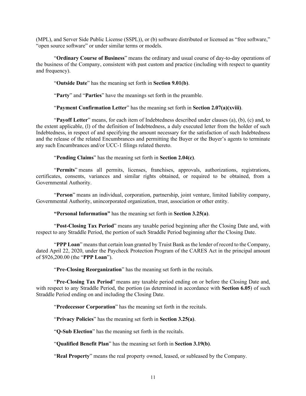 11 (MPL), and Server Side Public License (SSPL)), or (b) software distributed or licensed as “free software,” “open source software” or under similar terms or models. “Ordinary Course of Business” means the ordinary and usual course of day-to-day operations of the business of the Company, consistent with past custom and practice (including with respect to quantity and frequency). “Outside Date” has the meaning set forth in Section 9.01(b). “Party” and “Parties” have the meanings set forth in the preamble. “Payment Confirmation Letter” has the meaning set forth in Section 2.07(a)(xviii). “Payoff Letter” means, for each item of Indebtedness described under clauses (a), (b), (c) and, to the extent applicable, (l) of the definition of Indebtedness, a duly executed letter from the holder of such Indebtedness, in respect of and specifying the amount necessary for the satisfaction of such Indebtedness and the release of the related Encumbrances and permitting the Buyer or the Buyer’s agents to terminate any such Encumbrances and/or UCC-1 filings related thereto. “Pending Claims” has the meaning set forth in Section 2.04(c). “Permits” means all permits, licenses, franchises, approvals, authorizations, registrations, certificates, consents, variances and similar rights obtained, or required to be obtained, from a Governmental Authority. “Person” means an individual, corporation, partnership, joint venture, limited liability company, Governmental Authority, unincorporated organization, trust, association or other entity. “Personal Information” has the meaning set forth in Section 3.25(a). “Post-Closing Tax Period” means any taxable period beginning after the Closing Date and, with respect to any Straddle Period, the portion of such Straddle Period beginning after the Closing Date. “PPP Loan” means that certain loan granted by Truist Bank as the lender of record to the Company, dated April 22, 2020, under the Paycheck Protection Program of the CARES Act in the principal amount of $926,200.00 (the “PPP Loan”). “Pre-Closing Reorganization” has the meaning set forth in the recitals. “Pre-Closing Tax Period” means any taxable period ending on or before the Closing Date and, with respect to any Straddle Period, the portion (as determined in accordance with Section 6.05) of such Straddle Period ending on and including the Closing Date. “Predecessor Corporation” has the meaning set forth in the recitals. “Privacy Policies” has the meaning set forth in Section 3.25(a). “Q-Sub Election” has the meaning set forth in the recitals. “Qualified Benefit Plan” has the meaning set forth in Section 3.19(b). “Real Property” means the real property owned, leased, or subleased by the Company.