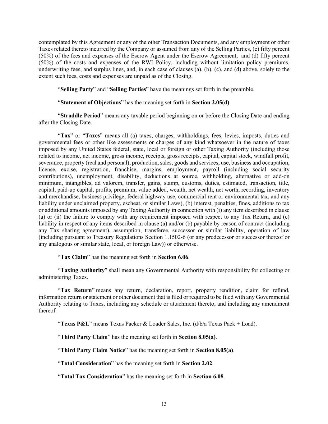 13 contemplated by this Agreement or any of the other Transaction Documents, and any employment or other Taxes related thereto incurred by the Company or assumed from any of the Selling Parties, (c) fifty percent (50%) of the fees and expenses of the Escrow Agent under the Escrow Agreement, and (d) fifty percent (50%) of the costs and expenses of the RWI Policy, including without limitation policy premiums, underwriting fees, and surplus lines, and, in each case of clauses (a), (b), (c), and (d) above, solely to the extent such fees, costs and expenses are unpaid as of the Closing. “Selling Party” and “Selling Parties” have the meanings set forth in the preamble. “Statement of Objections” has the meaning set forth in Section 2.05(d). “Straddle Period” means any taxable period beginning on or before the Closing Date and ending after the Closing Date. “Tax” or “Taxes” means all (a) taxes, charges, withholdings, fees, levies, imposts, duties and governmental fees or other like assessments or charges of any kind whatsoever in the nature of taxes imposed by any United States federal, state, local or foreign or other Taxing Authority (including those related to income, net income, gross income, receipts, gross receipts, capital, capital stock, windfall profit, severance, property (real and personal), production, sales, goods and services, use, business and occupation, license, excise, registration, franchise, margins, employment, payroll (including social security contributions), unemployment, disability, deductions at source, withholding, alternative or add-on minimum, intangibles, ad valorem, transfer, gains, stamp, customs, duties, estimated, transaction, title, capital, paid-up capital, profits, premium, value added, wealth, net wealth, net worth, recording, inventory and merchandise, business privilege, federal highway use, commercial rent or environmental tax, and any liability under unclaimed property, escheat, or similar Laws), (b) interest, penalties, fines, additions to tax or additional amounts imposed by any Taxing Authority in connection with (i) any item described in clause (a) or (ii) the failure to comply with any requirement imposed with respect to any Tax Return, and (c) liability in respect of any items described in clause (a) and/or (b) payable by reason of contract (including any Tax sharing agreement), assumption, transferee, successor or similar liability, operation of law (including pursuant to Treasury Regulations Section 1.1502-6 (or any predecessor or successor thereof or any analogous or similar state, local, or foreign Law)) or otherwise. “Tax Claim” has the meaning set forth in Section 6.06. “Taxing Authority” shall mean any Governmental Authority with responsibility for collecting or administering Taxes. “Tax Return” means any return, declaration, report, property rendition, claim for refund, information return or statement or other document that is filed or required to be filed with any Governmental Authority relating to Taxes, including any schedule or attachment thereto, and including any amendment thereof. “Texas P&L” means Texas Packer & Loader Sales, Inc. (d/b/a Texas Pack + Load). “Third Party Claim” has the meaning set forth in Section 8.05(a). “Third Party Claim Notice” has the meaning set forth in Section 8.05(a). “Total Consideration” has the meaning set forth in Section 2.02. “Total Tax Consideration” has the meaning set forth in Section 6.08.
