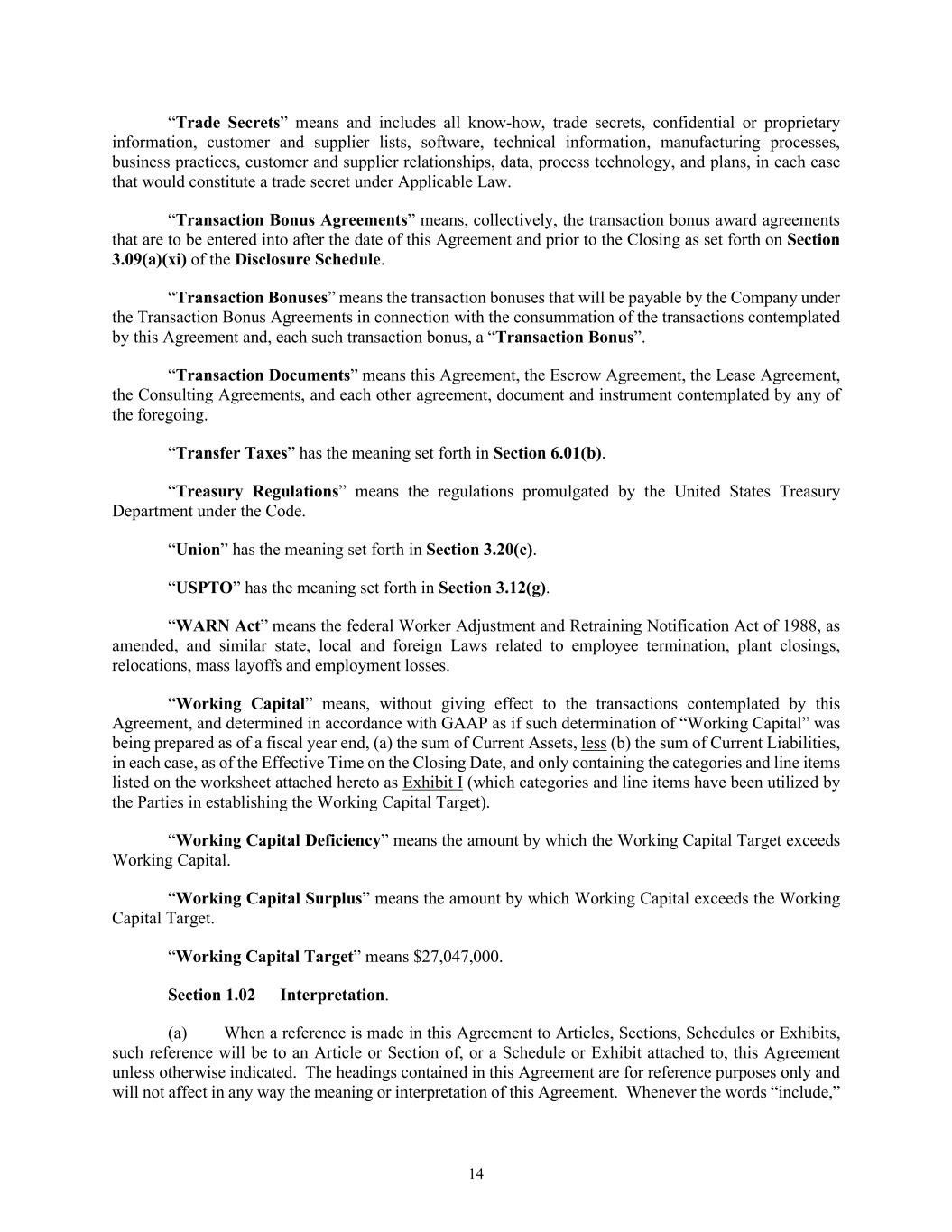 14 “Trade Secrets” means and includes all know-how, trade secrets, confidential or proprietary information, customer and supplier lists, software, technical information, manufacturing processes, business practices, customer and supplier relationships, data, process technology, and plans, in each case that would constitute a trade secret under Applicable Law. “Transaction Bonus Agreements” means, collectively, the transaction bonus award agreements that are to be entered into after the date of this Agreement and prior to the Closing as set forth on Section 3.09(a)(xi) of the Disclosure Schedule. “Transaction Bonuses” means the transaction bonuses that will be payable by the Company under the Transaction Bonus Agreements in connection with the consummation of the transactions contemplated by this Agreement and, each such transaction bonus, a “Transaction Bonus”. “Transaction Documents” means this Agreement, the Escrow Agreement, the Lease Agreement, the Consulting Agreements, and each other agreement, document and instrument contemplated by any of the foregoing. “Transfer Taxes” has the meaning set forth in Section 6.01(b). “Treasury Regulations” means the regulations promulgated by the United States Treasury Department under the Code. “Union” has the meaning set forth in Section 3.20(c). “USPTO” has the meaning set forth in Section 3.12(g). “WARN Act” means the federal Worker Adjustment and Retraining Notification Act of 1988, as amended, and similar state, local and foreign Laws related to employee termination, plant closings, relocations, mass layoffs and employment losses. “Working Capital” means, without giving effect to the transactions contemplated by this Agreement, and determined in accordance with GAAP as if such determination of “Working Capital” was being prepared as of a fiscal year end, (a) the sum of Current Assets, less (b) the sum of Current Liabilities, in each case, as of the Effective Time on the Closing Date, and only containing the categories and line items listed on the worksheet attached hereto as Exhibit I (which categories and line items have been utilized by the Parties in establishing the Working Capital Target). “Working Capital Deficiency” means the amount by which the Working Capital Target exceeds Working Capital. “Working Capital Surplus” means the amount by which Working Capital exceeds the Working Capital Target. “Working Capital Target” means $27,047,000. Section 1.02 Interpretation. (a) When a reference is made in this Agreement to Articles, Sections, Schedules or Exhibits, such reference will be to an Article or Section of, or a Schedule or Exhibit attached to, this Agreement unless otherwise indicated. The headings contained in this Agreement are for reference purposes only and will not affect in any way the meaning or interpretation of this Agreement. Whenever the words “include,”