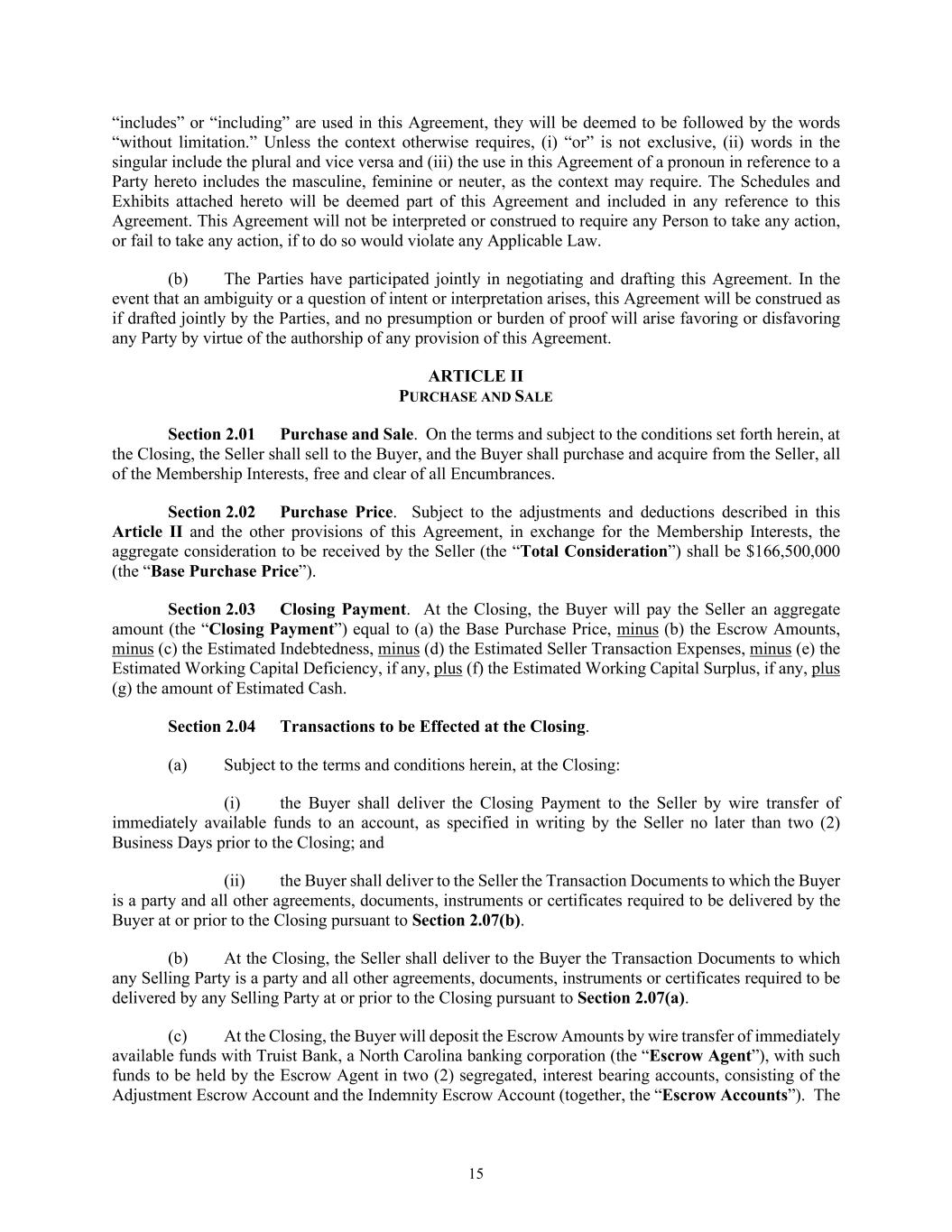 15 “includes” or “including” are used in this Agreement, they will be deemed to be followed by the words “without limitation.” Unless the context otherwise requires, (i) “or” is not exclusive, (ii) words in the singular include the plural and vice versa and (iii) the use in this Agreement of a pronoun in reference to a Party hereto includes the masculine, feminine or neuter, as the context may require. The Schedules and Exhibits attached hereto will be deemed part of this Agreement and included in any reference to this Agreement. This Agreement will not be interpreted or construed to require any Person to take any action, or fail to take any action, if to do so would violate any Applicable Law. (b) The Parties have participated jointly in negotiating and drafting this Agreement. In the event that an ambiguity or a question of intent or interpretation arises, this Agreement will be construed as if drafted jointly by the Parties, and no presumption or burden of proof will arise favoring or disfavoring any Party by virtue of the authorship of any provision of this Agreement. ARTICLE II PURCHASE AND SALE Section 2.01 Purchase and Sale. On the terms and subject to the conditions set forth herein, at the Closing, the Seller shall sell to the Buyer, and the Buyer shall purchase and acquire from the Seller, all of the Membership Interests, free and clear of all Encumbrances. Section 2.02 Purchase Price. Subject to the adjustments and deductions described in this Article II and the other provisions of this Agreement, in exchange for the Membership Interests, the aggregate consideration to be received by the Seller (the “Total Consideration”) shall be $166,500,000 (the “Base Purchase Price”). Section 2.03 Closing Payment. At the Closing, the Buyer will pay the Seller an aggregate amount (the “Closing Payment”) equal to (a) the Base Purchase Price, minus (b) the Escrow Amounts, minus (c) the Estimated Indebtedness, minus (d) the Estimated Seller Transaction Expenses, minus (e) the Estimated Working Capital Deficiency, if any, plus (f) the Estimated Working Capital Surplus, if any, plus (g) the amount of Estimated Cash. Section 2.04 Transactions to be Effected at the Closing. (a) Subject to the terms and conditions herein, at the Closing: (i) the Buyer shall deliver the Closing Payment to the Seller by wire transfer of immediately available funds to an account, as specified in writing by the Seller no later than two (2) Business Days prior to the Closing; and (ii) the Buyer shall deliver to the Seller the Transaction Documents to which the Buyer is a party and all other agreements, documents, instruments or certificates required to be delivered by the Buyer at or prior to the Closing pursuant to Section 2.07(b). (b) At the Closing, the Seller shall deliver to the Buyer the Transaction Documents to which any Selling Party is a party and all other agreements, documents, instruments or certificates required to be delivered by any Selling Party at or prior to the Closing pursuant to Section 2.07(a). (c) At the Closing, the Buyer will deposit the Escrow Amounts by wire transfer of immediately available funds with Truist Bank, a North Carolina banking corporation (the “Escrow Agent”), with such funds to be held by the Escrow Agent in two (2) segregated, interest bearing accounts, consisting of the Adjustment Escrow Account and the Indemnity Escrow Account (together, the “Escrow Accounts”). The