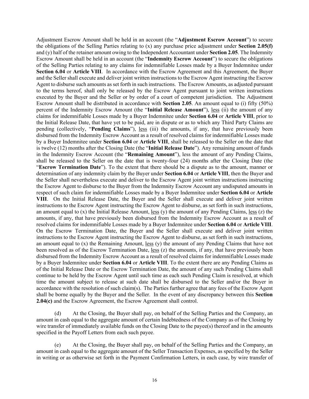 16 Adjustment Escrow Amount shall be held in an account (the “Adjustment Escrow Account”) to secure the obligations of the Selling Parties relating to (x) any purchase price adjustment under Section 2.05(f) and (y) half of the retainer amount owing to the Independent Accountant under Section 2.05. The Indemnity Escrow Amount shall be held in an account (the “Indemnity Escrow Account”) to secure the obligations of the Selling Parties relating to any claims for indemnifiable Losses made by a Buyer Indemnitee under Section 6.04 or Article VIII. In accordance with the Escrow Agreement and this Agreement, the Buyer and the Seller shall execute and deliver joint written instructions to the Escrow Agent instructing the Escrow Agent to disburse such amounts as set forth in such instructions. The Escrow Amounts, as adjusted pursuant to the terms hereof, shall only be released by the Escrow Agent pursuant to joint written instructions executed by the Buyer and the Seller or by order of a court of competent jurisdiction. The Adjustment Escrow Amount shall be distributed in accordance with Section 2.05. An amount equal to (i) fifty (50%) percent of the Indemnity Escrow Amount (the “Initial Release Amount”), less (ii) the amount of any claims for indemnifiable Losses made by a Buyer Indemnitee under Section 6.04 or Article VIII, prior to the Initial Release Date, that have yet to be paid, are in dispute or as to which any Third Party Claims are pending (collectively, “Pending Claims”), less (iii) the amounts, if any, that have previously been disbursed from the Indemnity Escrow Account as a result of resolved claims for indemnifiable Losses made by a Buyer Indemnitee under Section 6.04 or Article VIII, shall be released to the Seller on the date that is twelve (12) months after the Closing Date (the “Initial Release Date”). Any remaining amount of funds in the Indemnity Escrow Account (the “Remaining Amount”), less the amount of any Pending Claims, shall be released to the Seller on the date that is twenty-four (24) months after the Closing Date (the “Escrow Termination Date”). To the extent that there should be a dispute as to the amount, manner or determination of any indemnity claim by the Buyer under Section 6.04 or Article VIII, then the Buyer and the Seller shall nevertheless execute and deliver to the Escrow Agent joint written instructions instructing the Escrow Agent to disburse to the Buyer from the Indemnity Escrow Account any undisputed amounts in respect of such claim for indemnifiable Losses made by a Buyer Indemnitee under Section 6.04 or Article VIII. On the Initial Release Date, the Buyer and the Seller shall execute and deliver joint written instructions to the Escrow Agent instructing the Escrow Agent to disburse, as set forth in such instructions, an amount equal to (x) the Initial Release Amount, less (y) the amount of any Pending Claims, less (z) the amounts, if any, that have previously been disbursed from the Indemnity Escrow Account as a result of resolved claims for indemnifiable Losses made by a Buyer Indemnitee under Section 6.04 or Article VIII. On the Escrow Termination Date, the Buyer and the Seller shall execute and deliver joint written instructions to the Escrow Agent instructing the Escrow Agent to disburse, as set forth in such instructions, an amount equal to (x) the Remaining Amount, less (y) the amount of any Pending Claims that have not been resolved as of the Escrow Termination Date, less (z) the amounts, if any, that have previously been disbursed from the Indemnity Escrow Account as a result of resolved claims for indemnifiable Losses made by a Buyer Indemnitee under Section 6.04 or Article VIII. To the extent there are any Pending Claims as of the Initial Release Date or the Escrow Termination Date, the amount of any such Pending Claims shall continue to be held by the Escrow Agent until such time as each such Pending Claim is resolved, at which time the amount subject to release at such date shall be disbursed to the Seller and/or the Buyer in accordance with the resolution of such claim(s). The Parties further agree that any fees of the Escrow Agent shall be borne equally by the Buyer and the Seller. In the event of any discrepancy between this Section 2.04(c) and the Escrow Agreement, the Escrow Agreement shall control. (d) At the Closing, the Buyer shall pay, on behalf of the Selling Parties and the Company, an amount in cash equal to the aggregate amount of certain Indebtedness of the Company as of the Closing by wire transfer of immediately available funds on the Closing Date to the payee(s) thereof and in the amounts specified in the Payoff Letters from each such payee. (e) At the Closing, the Buyer shall pay, on behalf of the Selling Parties and the Company, an amount in cash equal to the aggregate amount of the Seller Transaction Expenses, as specified by the Seller in writing or as otherwise set forth in the Payment Confirmation Letters, in each case, by wire transfer of