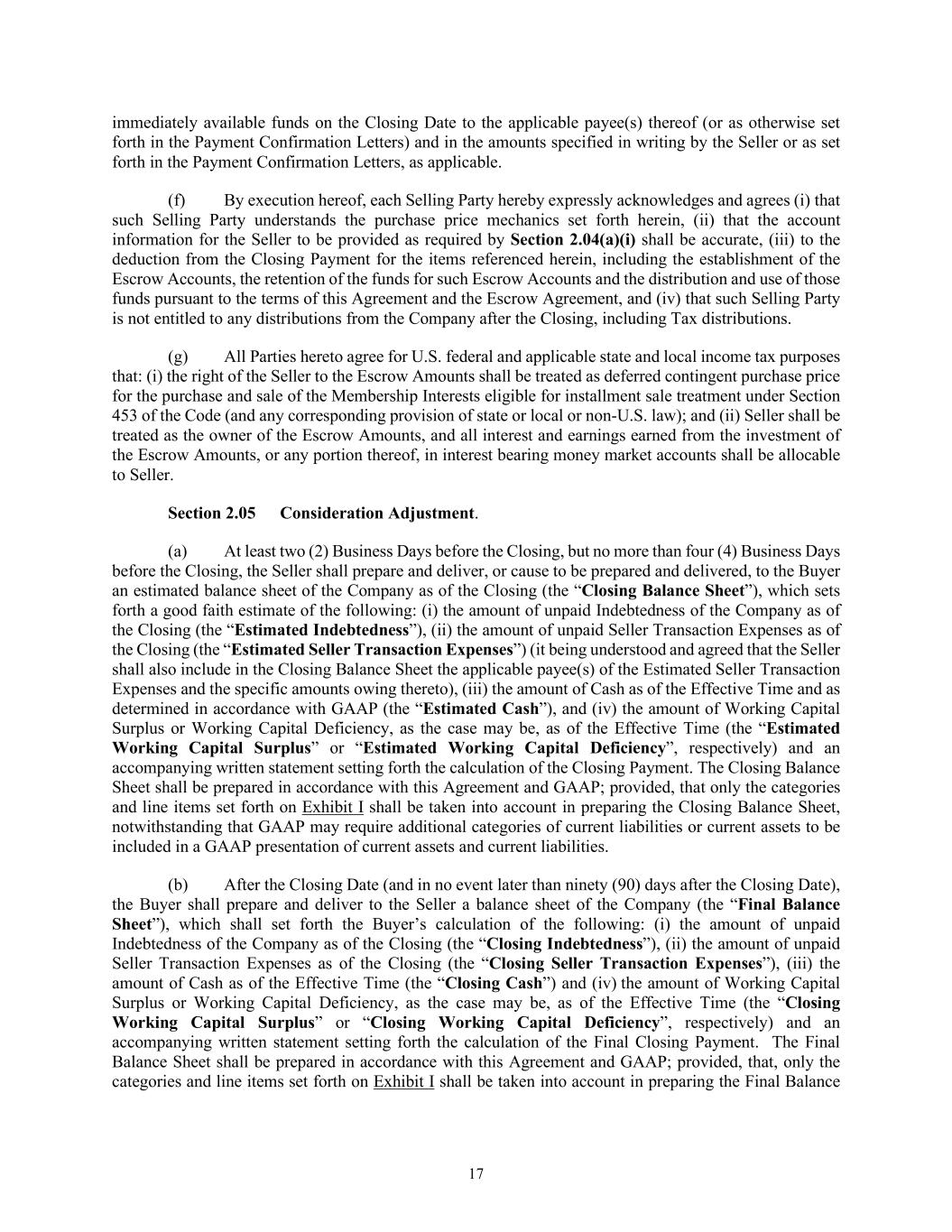 17 immediately available funds on the Closing Date to the applicable payee(s) thereof (or as otherwise set forth in the Payment Confirmation Letters) and in the amounts specified in writing by the Seller or as set forth in the Payment Confirmation Letters, as applicable. (f) By execution hereof, each Selling Party hereby expressly acknowledges and agrees (i) that such Selling Party understands the purchase price mechanics set forth herein, (ii) that the account information for the Seller to be provided as required by Section 2.04(a)(i) shall be accurate, (iii) to the deduction from the Closing Payment for the items referenced herein, including the establishment of the Escrow Accounts, the retention of the funds for such Escrow Accounts and the distribution and use of those funds pursuant to the terms of this Agreement and the Escrow Agreement, and (iv) that such Selling Party is not entitled to any distributions from the Company after the Closing, including Tax distributions. (g) All Parties hereto agree for U.S. federal and applicable state and local income tax purposes that: (i) the right of the Seller to the Escrow Amounts shall be treated as deferred contingent purchase price for the purchase and sale of the Membership Interests eligible for installment sale treatment under Section 453 of the Code (and any corresponding provision of state or local or non-U.S. law); and (ii) Seller shall be treated as the owner of the Escrow Amounts, and all interest and earnings earned from the investment of the Escrow Amounts, or any portion thereof, in interest bearing money market accounts shall be allocable to Seller. Section 2.05 Consideration Adjustment. (a) At least two (2) Business Days before the Closing, but no more than four (4) Business Days before the Closing, the Seller shall prepare and deliver, or cause to be prepared and delivered, to the Buyer an estimated balance sheet of the Company as of the Closing (the “Closing Balance Sheet”), which sets forth a good faith estimate of the following: (i) the amount of unpaid Indebtedness of the Company as of the Closing (the “Estimated Indebtedness”), (ii) the amount of unpaid Seller Transaction Expenses as of the Closing (the “Estimated Seller Transaction Expenses”) (it being understood and agreed that the Seller shall also include in the Closing Balance Sheet the applicable payee(s) of the Estimated Seller Transaction Expenses and the specific amounts owing thereto), (iii) the amount of Cash as of the Effective Time and as determined in accordance with GAAP (the “Estimated Cash”), and (iv) the amount of Working Capital Surplus or Working Capital Deficiency, as the case may be, as of the Effective Time (the “Estimated Working Capital Surplus” or “Estimated Working Capital Deficiency”, respectively) and an accompanying written statement setting forth the calculation of the Closing Payment. The Closing Balance Sheet shall be prepared in accordance with this Agreement and GAAP; provided, that only the categories and line items set forth on Exhibit I shall be taken into account in preparing the Closing Balance Sheet, notwithstanding that GAAP may require additional categories of current liabilities or current assets to be included in a GAAP presentation of current assets and current liabilities. (b) After the Closing Date (and in no event later than ninety (90) days after the Closing Date), the Buyer shall prepare and deliver to the Seller a balance sheet of the Company (the “Final Balance Sheet”), which shall set forth the Buyer’s calculation of the following: (i) the amount of unpaid Indebtedness of the Company as of the Closing (the “Closing Indebtedness”), (ii) the amount of unpaid Seller Transaction Expenses as of the Closing (the “Closing Seller Transaction Expenses”), (iii) the amount of Cash as of the Effective Time (the “Closing Cash”) and (iv) the amount of Working Capital Surplus or Working Capital Deficiency, as the case may be, as of the Effective Time (the “Closing Working Capital Surplus” or “Closing Working Capital Deficiency”, respectively) and an accompanying written statement setting forth the calculation of the Final Closing Payment. The Final Balance Sheet shall be prepared in accordance with this Agreement and GAAP; provided, that, only the categories and line items set forth on Exhibit I shall be taken into account in preparing the Final Balance
