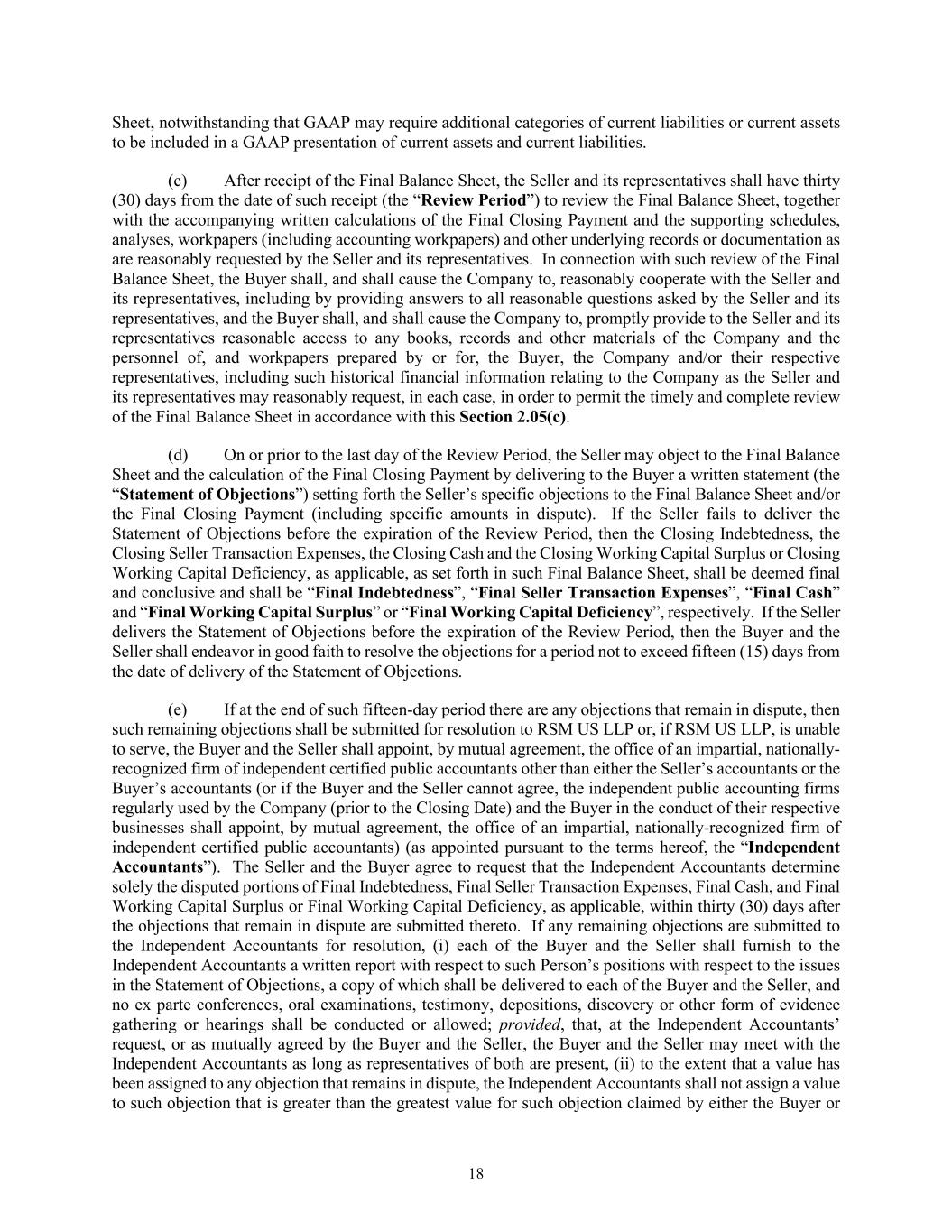 18 Sheet, notwithstanding that GAAP may require additional categories of current liabilities or current assets to be included in a GAAP presentation of current assets and current liabilities. (c) After receipt of the Final Balance Sheet, the Seller and its representatives shall have thirty (30) days from the date of such receipt (the “Review Period”) to review the Final Balance Sheet, together with the accompanying written calculations of the Final Closing Payment and the supporting schedules, analyses, workpapers (including accounting workpapers) and other underlying records or documentation as are reasonably requested by the Seller and its representatives. In connection with such review of the Final Balance Sheet, the Buyer shall, and shall cause the Company to, reasonably cooperate with the Seller and its representatives, including by providing answers to all reasonable questions asked by the Seller and its representatives, and the Buyer shall, and shall cause the Company to, promptly provide to the Seller and its representatives reasonable access to any books, records and other materials of the Company and the personnel of, and workpapers prepared by or for, the Buyer, the Company and/or their respective representatives, including such historical financial information relating to the Company as the Seller and its representatives may reasonably request, in each case, in order to permit the timely and complete review of the Final Balance Sheet in accordance with this Section 2.05(c). (d) On or prior to the last day of the Review Period, the Seller may object to the Final Balance Sheet and the calculation of the Final Closing Payment by delivering to the Buyer a written statement (the “Statement of Objections”) setting forth the Seller’s specific objections to the Final Balance Sheet and/or the Final Closing Payment (including specific amounts in dispute). If the Seller fails to deliver the Statement of Objections before the expiration of the Review Period, then the Closing Indebtedness, the Closing Seller Transaction Expenses, the Closing Cash and the Closing Working Capital Surplus or Closing Working Capital Deficiency, as applicable, as set forth in such Final Balance Sheet, shall be deemed final and conclusive and shall be “Final Indebtedness”, “Final Seller Transaction Expenses”, “Final Cash” and “Final Working Capital Surplus” or “Final Working Capital Deficiency”, respectively. If the Seller delivers the Statement of Objections before the expiration of the Review Period, then the Buyer and the Seller shall endeavor in good faith to resolve the objections for a period not to exceed fifteen (15) days from the date of delivery of the Statement of Objections. (e) If at the end of such fifteen-day period there are any objections that remain in dispute, then such remaining objections shall be submitted for resolution to RSM US LLP or, if RSM US LLP, is unable to serve, the Buyer and the Seller shall appoint, by mutual agreement, the office of an impartial, nationally- recognized firm of independent certified public accountants other than either the Seller’s accountants or the Buyer’s accountants (or if the Buyer and the Seller cannot agree, the independent public accounting firms regularly used by the Company (prior to the Closing Date) and the Buyer in the conduct of their respective businesses shall appoint, by mutual agreement, the office of an impartial, nationally-recognized firm of independent certified public accountants) (as appointed pursuant to the terms hereof, the “Independent Accountants”). The Seller and the Buyer agree to request that the Independent Accountants determine solely the disputed portions of Final Indebtedness, Final Seller Transaction Expenses, Final Cash, and Final Working Capital Surplus or Final Working Capital Deficiency, as applicable, within thirty (30) days after the objections that remain in dispute are submitted thereto. If any remaining objections are submitted to the Independent Accountants for resolution, (i) each of the Buyer and the Seller shall furnish to the Independent Accountants a written report with respect to such Person’s positions with respect to the issues in the Statement of Objections, a copy of which shall be delivered to each of the Buyer and the Seller, and no ex parte conferences, oral examinations, testimony, depositions, discovery or other form of evidence gathering or hearings shall be conducted or allowed; provided, that, at the Independent Accountants’ request, or as mutually agreed by the Buyer and the Seller, the Buyer and the Seller may meet with the Independent Accountants as long as representatives of both are present, (ii) to the extent that a value has been assigned to any objection that remains in dispute, the Independent Accountants shall not assign a value to such objection that is greater than the greatest value for such objection claimed by either the Buyer or