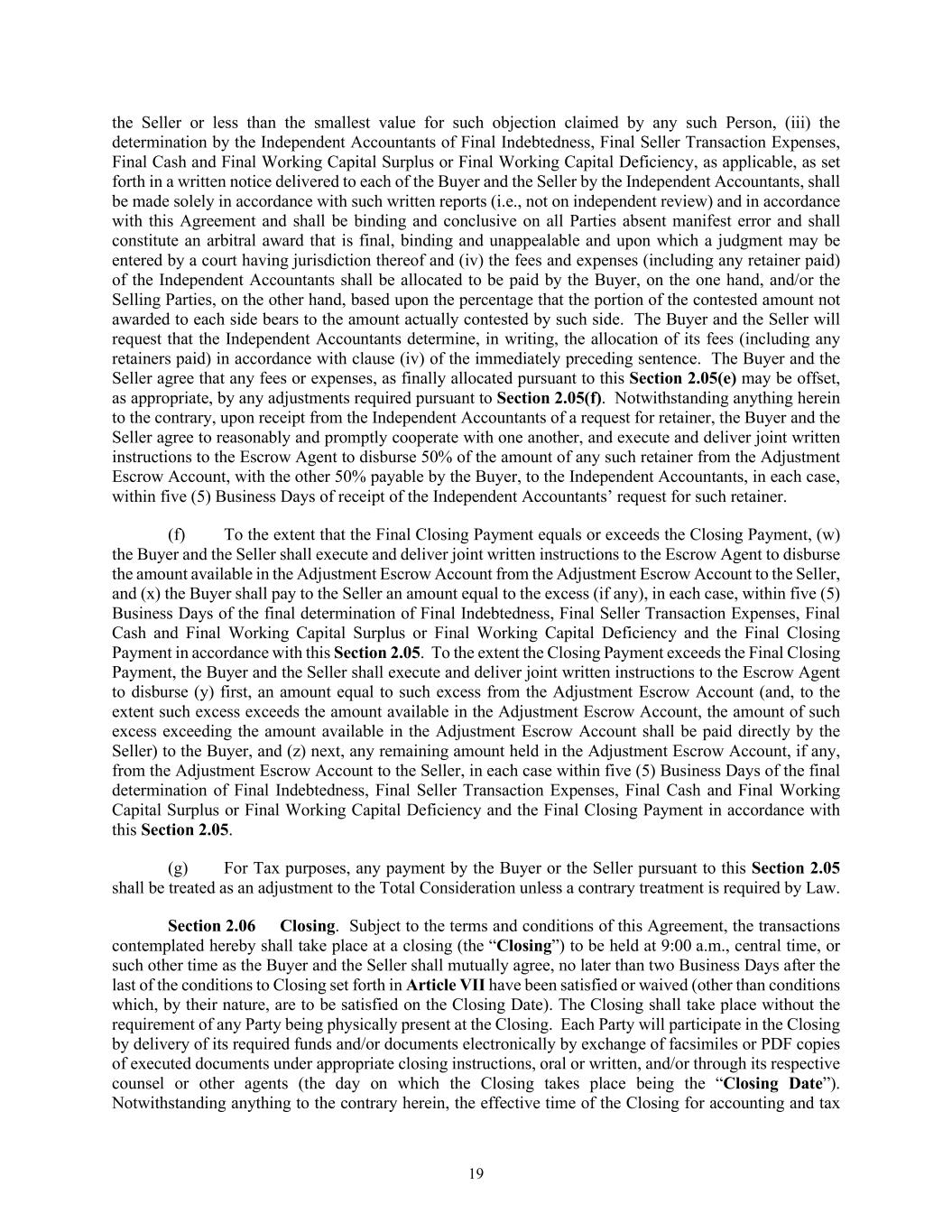 19 the Seller or less than the smallest value for such objection claimed by any such Person, (iii) the determination by the Independent Accountants of Final Indebtedness, Final Seller Transaction Expenses, Final Cash and Final Working Capital Surplus or Final Working Capital Deficiency, as applicable, as set forth in a written notice delivered to each of the Buyer and the Seller by the Independent Accountants, shall be made solely in accordance with such written reports (i.e., not on independent review) and in accordance with this Agreement and shall be binding and conclusive on all Parties absent manifest error and shall constitute an arbitral award that is final, binding and unappealable and upon which a judgment may be entered by a court having jurisdiction thereof and (iv) the fees and expenses (including any retainer paid) of the Independent Accountants shall be allocated to be paid by the Buyer, on the one hand, and/or the Selling Parties, on the other hand, based upon the percentage that the portion of the contested amount not awarded to each side bears to the amount actually contested by such side. The Buyer and the Seller will request that the Independent Accountants determine, in writing, the allocation of its fees (including any retainers paid) in accordance with clause (iv) of the immediately preceding sentence. The Buyer and the Seller agree that any fees or expenses, as finally allocated pursuant to this Section 2.05(e) may be offset, as appropriate, by any adjustments required pursuant to Section 2.05(f). Notwithstanding anything herein to the contrary, upon receipt from the Independent Accountants of a request for retainer, the Buyer and the Seller agree to reasonably and promptly cooperate with one another, and execute and deliver joint written instructions to the Escrow Agent to disburse 50% of the amount of any such retainer from the Adjustment Escrow Account, with the other 50% payable by the Buyer, to the Independent Accountants, in each case, within five (5) Business Days of receipt of the Independent Accountants’ request for such retainer. (f) To the extent that the Final Closing Payment equals or exceeds the Closing Payment, (w) the Buyer and the Seller shall execute and deliver joint written instructions to the Escrow Agent to disburse the amount available in the Adjustment Escrow Account from the Adjustment Escrow Account to the Seller, and (x) the Buyer shall pay to the Seller an amount equal to the excess (if any), in each case, within five (5) Business Days of the final determination of Final Indebtedness, Final Seller Transaction Expenses, Final Cash and Final Working Capital Surplus or Final Working Capital Deficiency and the Final Closing Payment in accordance with this Section 2.05. To the extent the Closing Payment exceeds the Final Closing Payment, the Buyer and the Seller shall execute and deliver joint written instructions to the Escrow Agent to disburse (y) first, an amount equal to such excess from the Adjustment Escrow Account (and, to the extent such excess exceeds the amount available in the Adjustment Escrow Account, the amount of such excess exceeding the amount available in the Adjustment Escrow Account shall be paid directly by the Seller) to the Buyer, and (z) next, any remaining amount held in the Adjustment Escrow Account, if any, from the Adjustment Escrow Account to the Seller, in each case within five (5) Business Days of the final determination of Final Indebtedness, Final Seller Transaction Expenses, Final Cash and Final Working Capital Surplus or Final Working Capital Deficiency and the Final Closing Payment in accordance with this Section 2.05. (g) For Tax purposes, any payment by the Buyer or the Seller pursuant to this Section 2.05 shall be treated as an adjustment to the Total Consideration unless a contrary treatment is required by Law. Section 2.06 Closing. Subject to the terms and conditions of this Agreement, the transactions contemplated hereby shall take place at a closing (the “Closing”) to be held at 9:00 a.m., central time, or such other time as the Buyer and the Seller shall mutually agree, no later than two Business Days after the last of the conditions to Closing set forth in Article VII have been satisfied or waived (other than conditions which, by their nature, are to be satisfied on the Closing Date). The Closing shall take place without the requirement of any Party being physically present at the Closing. Each Party will participate in the Closing by delivery of its required funds and/or documents electronically by exchange of facsimiles or PDF copies of executed documents under appropriate closing instructions, oral or written, and/or through its respective counsel or other agents (the day on which the Closing takes place being the “Closing Date”). Notwithstanding anything to the contrary herein, the effective time of the Closing for accounting and tax