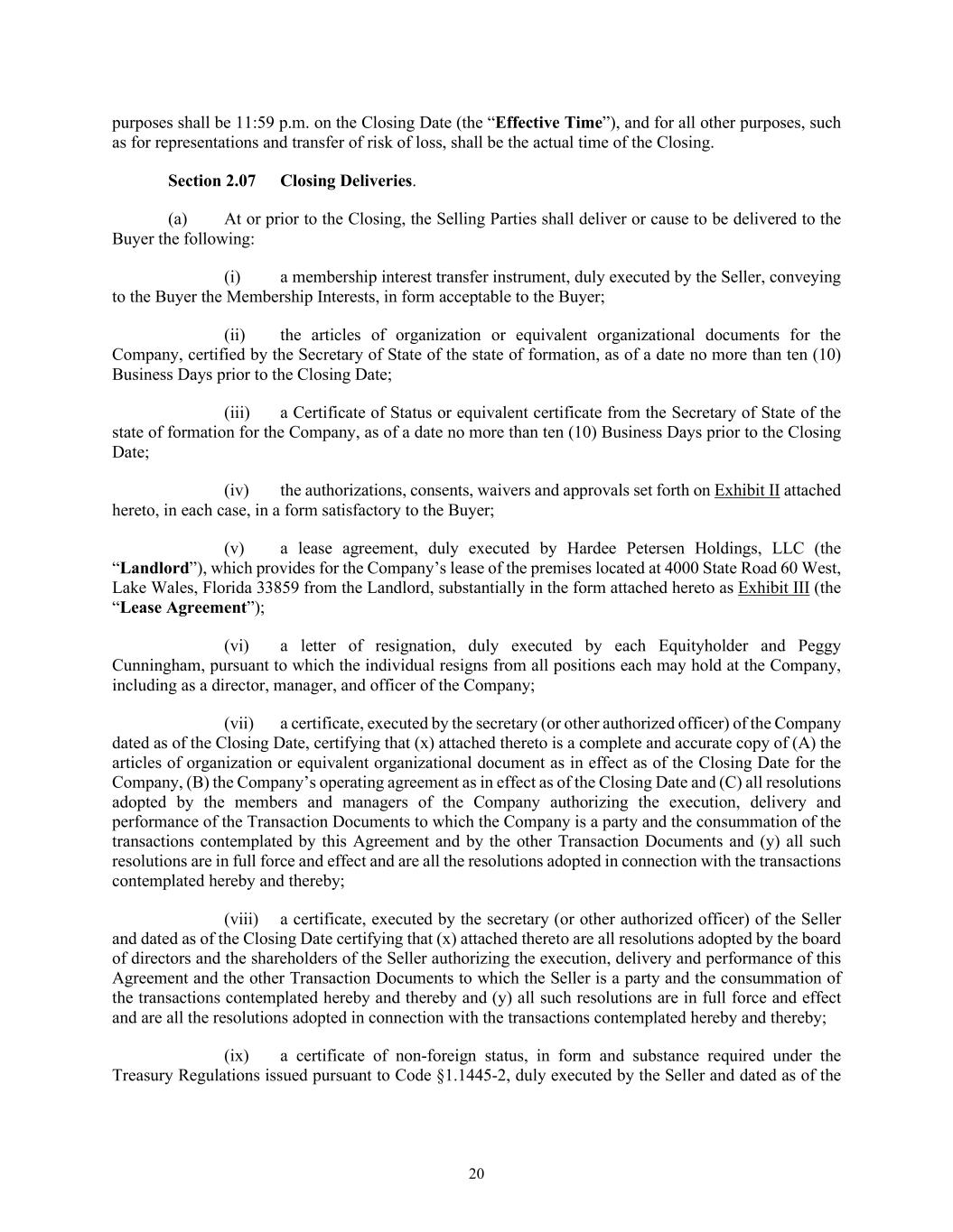 20 purposes shall be 11:59 p.m. on the Closing Date (the “Effective Time”), and for all other purposes, such as for representations and transfer of risk of loss, shall be the actual time of the Closing. Section 2.07 Closing Deliveries. (a) At or prior to the Closing, the Selling Parties shall deliver or cause to be delivered to the Buyer the following: (i) a membership interest transfer instrument, duly executed by the Seller, conveying to the Buyer the Membership Interests, in form acceptable to the Buyer; (ii) the articles of organization or equivalent organizational documents for the Company, certified by the Secretary of State of the state of formation, as of a date no more than ten (10) Business Days prior to the Closing Date; (iii) a Certificate of Status or equivalent certificate from the Secretary of State of the state of formation for the Company, as of a date no more than ten (10) Business Days prior to the Closing Date; (iv) the authorizations, consents, waivers and approvals set forth on Exhibit II attached hereto, in each case, in a form satisfactory to the Buyer; (v) a lease agreement, duly executed by Hardee Petersen Holdings, LLC (the “Landlord”), which provides for the Company’s lease of the premises located at 4000 State Road 60 West, Lake Wales, Florida 33859 from the Landlord, substantially in the form attached hereto as Exhibit III (the “Lease Agreement”); (vi) a letter of resignation, duly executed by each Equityholder and Peggy Cunningham, pursuant to which the individual resigns from all positions each may hold at the Company, including as a director, manager, and officer of the Company; (vii) a certificate, executed by the secretary (or other authorized officer) of the Company dated as of the Closing Date, certifying that (x) attached thereto is a complete and accurate copy of (A) the articles of organization or equivalent organizational document as in effect as of the Closing Date for the Company, (B) the Company’s operating agreement as in effect as of the Closing Date and (C) all resolutions adopted by the members and managers of the Company authorizing the execution, delivery and performance of the Transaction Documents to which the Company is a party and the consummation of the transactions contemplated by this Agreement and by the other Transaction Documents and (y) all such resolutions are in full force and effect and are all the resolutions adopted in connection with the transactions contemplated hereby and thereby; (viii) a certificate, executed by the secretary (or other authorized officer) of the Seller and dated as of the Closing Date certifying that (x) attached thereto are all resolutions adopted by the board of directors and the shareholders of the Seller authorizing the execution, delivery and performance of this Agreement and the other Transaction Documents to which the Seller is a party and the consummation of the transactions contemplated hereby and thereby and (y) all such resolutions are in full force and effect and are all the resolutions adopted in connection with the transactions contemplated hereby and thereby; (ix) a certificate of non-foreign status, in form and substance required under the Treasury Regulations issued pursuant to Code §1.1445-2, duly executed by the Seller and dated as of the