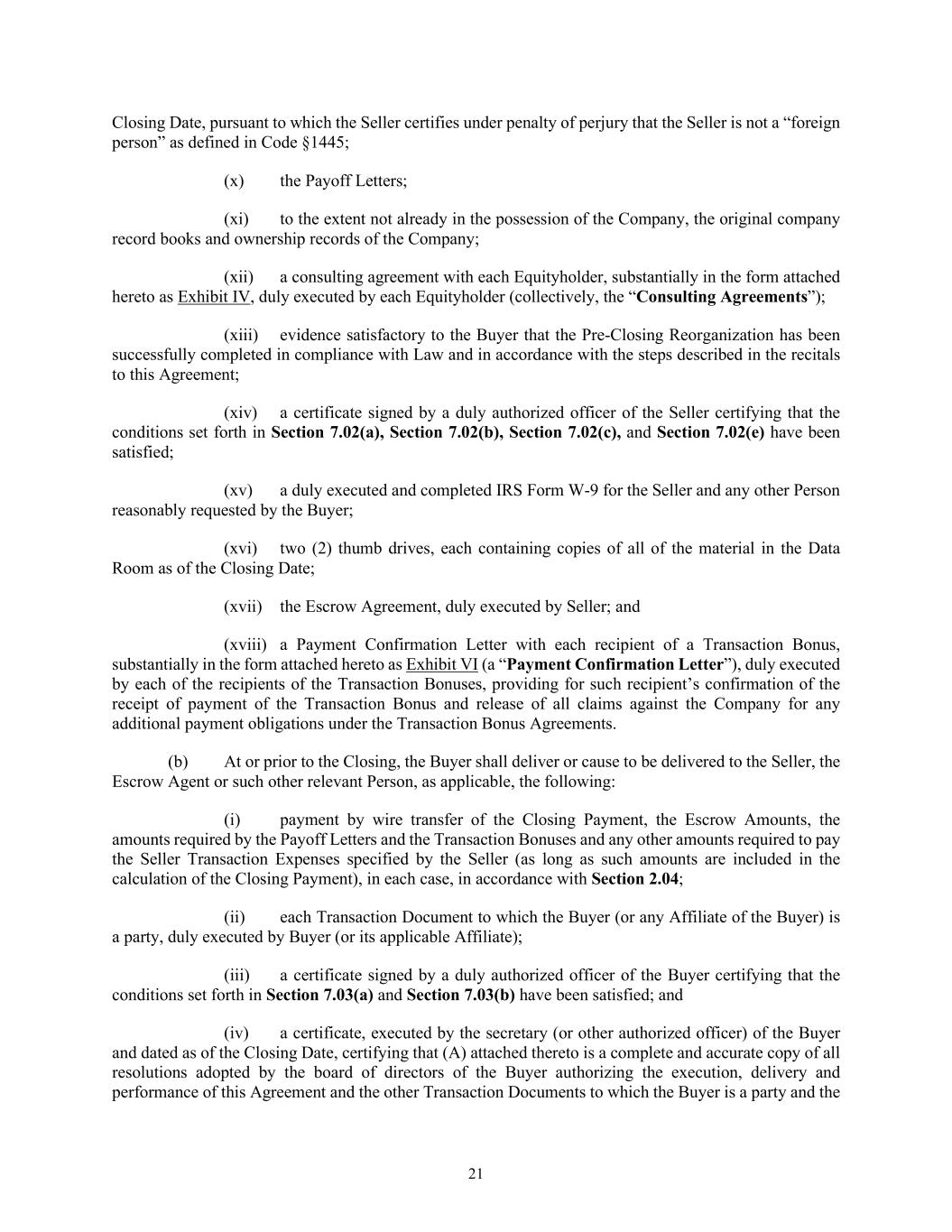 21 Closing Date, pursuant to which the Seller certifies under penalty of perjury that the Seller is not a “foreign person” as defined in Code §1445; (x) the Payoff Letters; (xi) to the extent not already in the possession of the Company, the original company record books and ownership records of the Company; (xii) a consulting agreement with each Equityholder, substantially in the form attached hereto as Exhibit IV, duly executed by each Equityholder (collectively, the “Consulting Agreements”); (xiii) evidence satisfactory to the Buyer that the Pre-Closing Reorganization has been successfully completed in compliance with Law and in accordance with the steps described in the recitals to this Agreement; (xiv) a certificate signed by a duly authorized officer of the Seller certifying that the conditions set forth in Section 7.02(a), Section 7.02(b), Section 7.02(c), and Section 7.02(e) have been satisfied; (xv) a duly executed and completed IRS Form W-9 for the Seller and any other Person reasonably requested by the Buyer; (xvi) two (2) thumb drives, each containing copies of all of the material in the Data Room as of the Closing Date; (xvii) the Escrow Agreement, duly executed by Seller; and (xviii) a Payment Confirmation Letter with each recipient of a Transaction Bonus, substantially in the form attached hereto as Exhibit VI (a “Payment Confirmation Letter”), duly executed by each of the recipients of the Transaction Bonuses, providing for such recipient’s confirmation of the receipt of payment of the Transaction Bonus and release of all claims against the Company for any additional payment obligations under the Transaction Bonus Agreements. (b) At or prior to the Closing, the Buyer shall deliver or cause to be delivered to the Seller, the Escrow Agent or such other relevant Person, as applicable, the following: (i) payment by wire transfer of the Closing Payment, the Escrow Amounts, the amounts required by the Payoff Letters and the Transaction Bonuses and any other amounts required to pay the Seller Transaction Expenses specified by the Seller (as long as such amounts are included in the calculation of the Closing Payment), in each case, in accordance with Section 2.04; (ii) each Transaction Document to which the Buyer (or any Affiliate of the Buyer) is a party, duly executed by Buyer (or its applicable Affiliate); (iii) a certificate signed by a duly authorized officer of the Buyer certifying that the conditions set forth in Section 7.03(a) and Section 7.03(b) have been satisfied; and (iv) a certificate, executed by the secretary (or other authorized officer) of the Buyer and dated as of the Closing Date, certifying that (A) attached thereto is a complete and accurate copy of all resolutions adopted by the board of directors of the Buyer authorizing the execution, delivery and performance of this Agreement and the other Transaction Documents to which the Buyer is a party and the