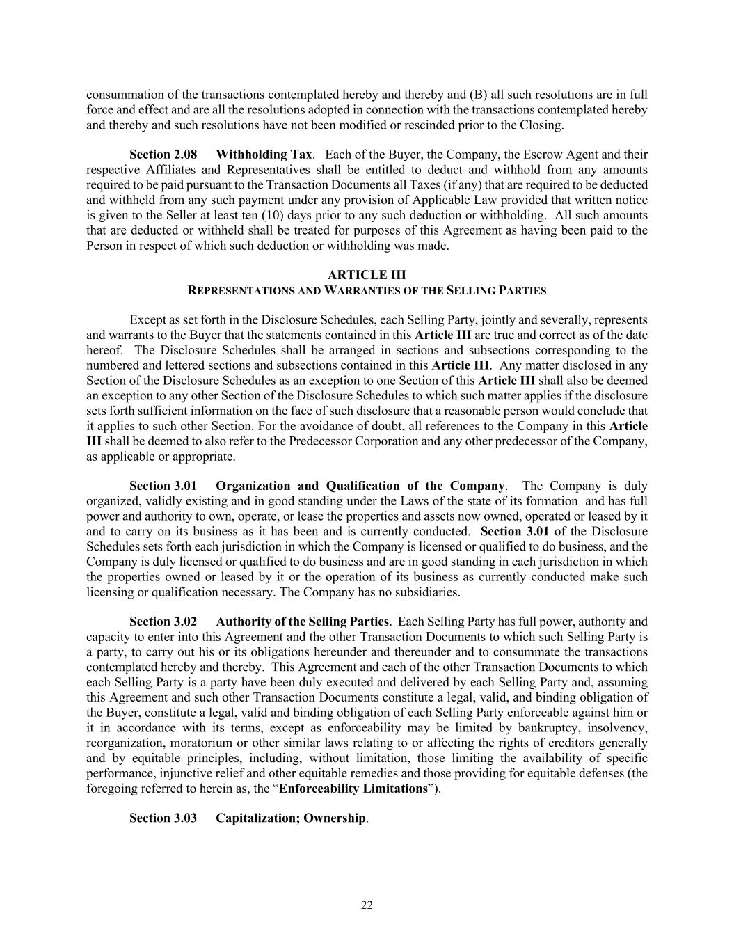 22 consummation of the transactions contemplated hereby and thereby and (B) all such resolutions are in full force and effect and are all the resolutions adopted in connection with the transactions contemplated hereby and thereby and such resolutions have not been modified or rescinded prior to the Closing. Section 2.08 Withholding Tax. Each of the Buyer, the Company, the Escrow Agent and their respective Affiliates and Representatives shall be entitled to deduct and withhold from any amounts required to be paid pursuant to the Transaction Documents all Taxes (if any) that are required to be deducted and withheld from any such payment under any provision of Applicable Law provided that written notice is given to the Seller at least ten (10) days prior to any such deduction or withholding. All such amounts that are deducted or withheld shall be treated for purposes of this Agreement as having been paid to the Person in respect of which such deduction or withholding was made. ARTICLE III REPRESENTATIONS AND WARRANTIES OF THE SELLING PARTIES Except as set forth in the Disclosure Schedules, each Selling Party, jointly and severally, represents and warrants to the Buyer that the statements contained in this Article III are true and correct as of the date hereof. The Disclosure Schedules shall be arranged in sections and subsections corresponding to the numbered and lettered sections and subsections contained in this Article III. Any matter disclosed in any Section of the Disclosure Schedules as an exception to one Section of this Article III shall also be deemed an exception to any other Section of the Disclosure Schedules to which such matter applies if the disclosure sets forth sufficient information on the face of such disclosure that a reasonable person would conclude that it applies to such other Section. For the avoidance of doubt, all references to the Company in this Article III shall be deemed to also refer to the Predecessor Corporation and any other predecessor of the Company, as applicable or appropriate. Section 3.01 Organization and Qualification of the Company. The Company is duly organized, validly existing and in good standing under the Laws of the state of its formation and has full power and authority to own, operate, or lease the properties and assets now owned, operated or leased by it and to carry on its business as it has been and is currently conducted. Section 3.01 of the Disclosure Schedules sets forth each jurisdiction in which the Company is licensed or qualified to do business, and the Company is duly licensed or qualified to do business and are in good standing in each jurisdiction in which the properties owned or leased by it or the operation of its business as currently conducted make such licensing or qualification necessary. The Company has no subsidiaries. Section 3.02 Authority of the Selling Parties. Each Selling Party has full power, authority and capacity to enter into this Agreement and the other Transaction Documents to which such Selling Party is a party, to carry out his or its obligations hereunder and thereunder and to consummate the transactions contemplated hereby and thereby. This Agreement and each of the other Transaction Documents to which each Selling Party is a party have been duly executed and delivered by each Selling Party and, assuming this Agreement and such other Transaction Documents constitute a legal, valid, and binding obligation of the Buyer, constitute a legal, valid and binding obligation of each Selling Party enforceable against him or it in accordance with its terms, except as enforceability may be limited by bankruptcy, insolvency, reorganization, moratorium or other similar laws relating to or affecting the rights of creditors generally and by equitable principles, including, without limitation, those limiting the availability of specific performance, injunctive relief and other equitable remedies and those providing for equitable defenses (the foregoing referred to herein as, the “Enforceability Limitations”). Section 3.03 Capitalization; Ownership.