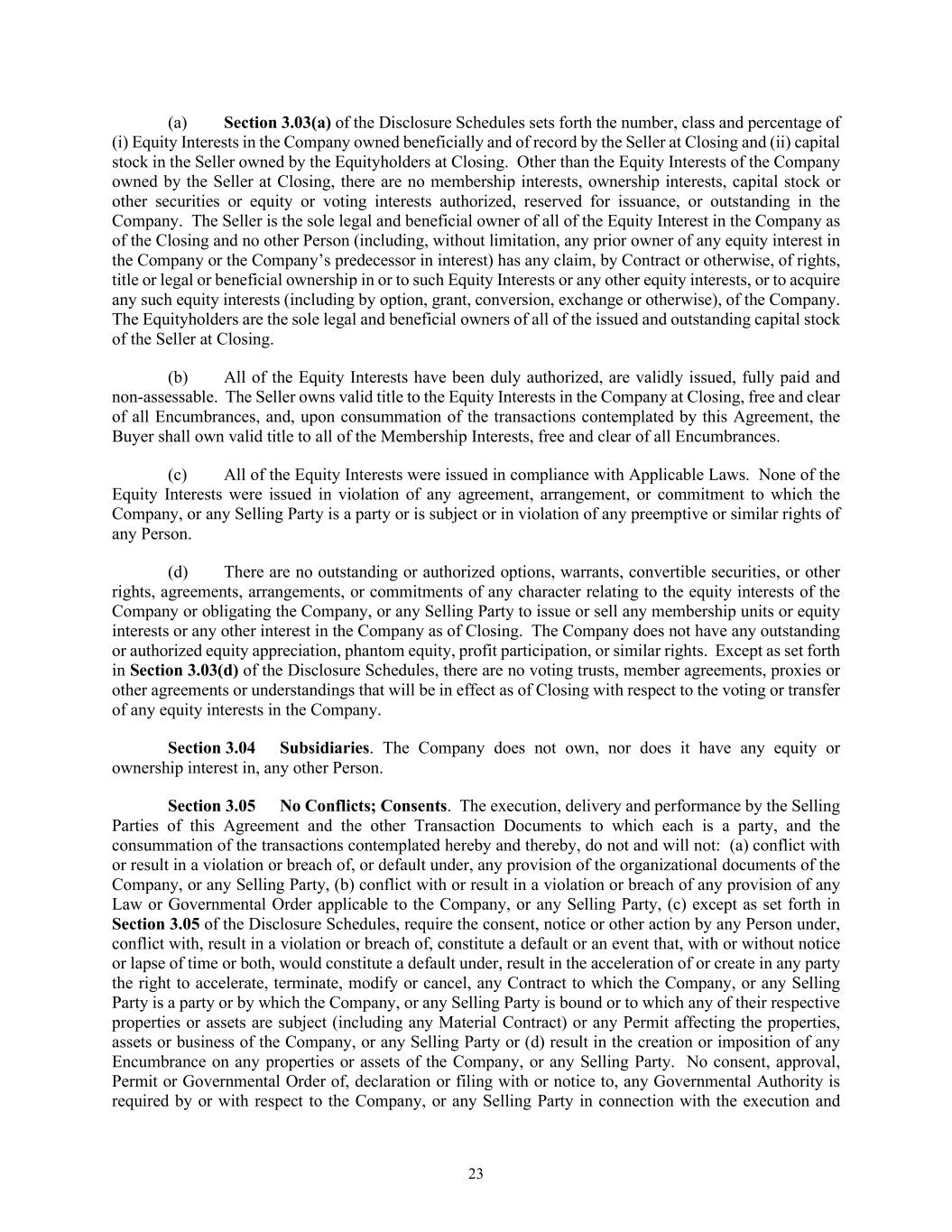 23 (a) Section 3.03(a) of the Disclosure Schedules sets forth the number, class and percentage of (i) Equity Interests in the Company owned beneficially and of record by the Seller at Closing and (ii) capital stock in the Seller owned by the Equityholders at Closing. Other than the Equity Interests of the Company owned by the Seller at Closing, there are no membership interests, ownership interests, capital stock or other securities or equity or voting interests authorized, reserved for issuance, or outstanding in the Company. The Seller is the sole legal and beneficial owner of all of the Equity Interest in the Company as of the Closing and no other Person (including, without limitation, any prior owner of any equity interest in the Company or the Company’s predecessor in interest) has any claim, by Contract or otherwise, of rights, title or legal or beneficial ownership in or to such Equity Interests or any other equity interests, or to acquire any such equity interests (including by option, grant, conversion, exchange or otherwise), of the Company. The Equityholders are the sole legal and beneficial owners of all of the issued and outstanding capital stock of the Seller at Closing. (b) All of the Equity Interests have been duly authorized, are validly issued, fully paid and non-assessable. The Seller owns valid title to the Equity Interests in the Company at Closing, free and clear of all Encumbrances, and, upon consummation of the transactions contemplated by this Agreement, the Buyer shall own valid title to all of the Membership Interests, free and clear of all Encumbrances. (c) All of the Equity Interests were issued in compliance with Applicable Laws. None of the Equity Interests were issued in violation of any agreement, arrangement, or commitment to which the Company, or any Selling Party is a party or is subject or in violation of any preemptive or similar rights of any Person. (d) There are no outstanding or authorized options, warrants, convertible securities, or other rights, agreements, arrangements, or commitments of any character relating to the equity interests of the Company or obligating the Company, or any Selling Party to issue or sell any membership units or equity interests or any other interest in the Company as of Closing. The Company does not have any outstanding or authorized equity appreciation, phantom equity, profit participation, or similar rights. Except as set forth in Section 3.03(d) of the Disclosure Schedules, there are no voting trusts, member agreements, proxies or other agreements or understandings that will be in effect as of Closing with respect to the voting or transfer of any equity interests in the Company. Section 3.04 Subsidiaries. The Company does not own, nor does it have any equity or ownership interest in, any other Person. Section 3.05 No Conflicts; Consents. The execution, delivery and performance by the Selling Parties of this Agreement and the other Transaction Documents to which each is a party, and the consummation of the transactions contemplated hereby and thereby, do not and will not: (a) conflict with or result in a violation or breach of, or default under, any provision of the organizational documents of the Company, or any Selling Party, (b) conflict with or result in a violation or breach of any provision of any Law or Governmental Order applicable to the Company, or any Selling Party, (c) except as set forth in Section 3.05 of the Disclosure Schedules, require the consent, notice or other action by any Person under, conflict with, result in a violation or breach of, constitute a default or an event that, with or without notice or lapse of time or both, would constitute a default under, result in the acceleration of or create in any party the right to accelerate, terminate, modify or cancel, any Contract to which the Company, or any Selling Party is a party or by which the Company, or any Selling Party is bound or to which any of their respective properties or assets are subject (including any Material Contract) or any Permit affecting the properties, assets or business of the Company, or any Selling Party or (d) result in the creation or imposition of any Encumbrance on any properties or assets of the Company, or any Selling Party. No consent, approval, Permit or Governmental Order of, declaration or filing with or notice to, any Governmental Authority is required by or with respect to the Company, or any Selling Party in connection with the execution and