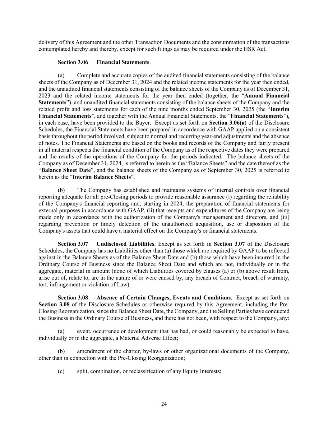 24 delivery of this Agreement and the other Transaction Documents and the consummation of the transactions contemplated hereby and thereby, except for such filings as may be required under the HSR Act. Section 3.06 Financial Statements. (a) Complete and accurate copies of the audited financial statements consisting of the balance sheets of the Company as of December 31, 2024 and the related income statements for the year then ended, and the unaudited financial statements consisting of the balance sheets of the Company as of December 31, 2023 and the related income statements for the year then ended (together, the “Annual Financial Statements”), and unaudited financial statements consisting of the balance sheets of the Company and the related profit and loss statements for each of the nine months ended September 30, 2025 (the “Interim Financial Statements”, and together with the Annual Financial Statements, the “Financial Statements”), in each case, have been provided to the Buyer. Except as set forth on Section 3.06(a) of the Disclosure Schedules, the Financial Statements have been prepared in accordance with GAAP applied on a consistent basis throughout the period involved, subject to normal and recurring year-end adjustments and the absence of notes. The Financial Statements are based on the books and records of the Company and fairly present in all material respects the financial condition of the Company as of the respective dates they were prepared and the results of the operations of the Company for the periods indicated. The balance sheets of the Company as of December 31, 2024, is referred to herein as the “Balance Sheets” and the date thereof as the “Balance Sheet Date”, and the balance sheets of the Company as of September 30, 2025 is referred to herein as the “Interim Balance Sheets”. (b) The Company has established and maintains systems of internal controls over financial reporting adequate for all pre-Closing periods to provide reasonable assurance (i) regarding the reliability of the Company's financial reporting and, starting in 2024, the preparation of financial statements for external purposes in accordance with GAAP, (ii) that receipts and expenditures of the Company are being made only in accordance with the authorization of the Company's management and directors, and (iii) regarding prevention or timely detection of the unauthorized acquisition, use or disposition of the Company's assets that could have a material effect on the Company's or financial statements. Section 3.07 Undisclosed Liabilities. Except as set forth in Section 3.07 of the Disclosure Schedules, the Company has no Liabilities other than (a) those which are required by GAAP to be reflected against in the Balance Sheets as of the Balance Sheet Date and (b) those which have been incurred in the Ordinary Course of Business since the Balance Sheet Date and which are not, individually or in the aggregate, material in amount (none of which Liabilities covered by clauses (a) or (b) above result from, arise out of, relate to, are in the nature of or were caused by, any breach of Contract, breach of warranty, tort, infringement or violation of Law). Section 3.08 Absence of Certain Changes, Events and Conditions. Except as set forth on Section 3.08 of the Disclosure Schedules or otherwise required by this Agreement, including the Pre- Closing Reorganization, since the Balance Sheet Date, the Company, and the Selling Parties have conducted the Business in the Ordinary Course of Business, and there has not been, with respect to the Company, any: (a) event, occurrence or development that has had, or could reasonably be expected to have, individually or in the aggregate, a Material Adverse Effect; (b) amendment of the charter, by-laws or other organizational documents of the Company, other than in connection with the Pre-Closing Reorganization; (c) split, combination, or reclassification of any Equity Interests;